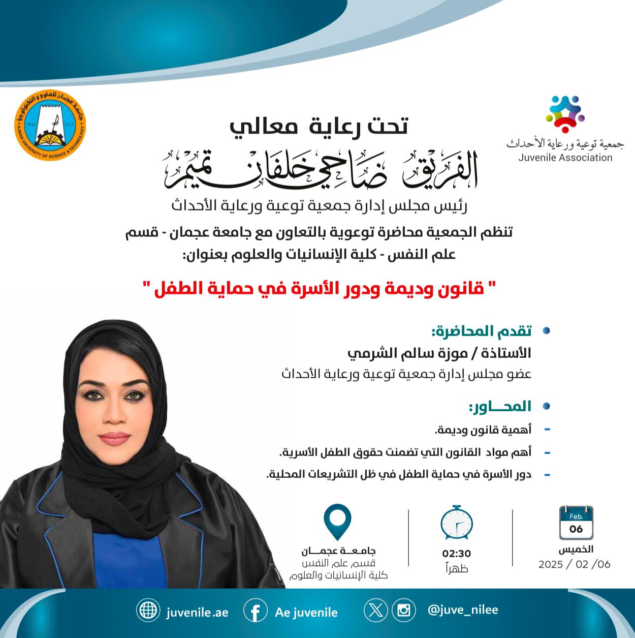 نظم قسم علم النفس بكلية الانسانيات والعلوم وبالتعاون مع جمعية توعية ورعاية الأحداث وتحت رعاية معالي الفريق ضاحي خلفان تميم رئيس مجلس إدارة الجمعية.. محاضرة توعوية بعنوان " قانون وديمة ودور الأسرة في حماية الطفل" لنحو 70 طالب وطالبة من تخصص علم النفس. كما شارك بالحضور وفي التنظيم كلا من د. احمد الزعبي والدكتور مرعي احمد اعضاء هيئة التدريس بالقسم