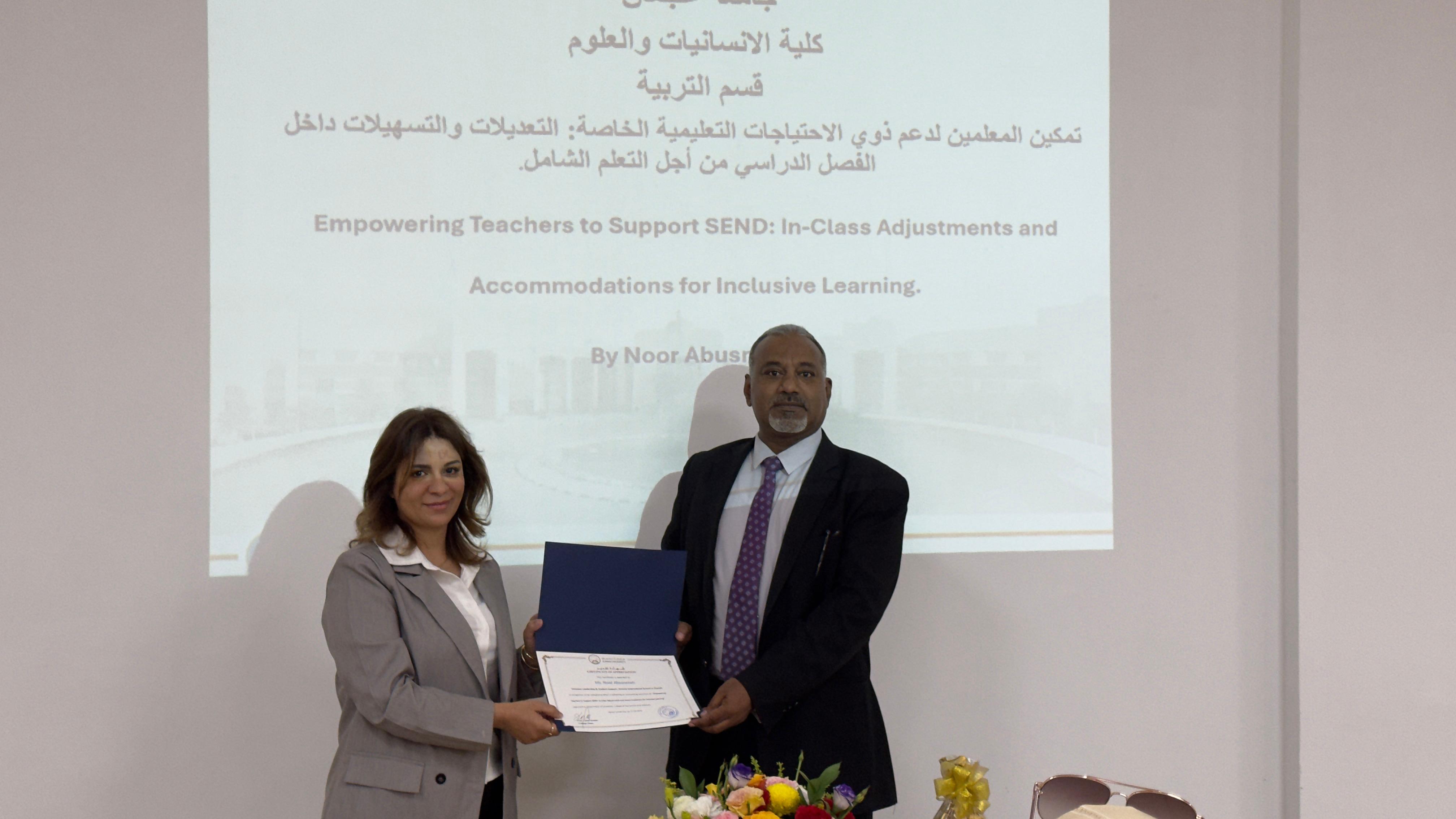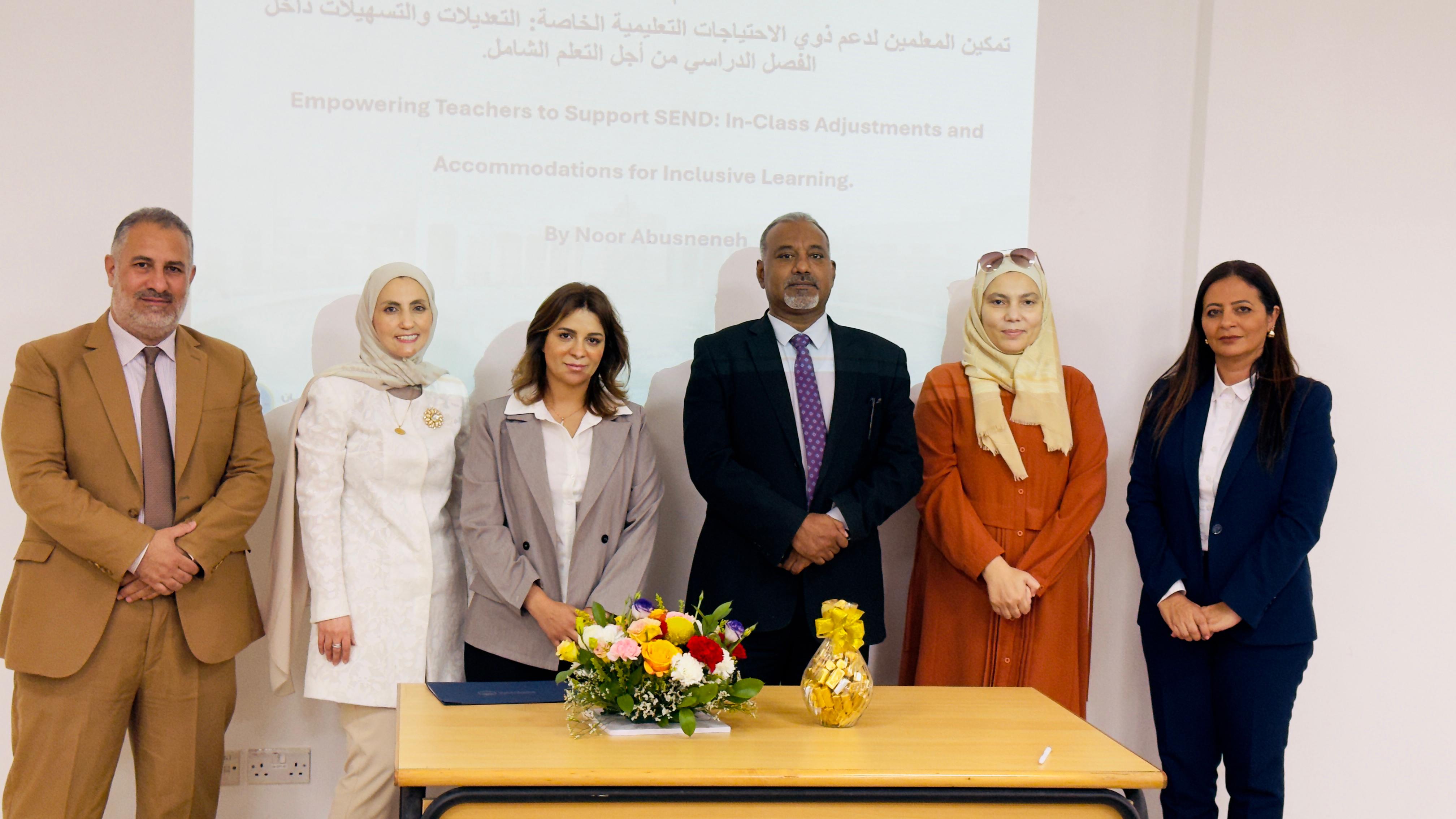 ضمن الجهود المستمرة لتعزيز التعليم الشامل وتحسين جودة التعليم ، استضاف قسم التربية في جامعة عجمان ورشة عمل تحت شعار "تمكين المعلمين لدعم الطلاب ذوي الاحتياجات التعليمية الخاصة: التعديلات والتيسيرات الصفية للتعليم الشامل". قام بتقديم هذه الورشة الأستاذة نور أبو سنينة، المتخصصة في التعليم الشامل ودعم التعلم.