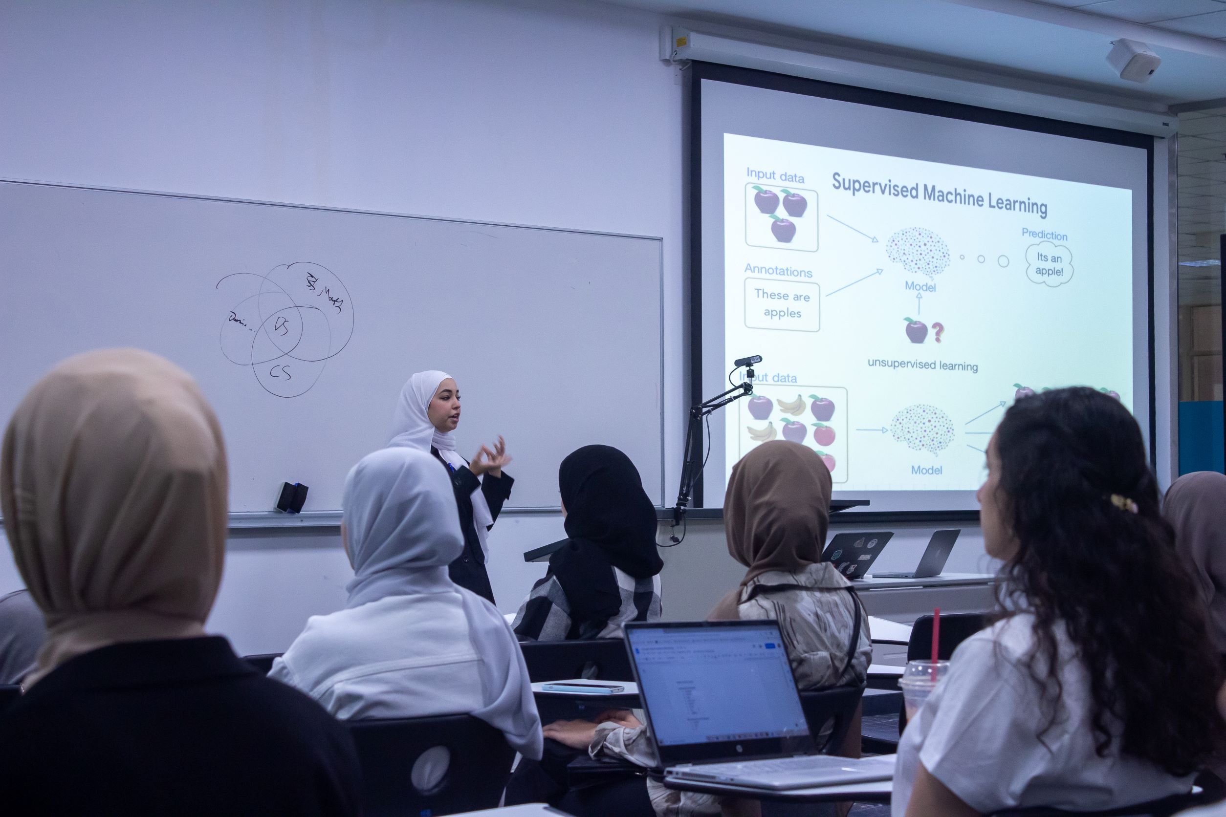 وبدء الطلبة بالجزء العملي، وتعرفوا على برنامج "Google Colab" لتنفيذ المنهجيات والمبادئ المستندة إلى Python لجلب وفهم البيانات، وتنظيف البيانات وتصور البيانات الضرورية لدورة حياة علوم البيانات.