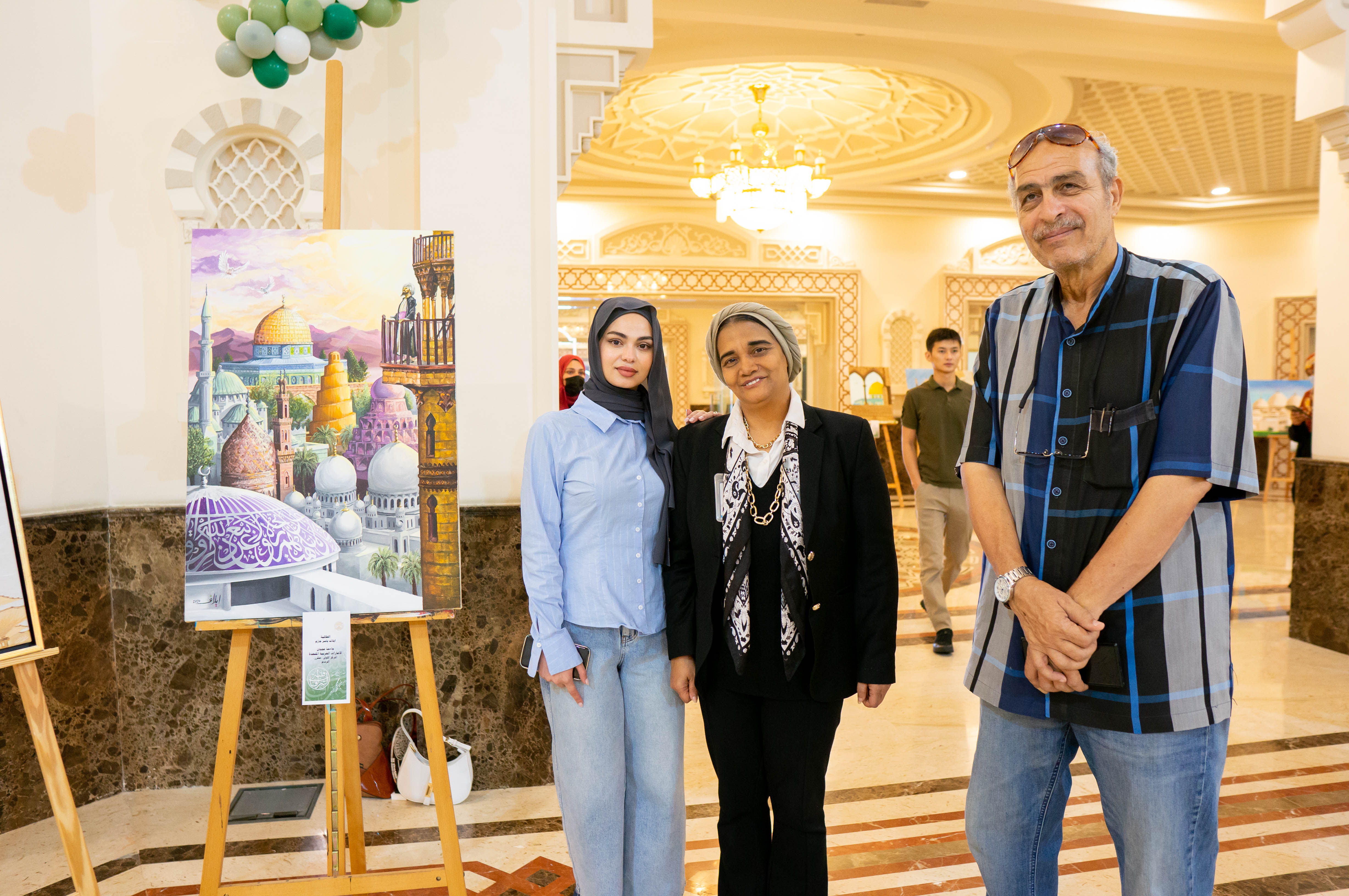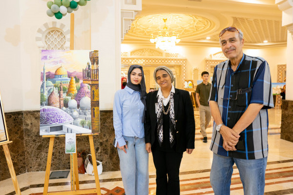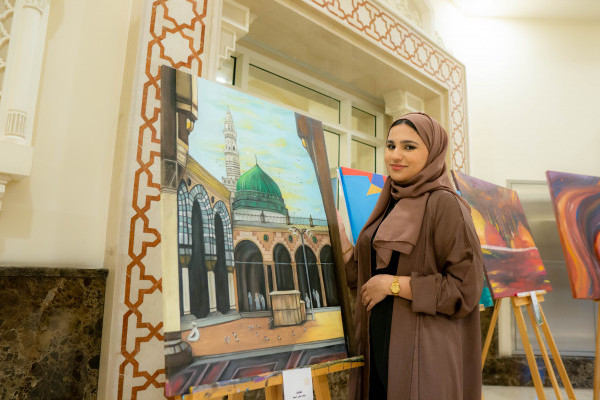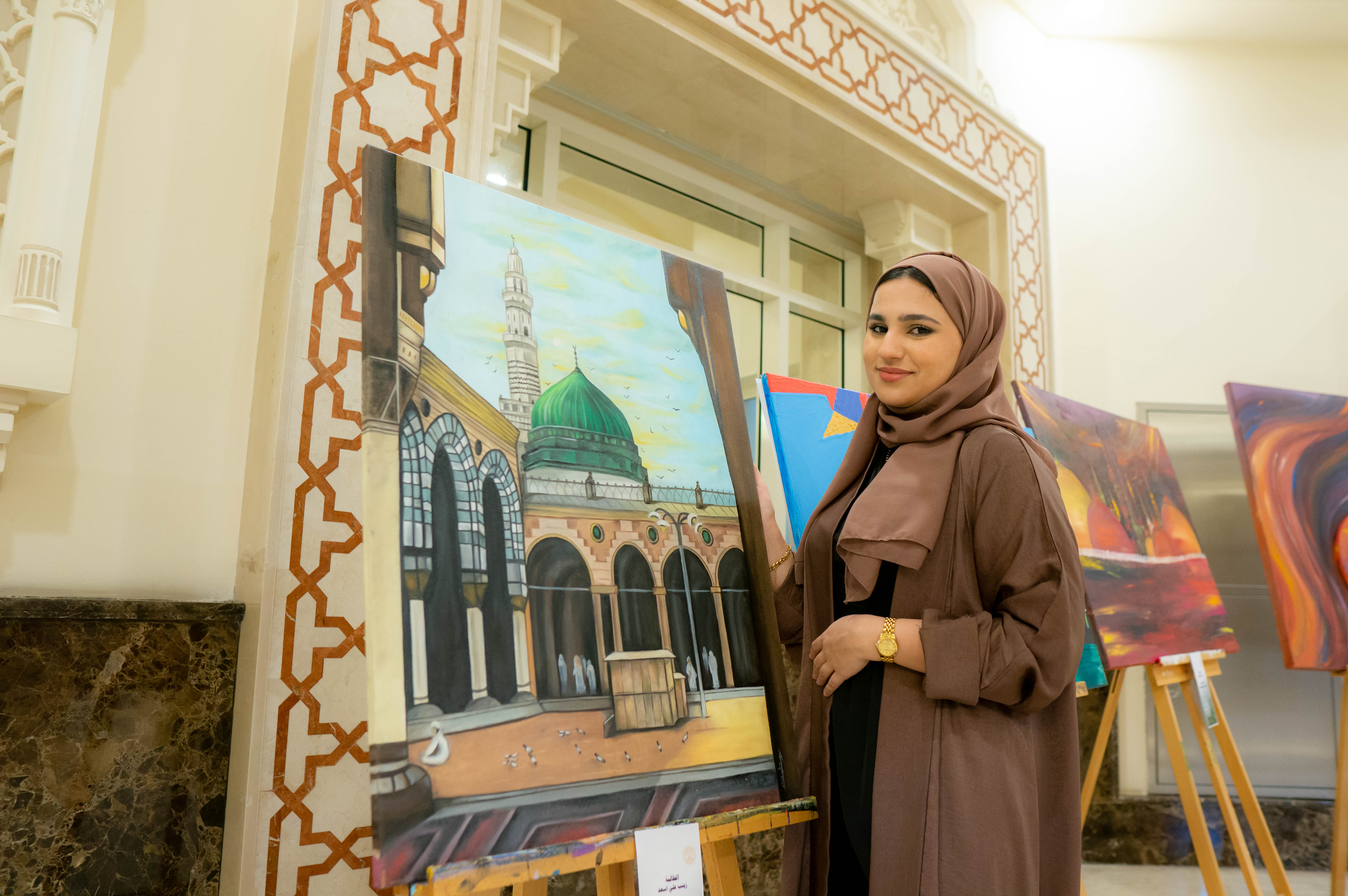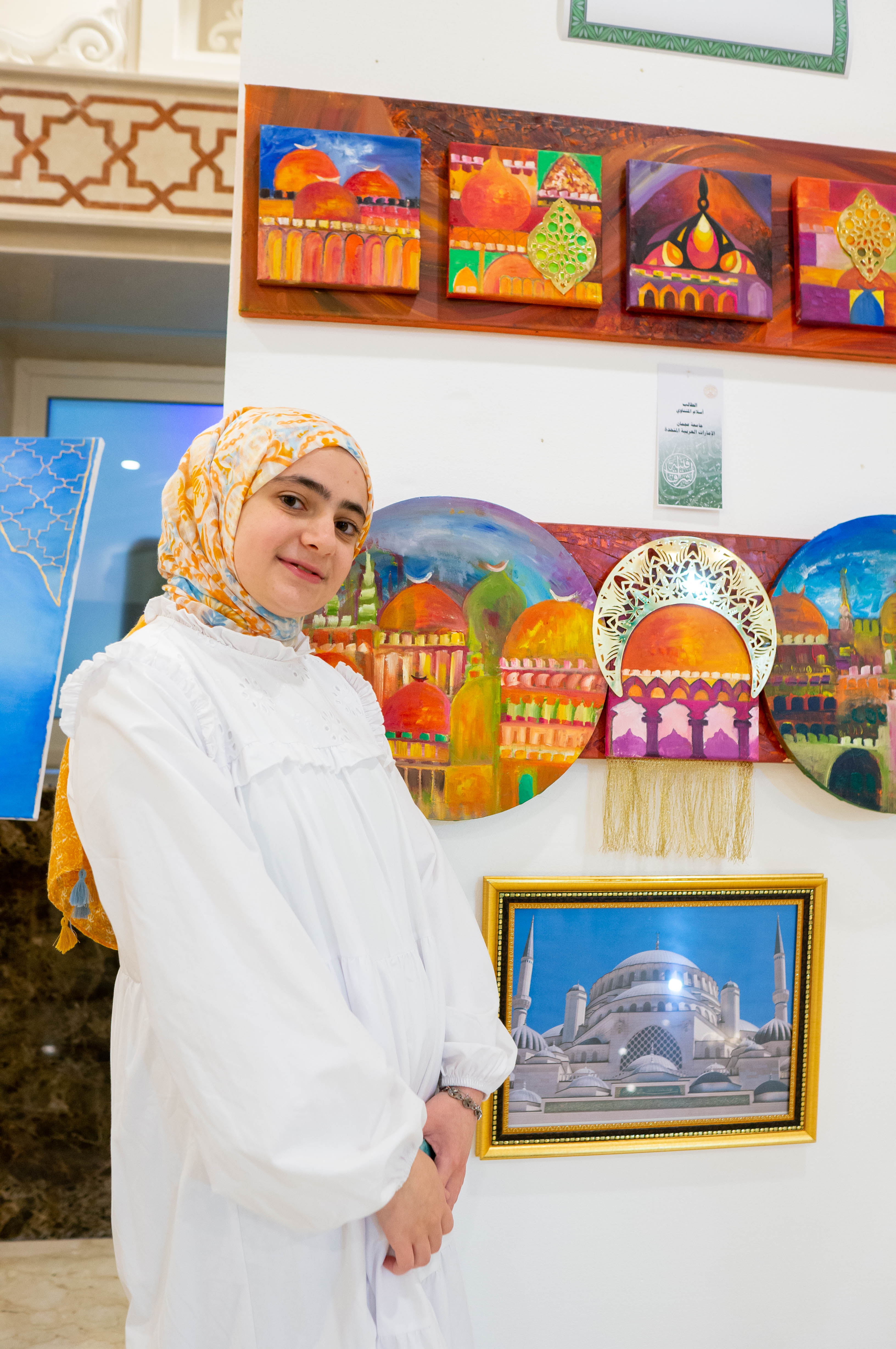 وقدمت الطالبة إيلاف عملاً فنياً مميزاً يتمثل في تجسيد قباب المساجد والمآذن بأسلوب فني فريد، حيث استخدمت الأكريليك في إبراز أشكالها وألوانها المتنوعة والزاهية، مما أضفى على عملها الفني جاذبية ورونقاً فنياً لافتاً، إضافةً الى انه عكس مهاراتها وقدرتها على التعبير الإبداعي بطريقة مميزة ومبتكرة.