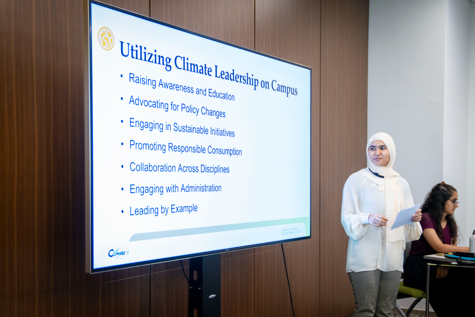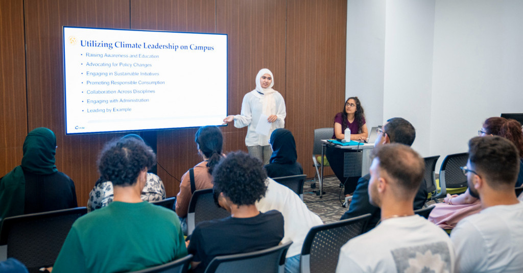 وتم خلال المحور الثاني مناقشة "القيادة المناخية" وإبراز الدور الحيوي الذي يمكن للطلبة اتباعه لدعم جهود الدولة في مكافحة تغير المناخ مثل تحفيزهم على الابداع والابتكار من خلال تطوير تقنيات ومبادرات جديدة.