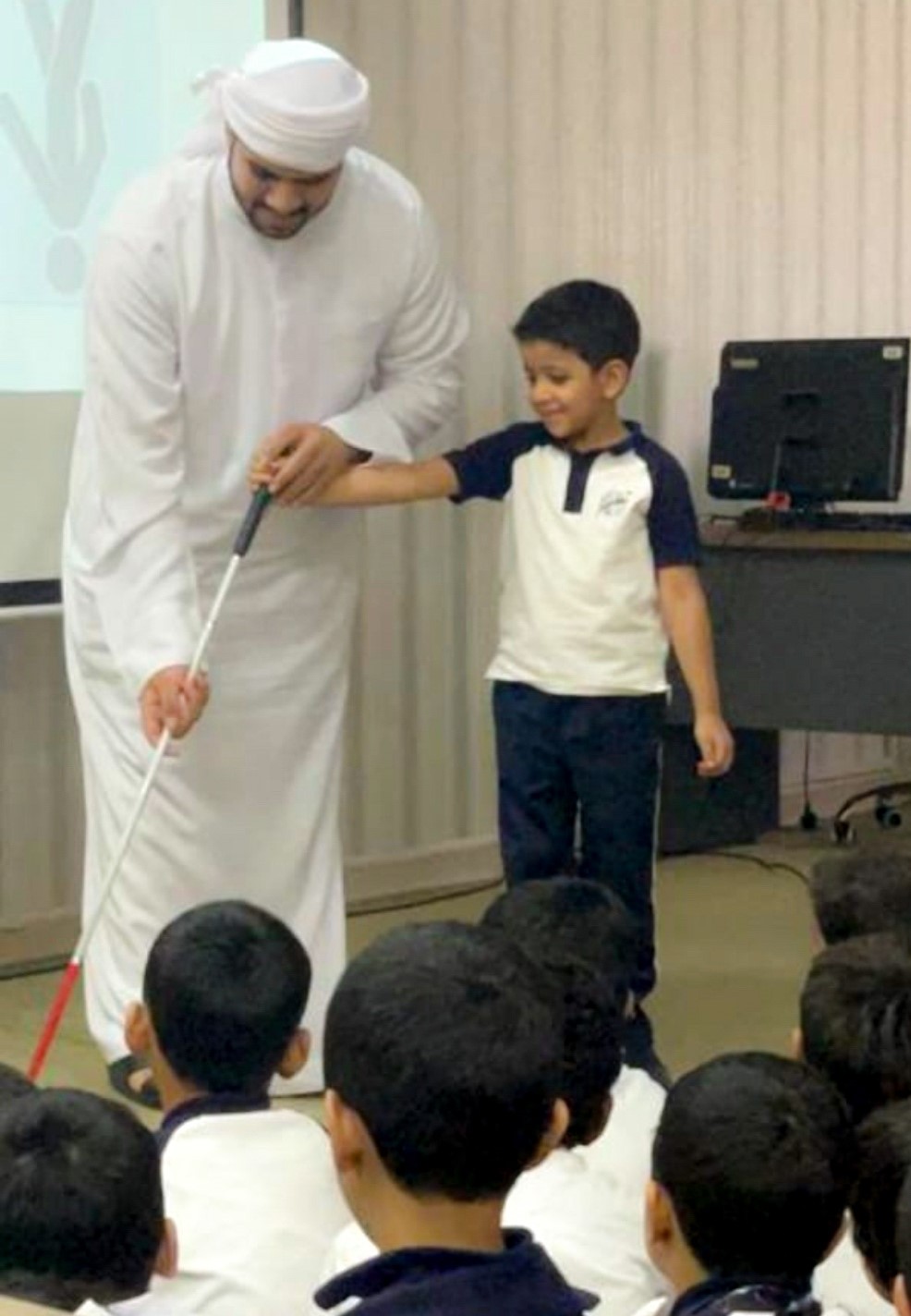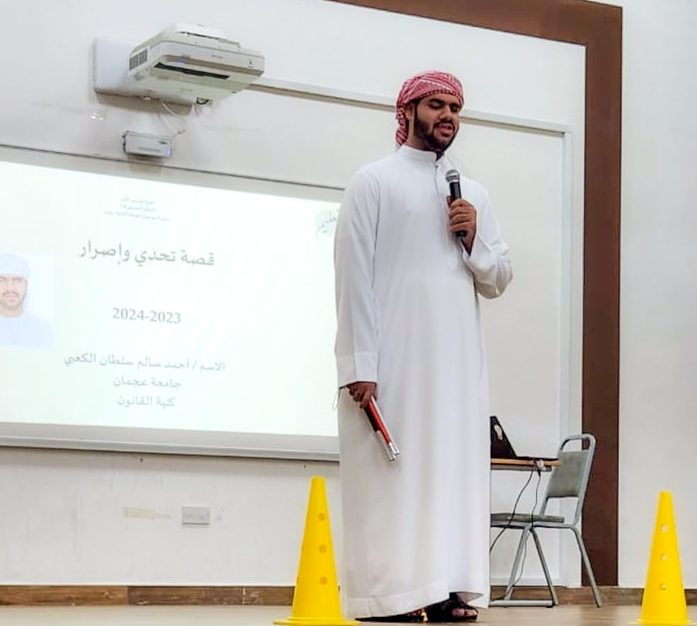 شارك الطالب أحمد الكعبي من كلية القانون بجامعة عجمان بفعاليات "اليوم العالمي للعصا البيضاء" والذي يصاف 15 أكتوبر من كل عام، يهدف هذا اليوم إلى زيادة الوعي حول قضايا المكفوفين وضعاف البصر و التأكيد على حقوقهم. و تم اختيار أحمد ليكون سفيراً لأربع مدراس حكومية هي: مدرسة المنيعي الحلقة الأولى والثانية والثالثة بنات و روضة مصفوت و مدرسة مصفوت الحلقة الثانية و مدرسة حتا 2 الحلقة الأولى، وقد قام أحمد بتقديم ورشة عمل عن ماهية العصا البيضاء وأهميتها و ذلك بحضور مجموعة من المعلمين و طلبة المدارس ليسرد قصة إصراره ونجاحه الملهمة خلال جولاته في المدارس.