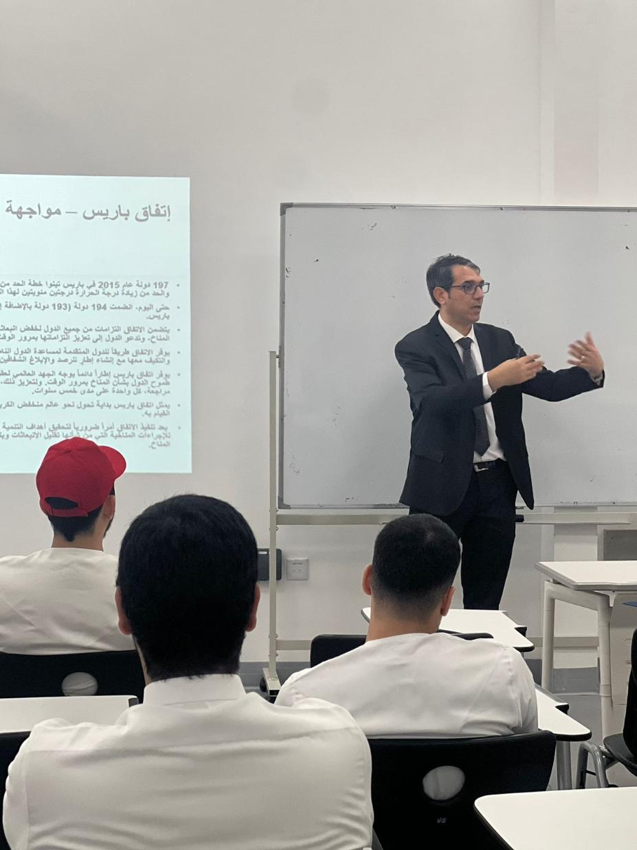 تناول الجوهري خلال المحاضرة تحديات التغير المناخي والتقلبات المناخية وتأثيرها على البيئة والمجتمع. بالإضافة إلى ذلك، ناقش اتفاقية باريس واتفاقية الأمم المتحدة الإطارية بشأن التغيُّر المناخي، مشيراً إلى دورها الرئيسي في تعزيز التعاون الدولي وتطوير استراتيجيات مشتركة لمواجهة تأثيرات التغير المناخي.