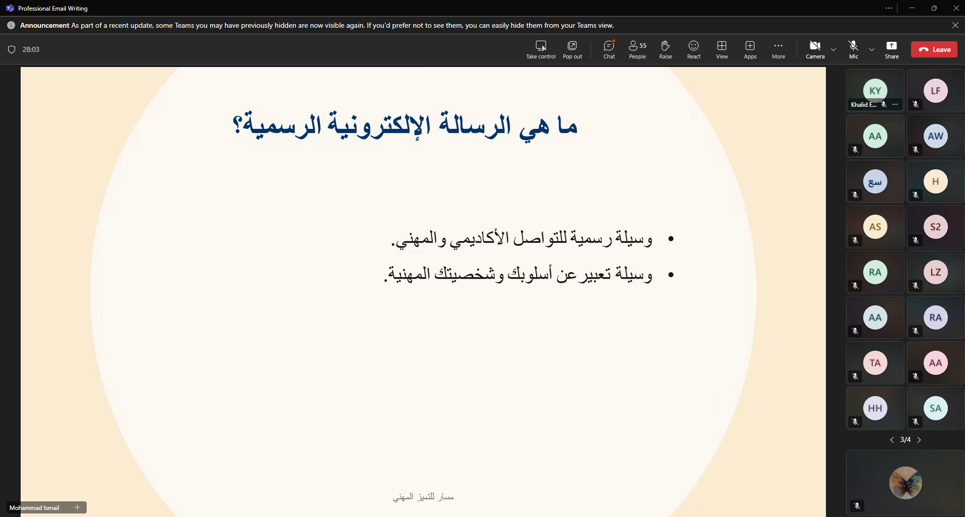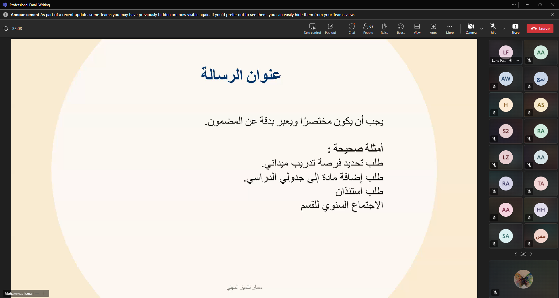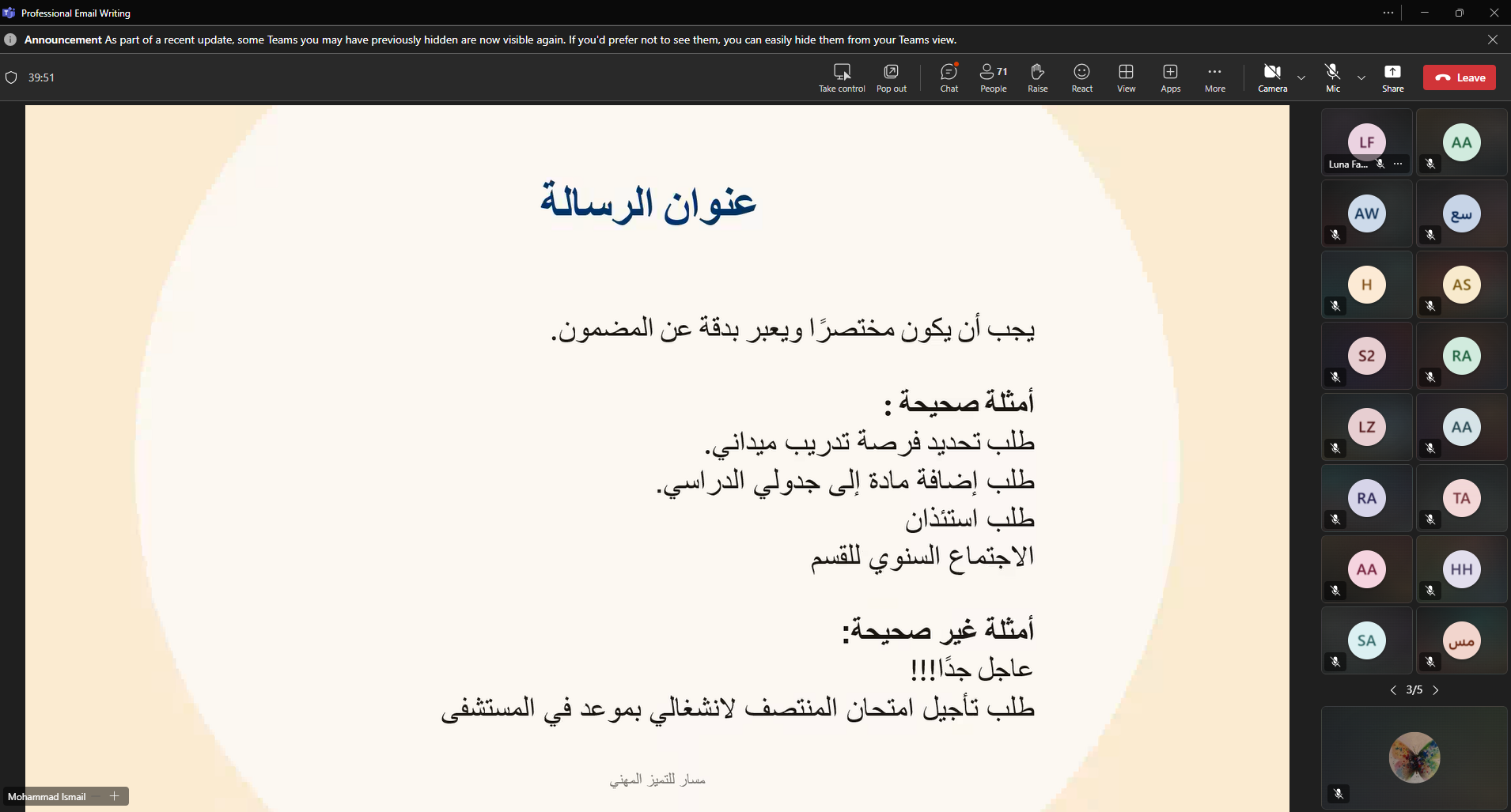 في إطار حرص كلية القانون بجامعة عجمان على تنمية مهارات التواصل المهني لدى الطلبة، وبالتعاون مع مكتب مسار للتميز المهني (MASAR Career Excellence Office)، تم تنظيم ورشة عمل أونلاين يوم الخميس الموافق 9 أكتوبر بعنوان "كتابة البريد الإلكتروني الاحترافي"، والموجهة إلى طلبة السنة الأولى في برنامج البكالوريوس بكلية القانون.