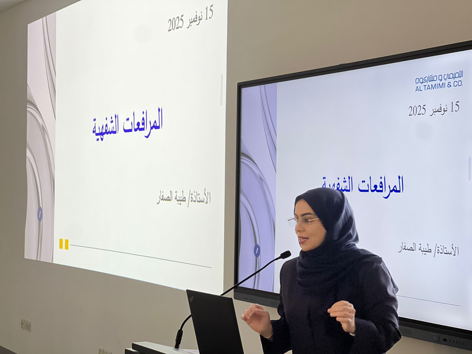 "فن المرافعة"، قدّمتها الأستاذة طيبة الصفّار من مكتب التميمي ومشاركوه، وذلك ضمن البرنامج التدريبي المخصّص للطلبة المشاركين في منافسة المحكمة الصورية.
