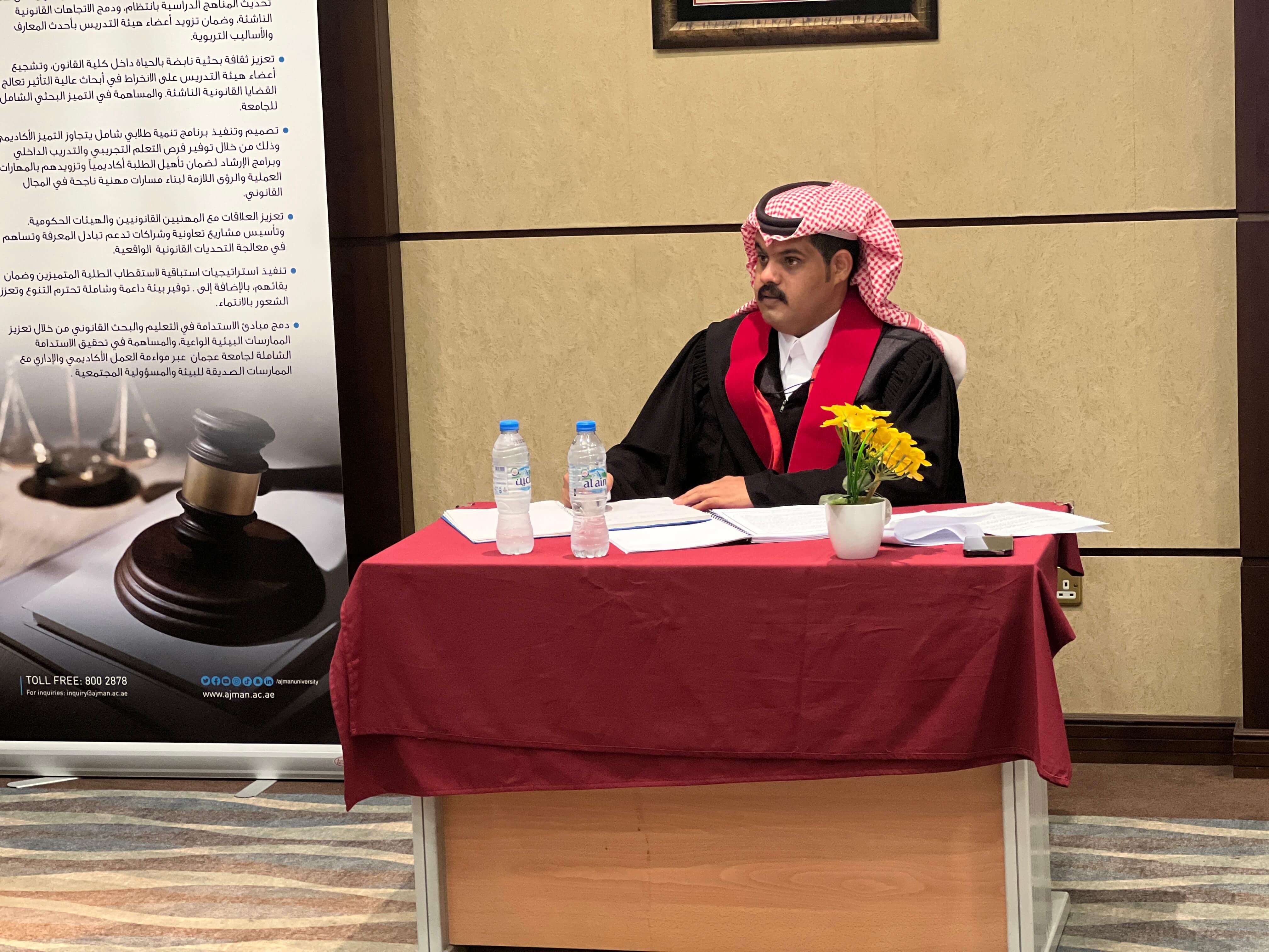 في إطار التزامها بالتميز الأكاديمي ودعم البحث العلمي، عقدت كلية القانون بجامعة عجمان جلسة الحكم على أطروحة الماجستير في القانون العام المقدمة من الطالب نجم محمد العتيبي، بعنوان: