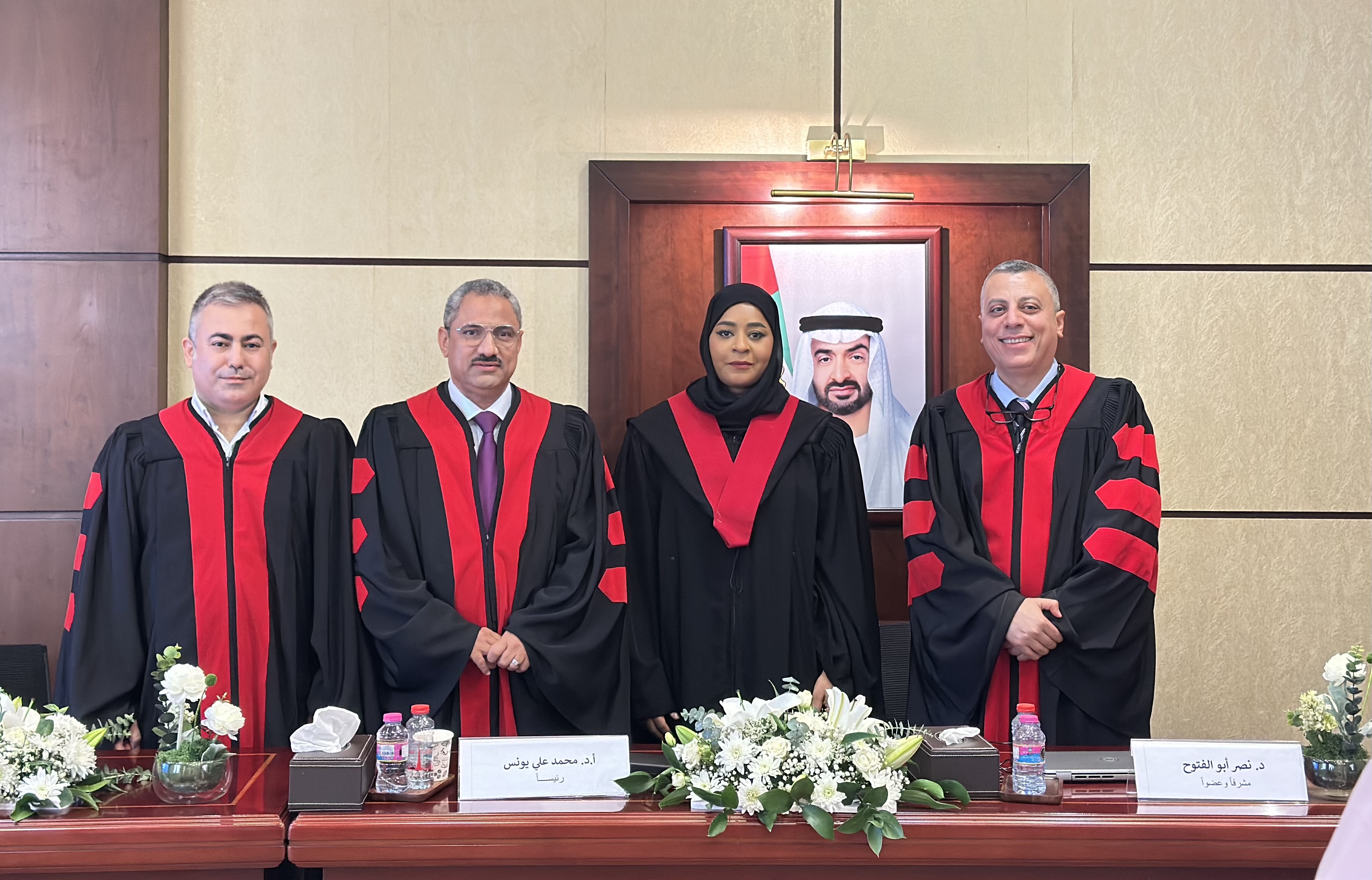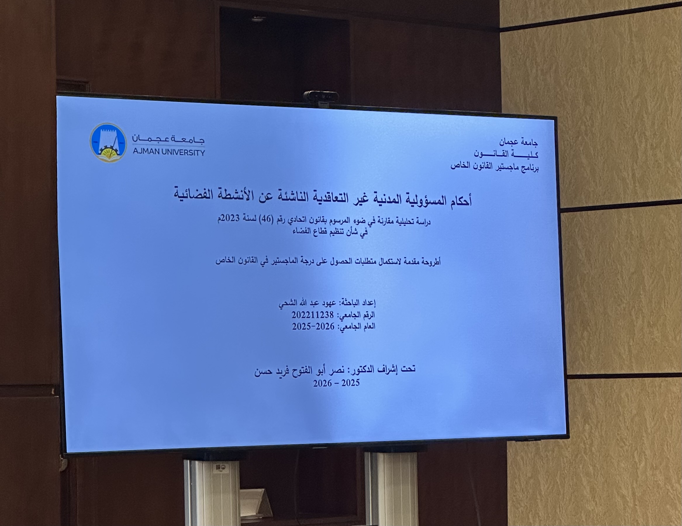 وقد جرت المناقشة يوم الثلاثاء الموافق 25 نوفمبر 2025، الساعة 10:00 صباحًا بمقر جامعة عجمان، أمام لجنة المناقشة المكوّنة من: