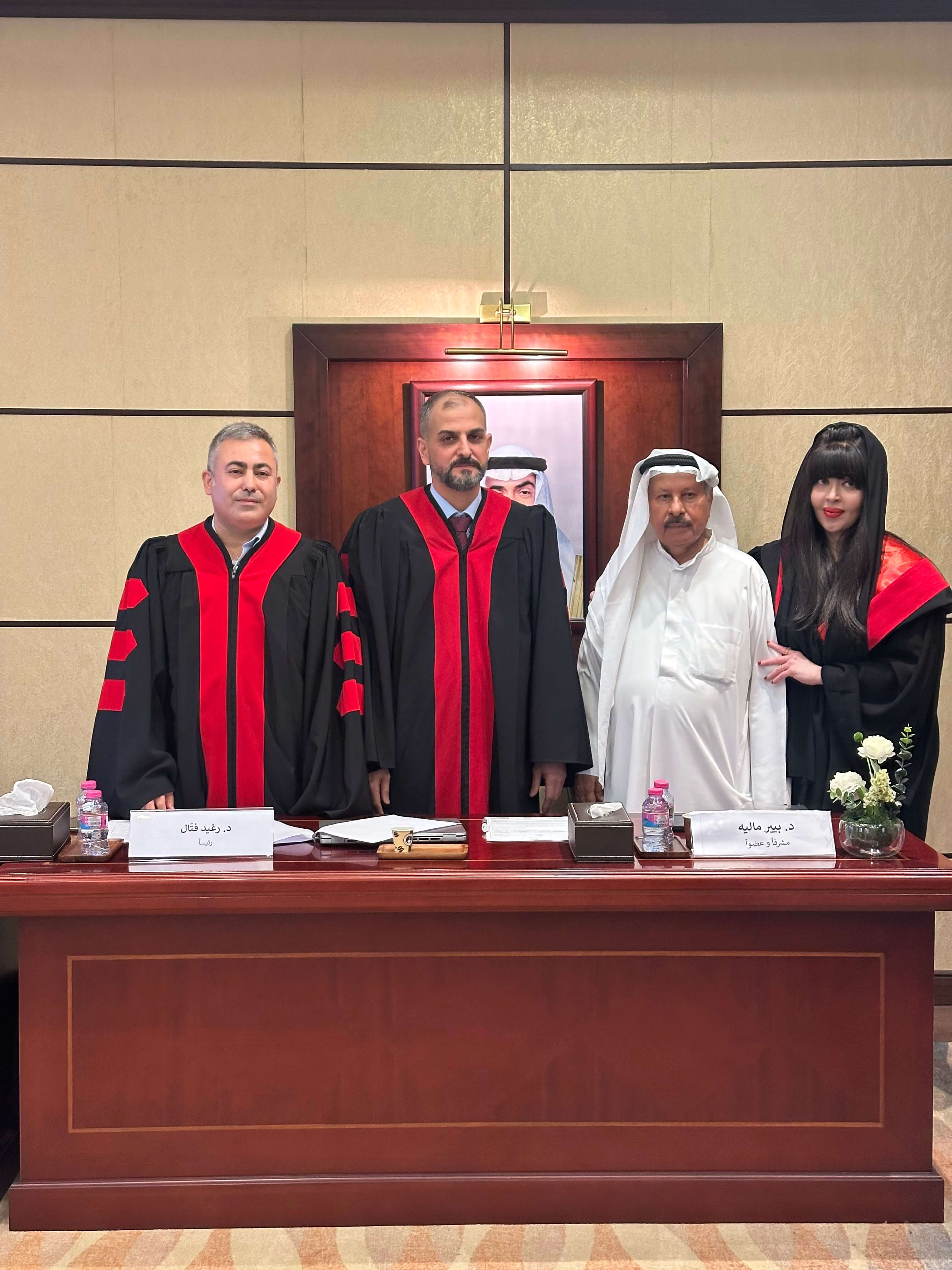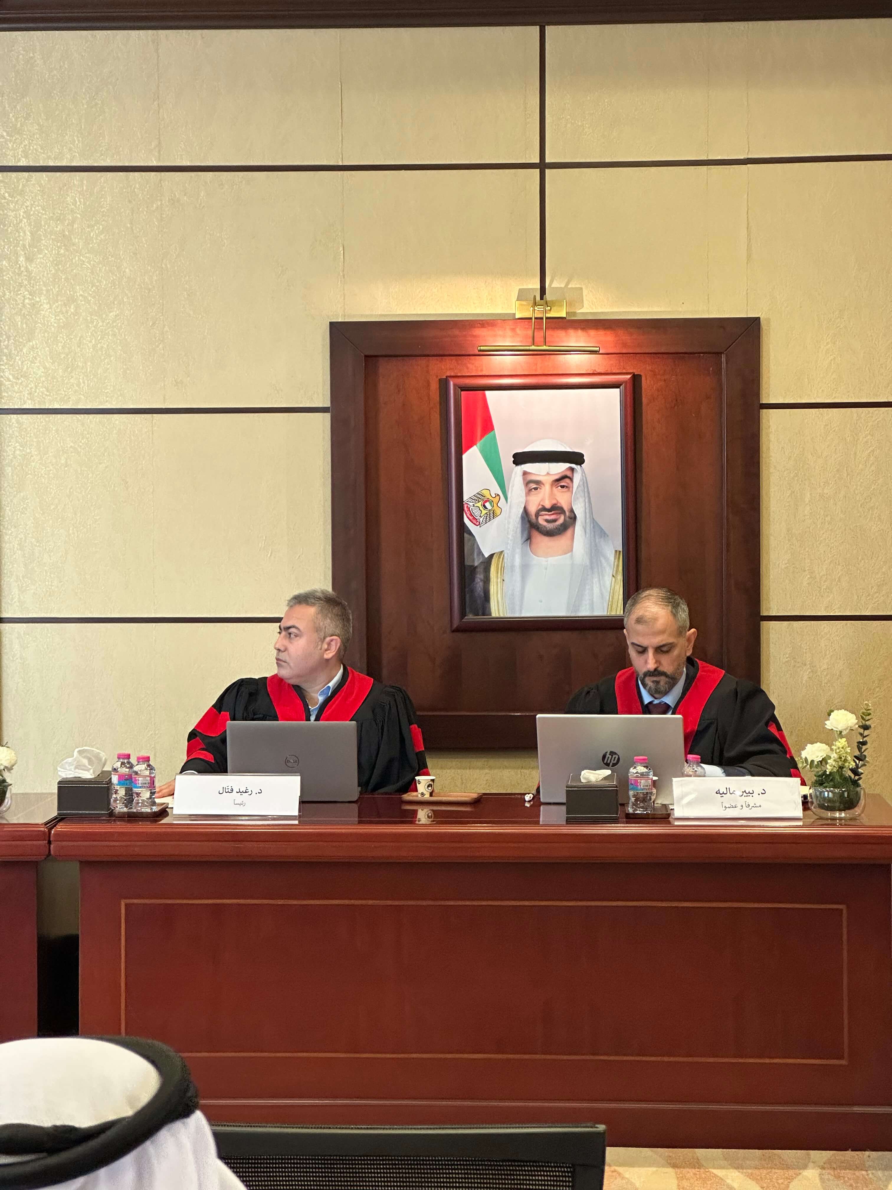وقد جرت المناقشة يوم الاثنين الموافق 24 نوفمبر 2025، الساعة 1:30 ظهراً بمقر جامعة عجمان، أمام لجنة المناقشة المكوّنة من: