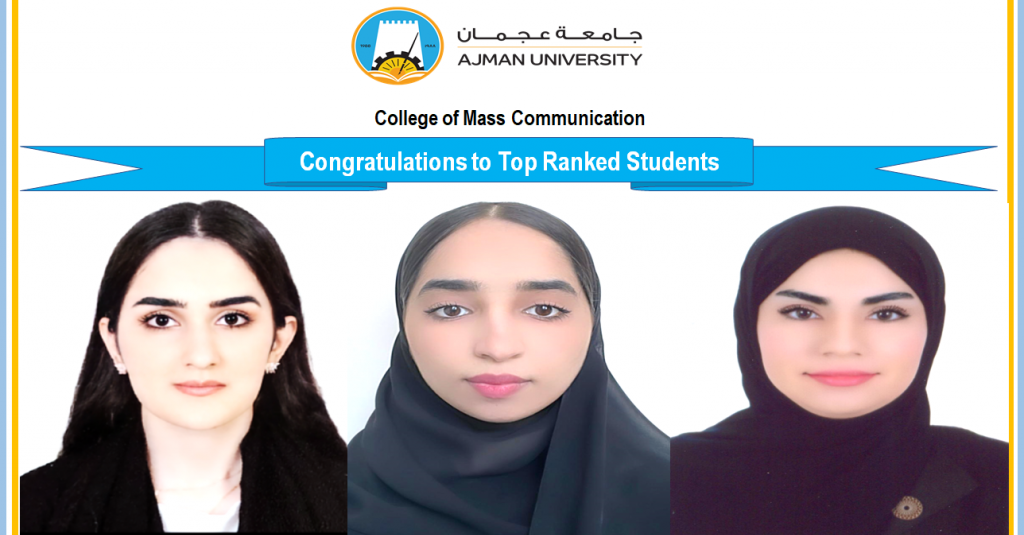 تتقدم إدارة كلية الإعلام وأعضاء هيئتها التدريسية والإدارية بأطيب التهانى للطالبات المتميزات خلال الفصل الخريفي من العام الأكاديمي 2021 - 2022، حيث حصلت كل من الطالبات خديجة وعد الطائي ومريم الشحية من تخصص الإذاعة والتلفزيون، والطالبة مروة نكهبان من تخصص التصميم الجرافيكي على المراكز الأولي بين طلبة وطالبات الكلية، ونتمنى للطالبات دوام التوفيق والنجاح