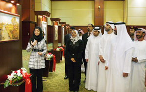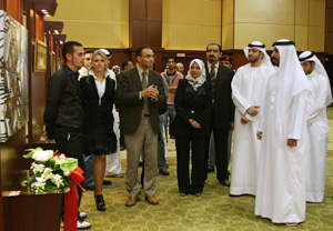 وخلال جولته بالمعرض، استمع الشيخ ماجد إلى شرح من أ. نيلي بيريز، عضو الهيئة التدريسية بجامعة ميغيل هيرنانديث في ألكانتي الإسبانية ومسؤولة شركة لوكسارت للوحات الفنية والمنحوتات كما استمع لشروحات طلبة الجامعة الإسبانية حول ما احتوته لوحاتهم من رسائل ودلالات والأدوات التي استخدموها في الرسم بالإضافة إلى المدارس الفنية التي تنتمي إليها لوحاتهم والتي ركزت المدرستين الواقعية والتعبيرية بالإضافة إلى أعمال استخدمت فيها التقنيات المتقدمة للفن الحديث المرتبطة بالحروف واللصق (الكولاج) وطباعة مواد خامة.