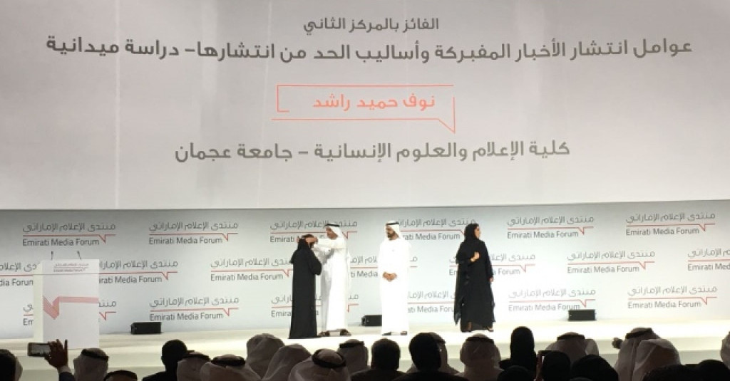 وقد حصدت الطالبة نوف حميد راشد، من كلية الإعلام والعلوم الإنسانية في جامعة عجمان، المركز الثاني نظير بحثها الفائز الذي جاء بعنوان "عوامل انتشار الأخبار المفبركة وأساليب الحد من انتشارها - دراسة ميدانية" ، بإشراف الدكتورة مها عبد المجيد، عضو هيئة التدريس في الكلية.