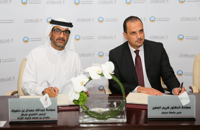 وقعت جامعة عجمان اتفاقية تعاون مع مركز حمدان بن محمد لإحياء التراث وذلك إيمانا من الجانبين بأهمية التواصل بين المراكز التي تعنى بإحياء التراث والمؤسسات الأكاديمية المهتمة بالموروث الثقافي، وحرصاً على تبادل وتكامل المعلومات ومتابعة آخر التطورات وتوفيرها أمام الباحثين وصناع القرار.