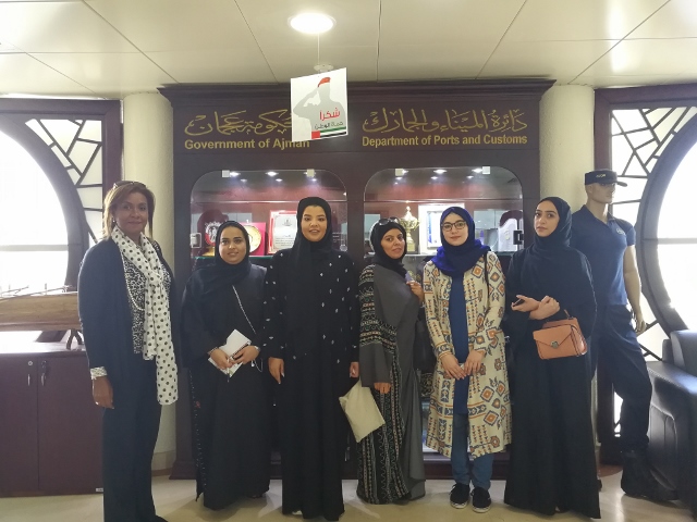 أما خلال زيارتهن لدائرة ميناء وجمارك عجمان، فقد تعرفن على الهيكل التنظيمي للدائرة ودور قسم الأمن الذي يعمل جنباً إلى جنب مع هيئة أمن المنافذ وخفر السواحل وجهاز أمن الدولة والشرطة والجوازات. حيث يمنح قسم الأمن تصاريح دخول وخروج الأفراد إلى الميناء بكافة أنواعها م تصريح مؤقتة (يومية) وشهرية وسنوية للشركات بشكل خاص. ثم تحدثت عن الدور الهام لغرفة العمليات وقسم الصحة والسلامة والبيئة، وقسم المراقبة والإرشاد وتصاريح البواخر.