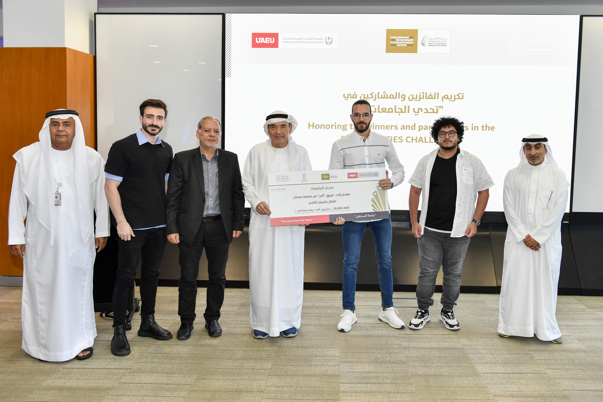 فاز فريق جامعة عجمان المكون من ثلاثة طلاب بالمركز الثاني في مسابقة "أفضل مبادرة جامعية لتأهيل موظفي المستقبل في الاتصال الحكومي" ضمن تحدي الجامعات الذي نظمته جامعة الإمارات العربية المتحدة، بالتعاون مع جائزة الشارقة للاتصال الحكومي (SGCA) والمنتدى الدولي للاتصال الحكومي 2022.