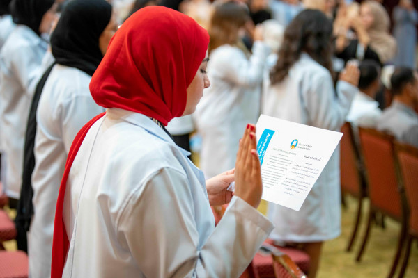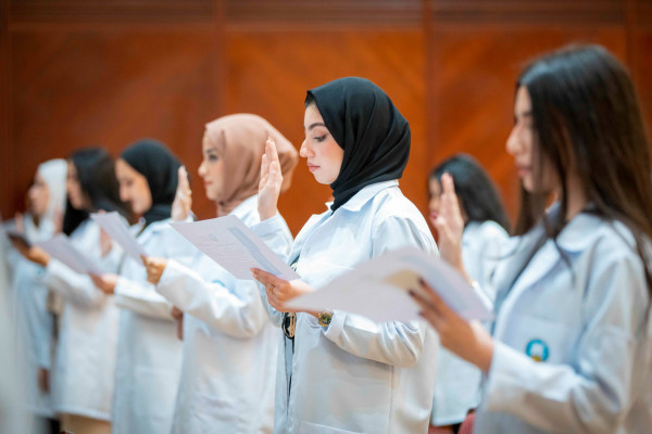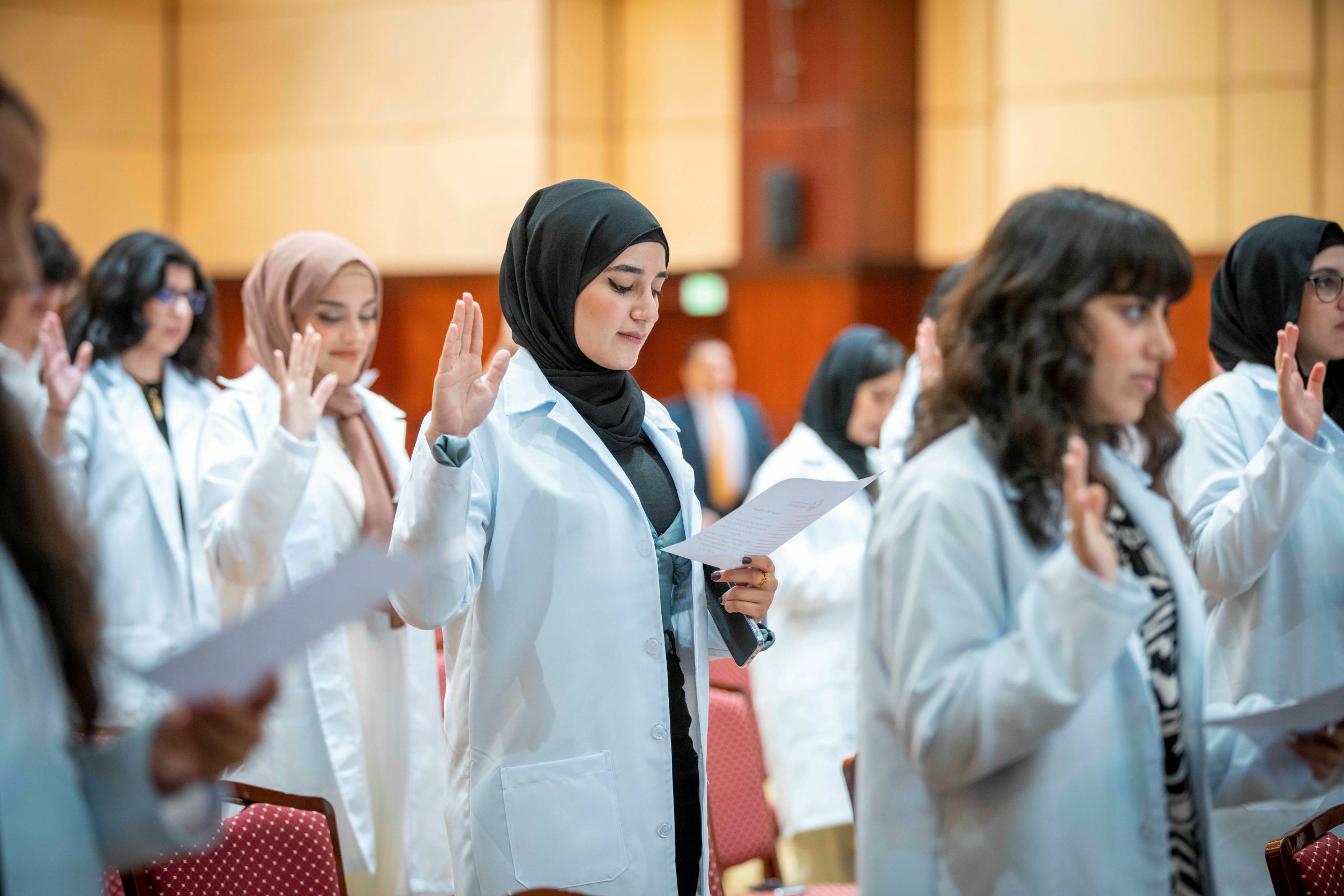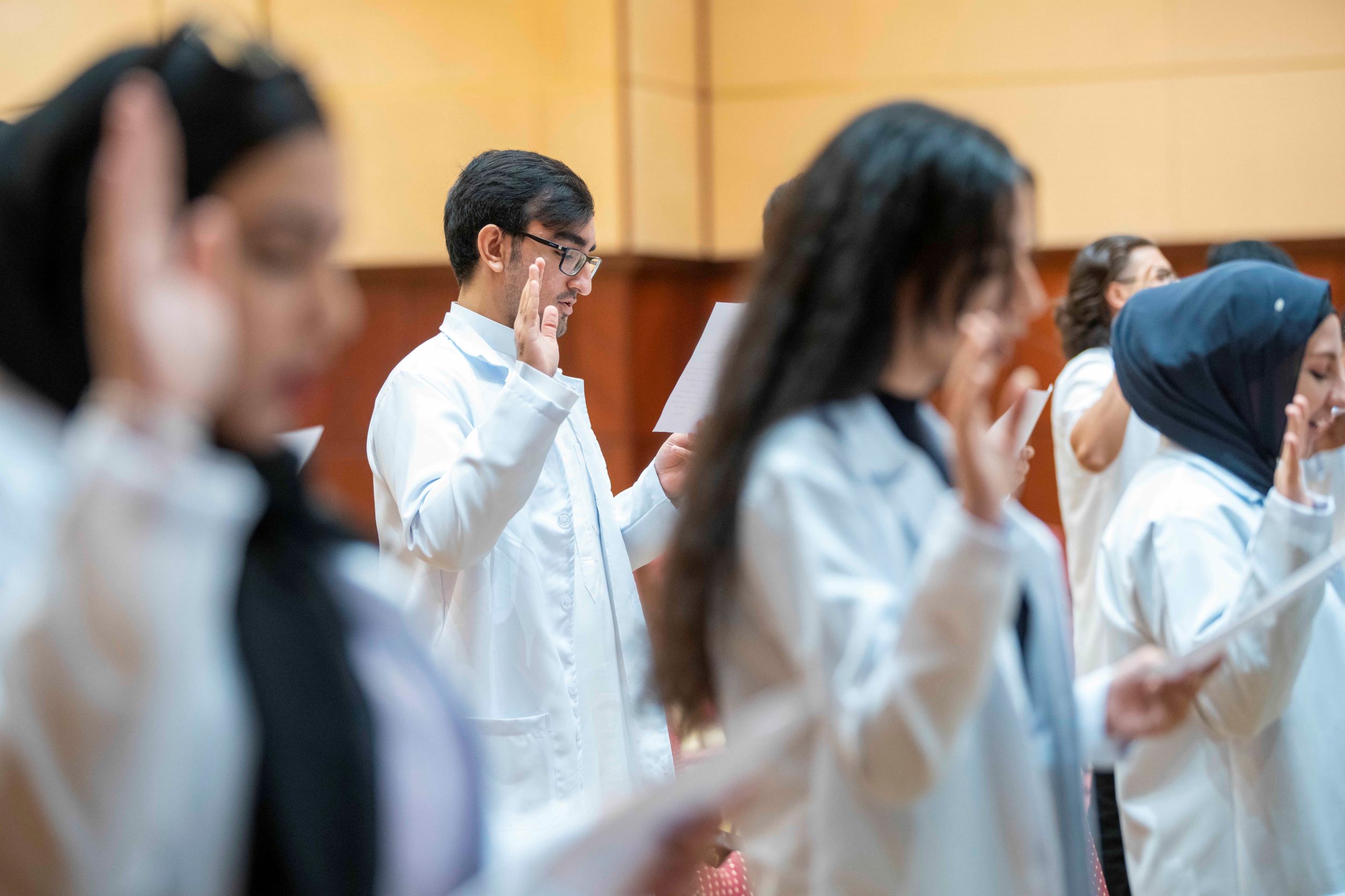 وعقب ذلك، تم استدعاء طلبة دفعة 2027 إلى المسرح حيث تم تقليدهم معاطفهم البيضاء من قبل الدكتور كريم والتقاط الصور التذكارية. وفي نهاية الحفل، أدى جميع الطلبة "قسم الصيادلة"، الذي يعد بمثابة تعهد منهم بالالتزام والتمسك بالمبادئ والأخلاق المهنية كممارسين لمهنة الصيدلة ومقدمين للرعاية الصحية.