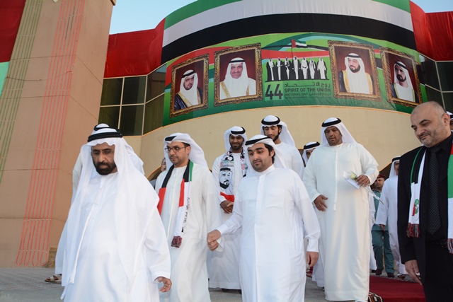 بدأت الاحتفالات بمسيرة ( العلم ) تقدمها سمو الشيخ راشد بن حمد الشرقي وكبار المسؤولين من مؤسسات المجتمع المحلي والحكومي وجميع منتسبي مقر الجامعة بالفجيرة وهم يحملون علم الدولة تعبيرا عن حب أبناء الوطن لقائد مسيرة التنمية والحضارة والوفاء له وولائهم لقيادتهم الرشيدة التي تسعى إلى توفير كل متطلبات الحياة الكريمة لهم لينعموا بالأمن والأمان والاستقرار. صاحبت المسيرة الأهازيج الشعبية والرقصات التراثية الإماراتية، ثم بدأ الاحتفال بقص الشريط إيذاناً بافتتاح الفعاليات التي يتضمنها برنامج الاحتفال باليوم الوطني لدولة الإمارات.