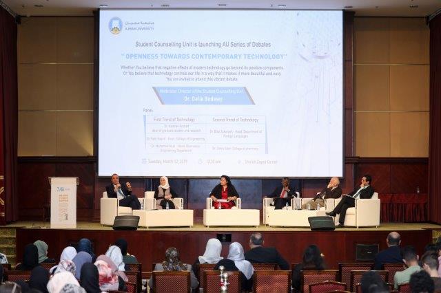 نظمت وحدة الإرشاد الطلّابي بعمادة شؤون الطلبة في جامعة عجمان أول مناظرة ضمن سلسلة من المناظرات، بعنوان " الانفتاح على التكنولوجيا المعاصرة" شارك فيها كل من الدكتور كامران أرشد، عميد الدراسات العليا والبحوث، والدكتور فهر حياتي، عميد كلية الهندسة وتكنولوجيا المعلومات، والدكتور محمد نصر، رئيس قسم هندسة المعدات الطبية، والدكتورة زهرة قديس، من كلية الصيدلة والعلو الصحية، والدكتور بلال زكارنة، رئيس قسم اللغات الأجنبية، وذلك بإشراف الدكتورة داليا بديوي مديرة وحدة الإرشاد.