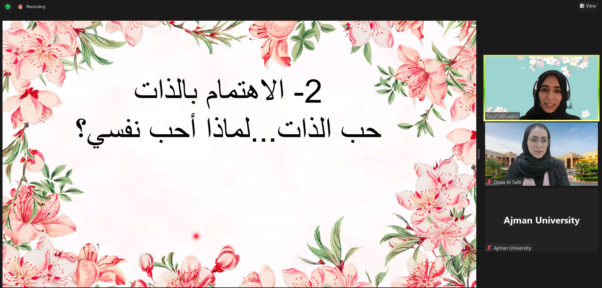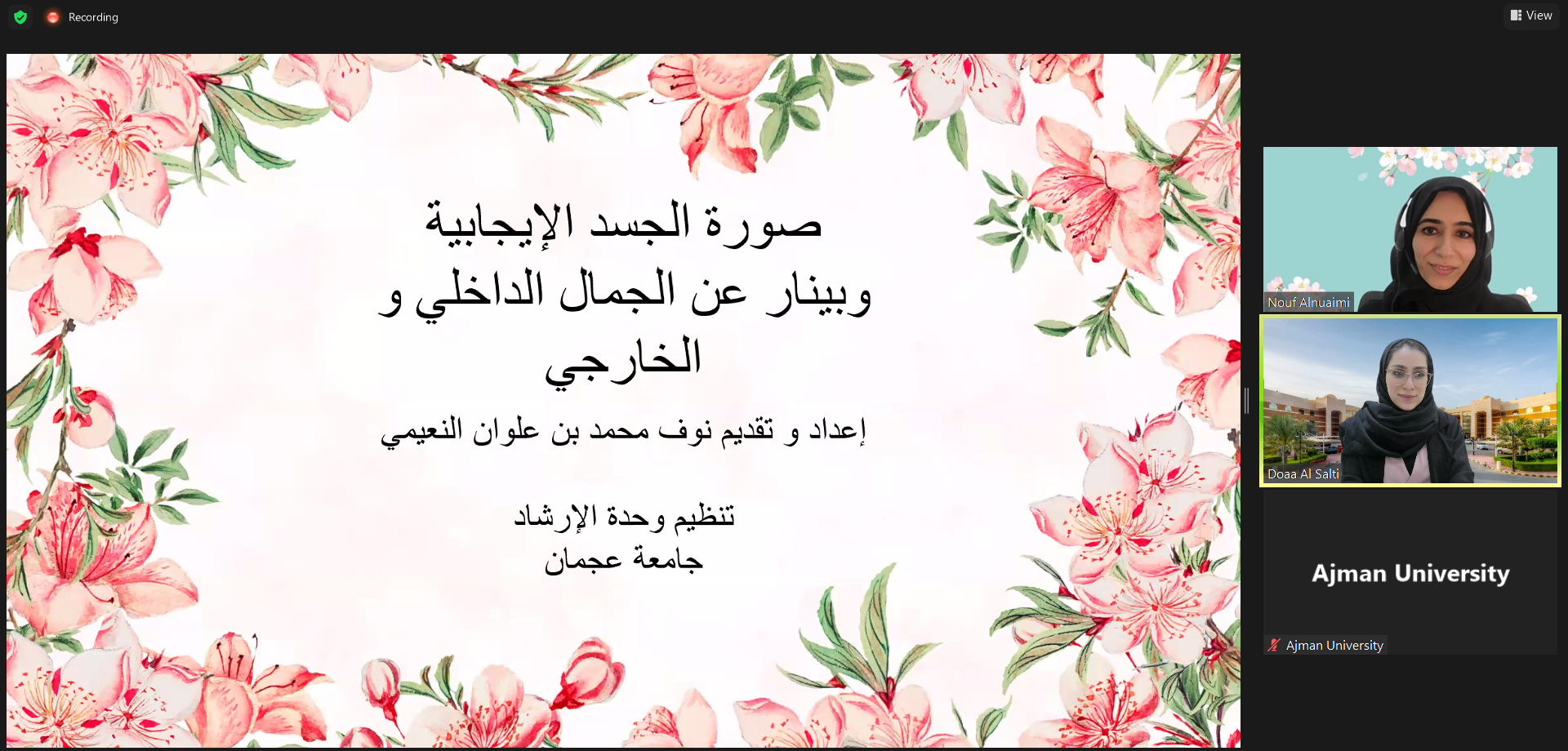 On October 26, 2023, the Counseling Unit arranged a workshop that explored various aspects, including the definition of beauty, the influence of one's thoughts on self-confidence, personal journeys towards self-acceptance, methods to attain inner beauty, perceptions of external beauty, and strategies to achieve physical well-being. This informative session was led by Ms. Nouf Alnuaimi, Lecturer at the College of Humanities and Sciences.