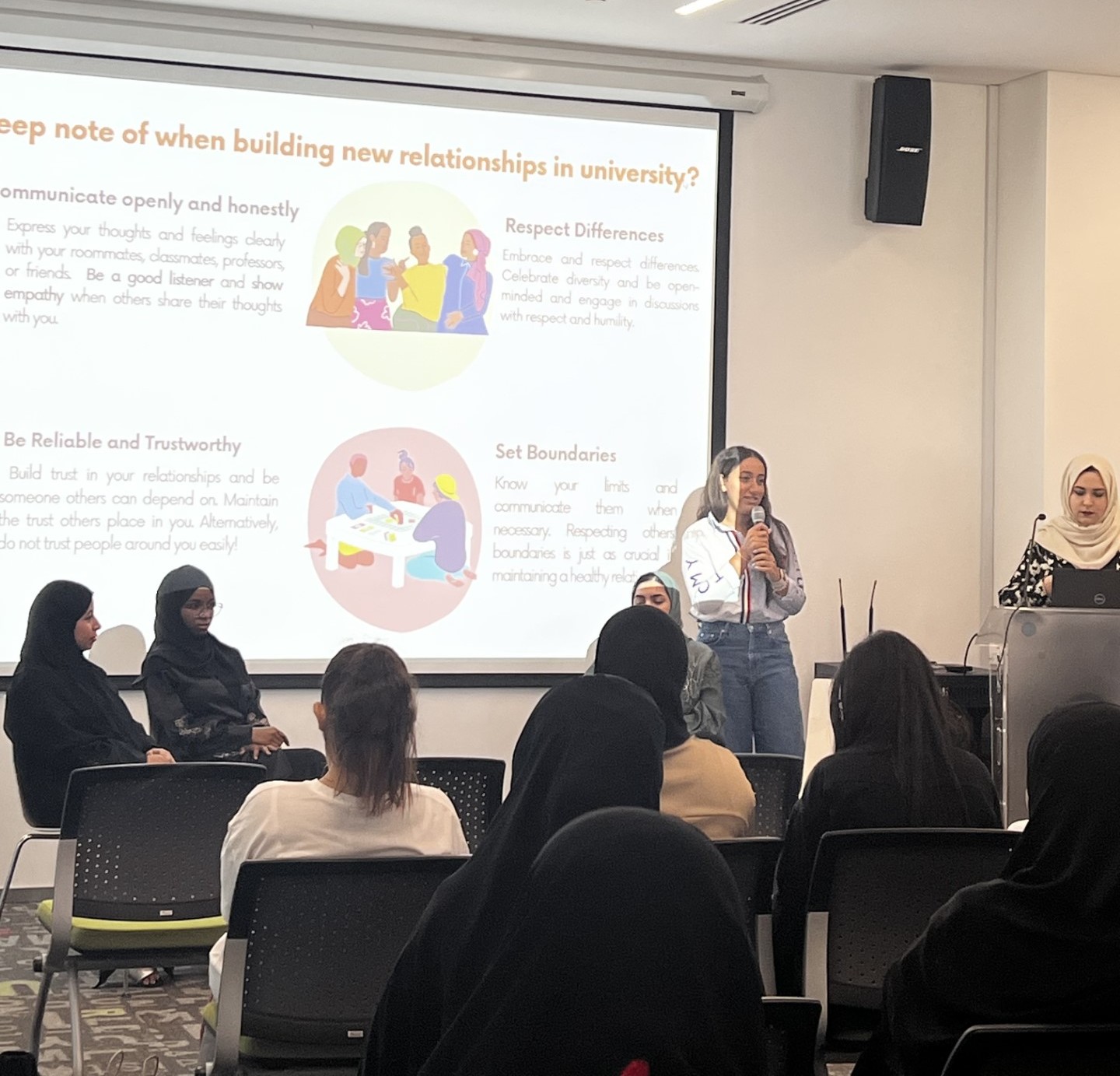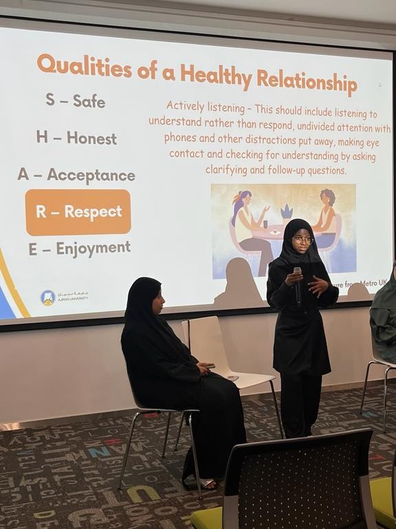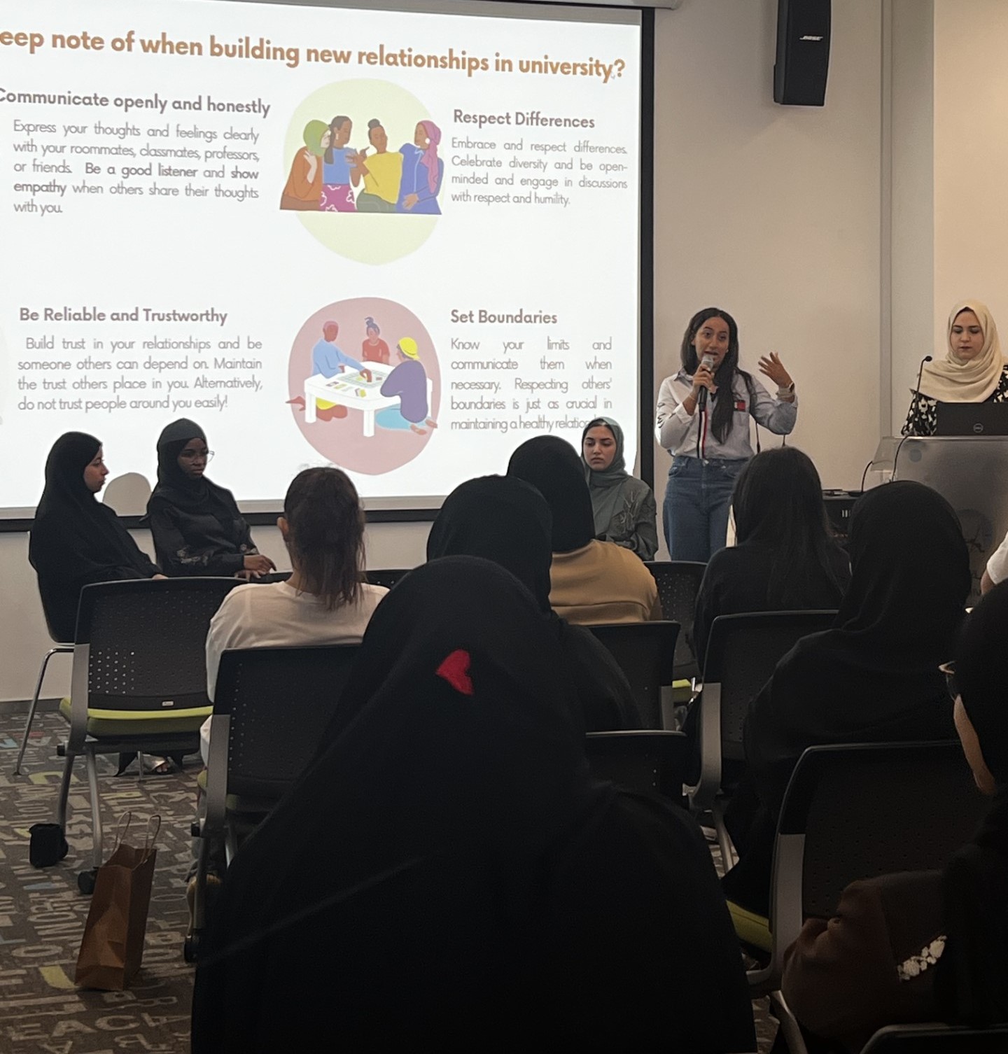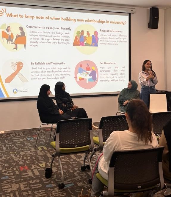On August 23, 2023, the Counseling Unit organized a group meeting, between four exiting and new students at AU, and was moderated by Ms. Salwa Jamous, a DBA Student at the College of Business Administration. The students welcomed the new students into their new chapter and talked about their experiences at AU. They discussed the definition of relationships, the importance of building a strong and healthy relationship at University. Moreover, they gave them some tips to good communication skills. The presenters opened a discussion with the audience after the presentation, answering all questions.