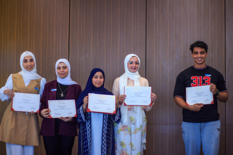 Dr. Nahla Al Qassimi, Dean of Student Services, in the presence of Faculty Liaisons Dr. Nihal Ibrahim (College of Pharmacy and Health Sciences), Rima Shishakly (College of Business Administration), and Asma Alarab (College of Humanities and Sciences) honored Farah Zakut, Maryam Younis, and Laith Badwan as the Most Active Peer Tutors of the Year. Additionally, Doaa Rafiq received the Peer Tutor of the Year award, and Hana AbdelHamid was recognized as the SSC Admin Team Member of the Year.