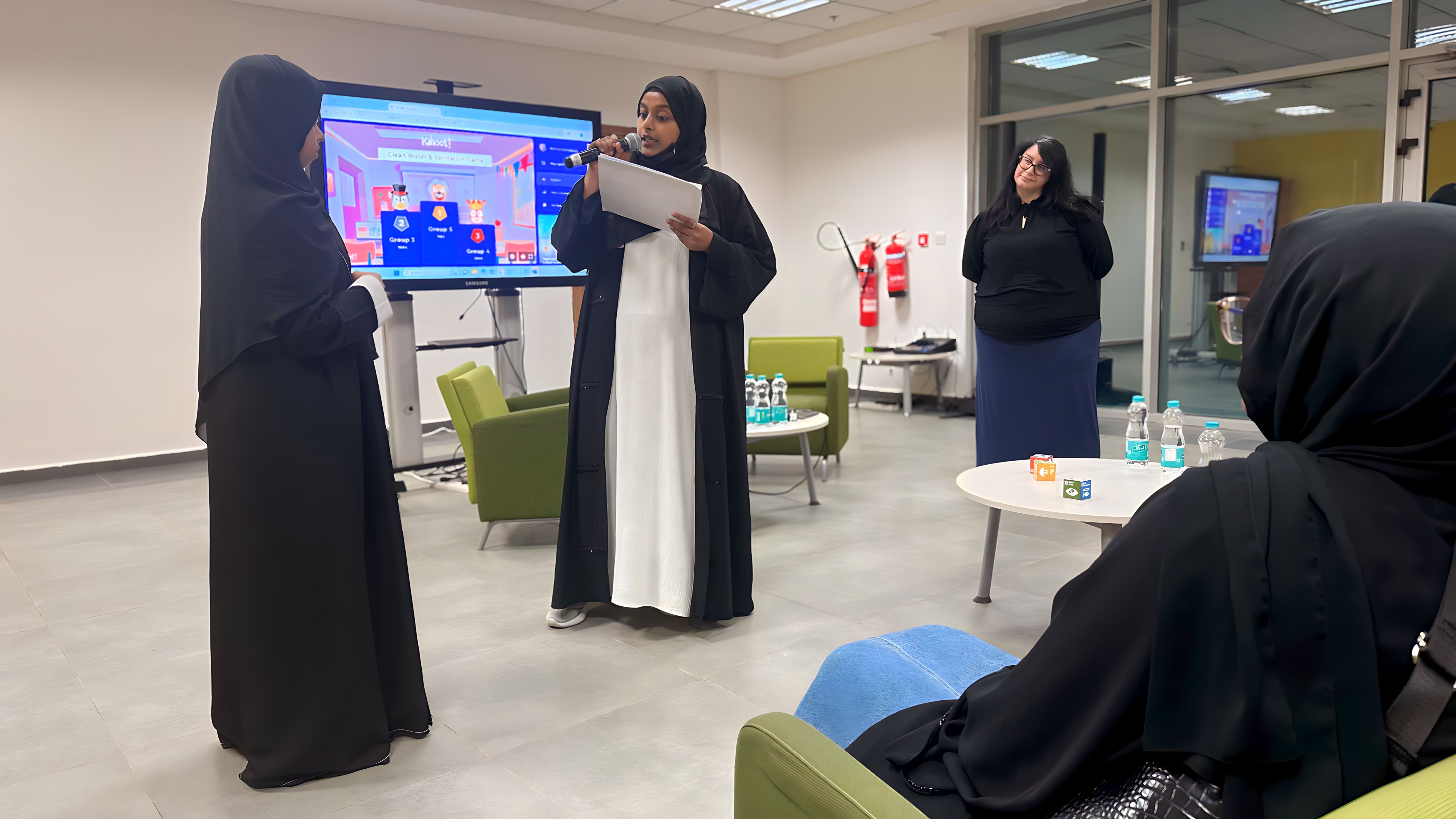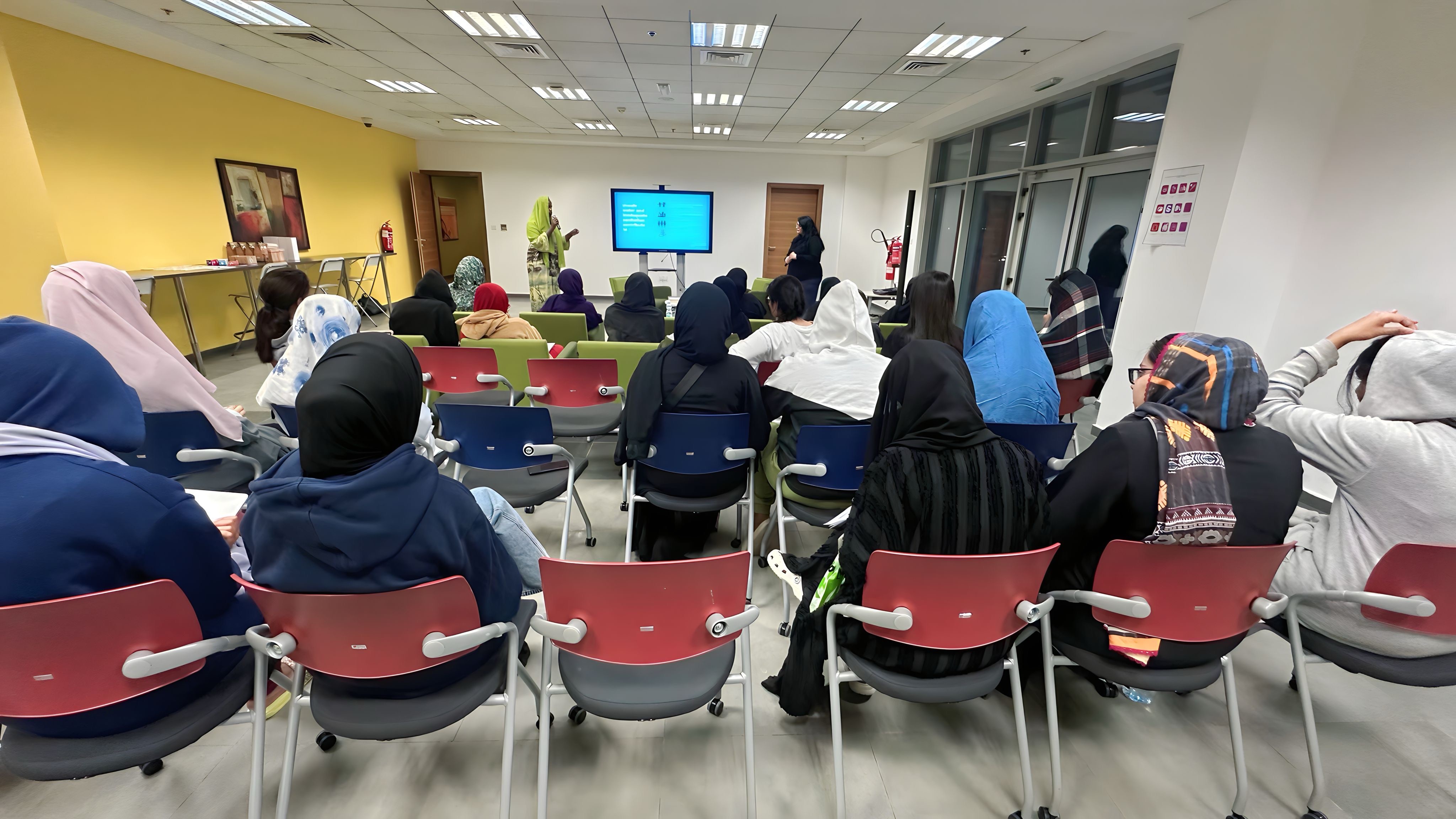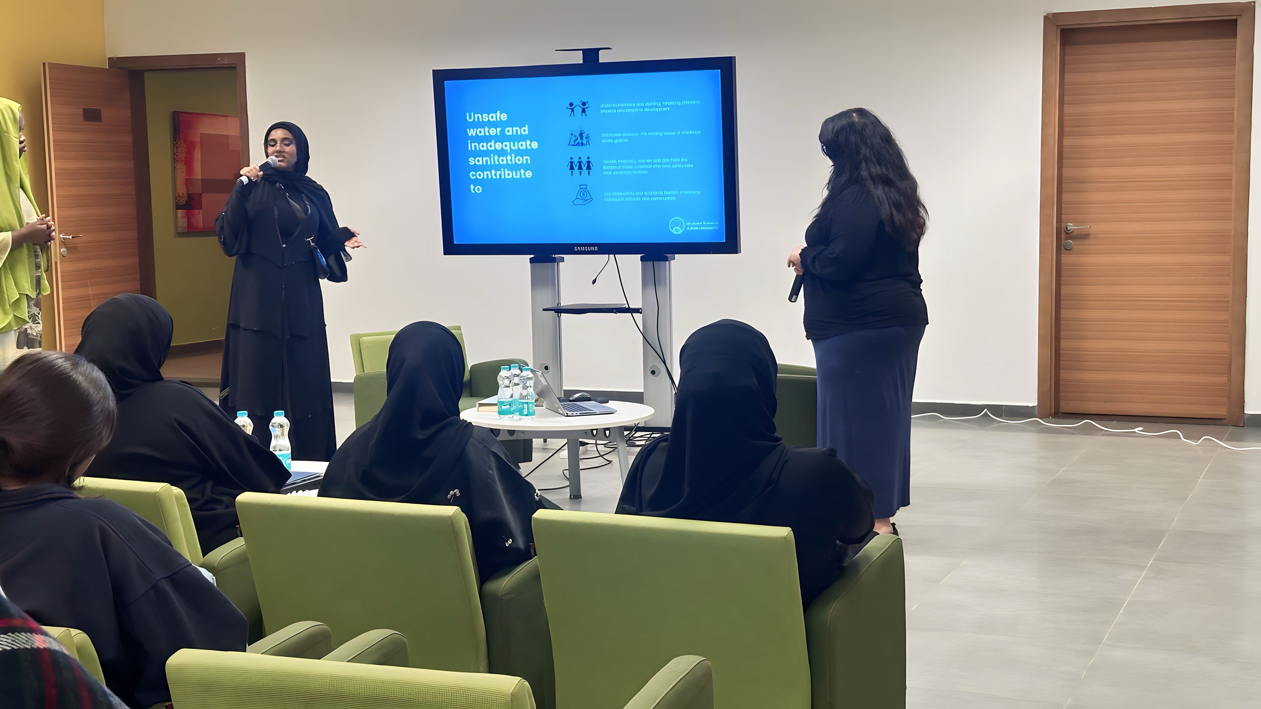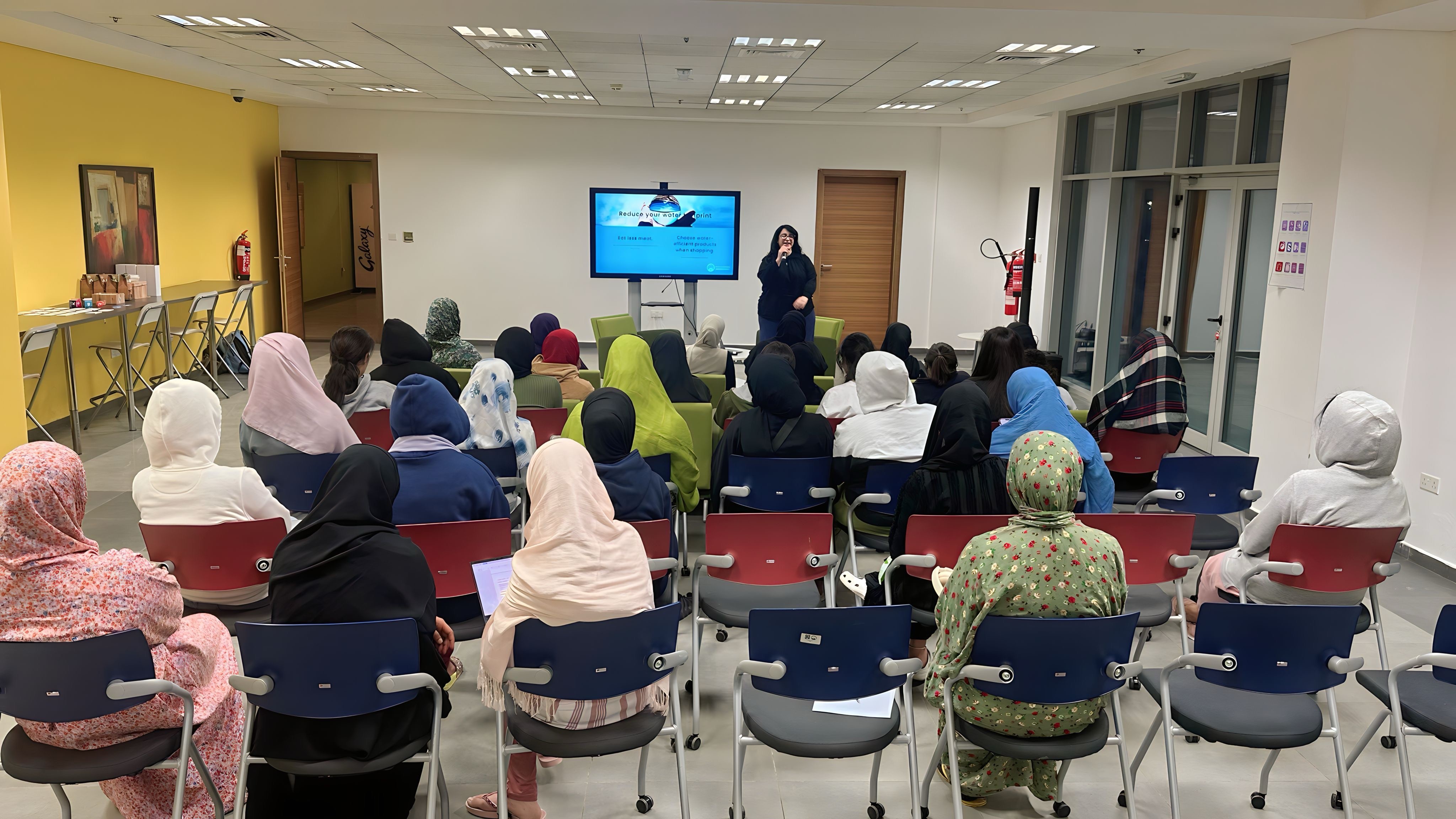 Led by Ms. Maya Haddad and Ms. Ikram Abdu from the Office of Sustainability, the workshop provided attendees with practical information on water conservation practices, responsible waste disposal, and the crucial link between clean water access, global health, and climate change. The interactive format fostered a dynamic learning environment, allowing students to actively participate and ask questions. Following the presentation, a lively Q&A session provided a valuable platform for female residents to delve deeper into the topic and gain further insights into how climate change impacts water resources and sanitation.