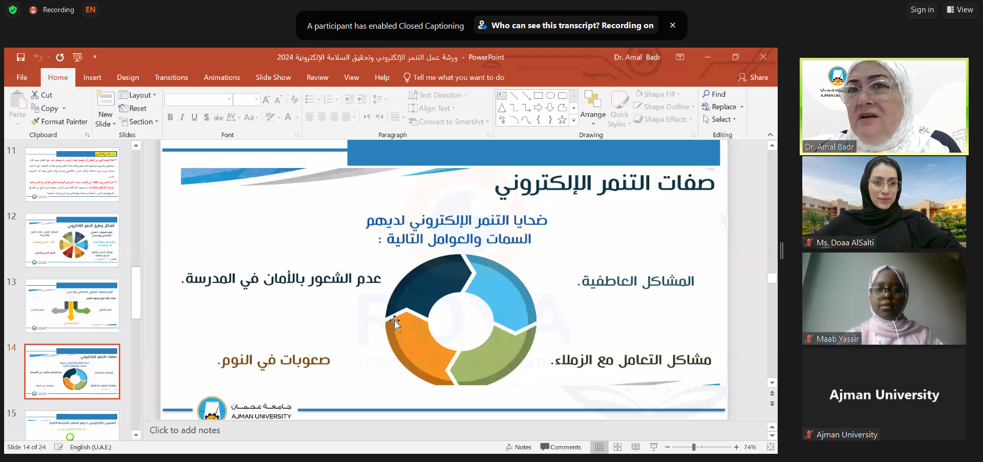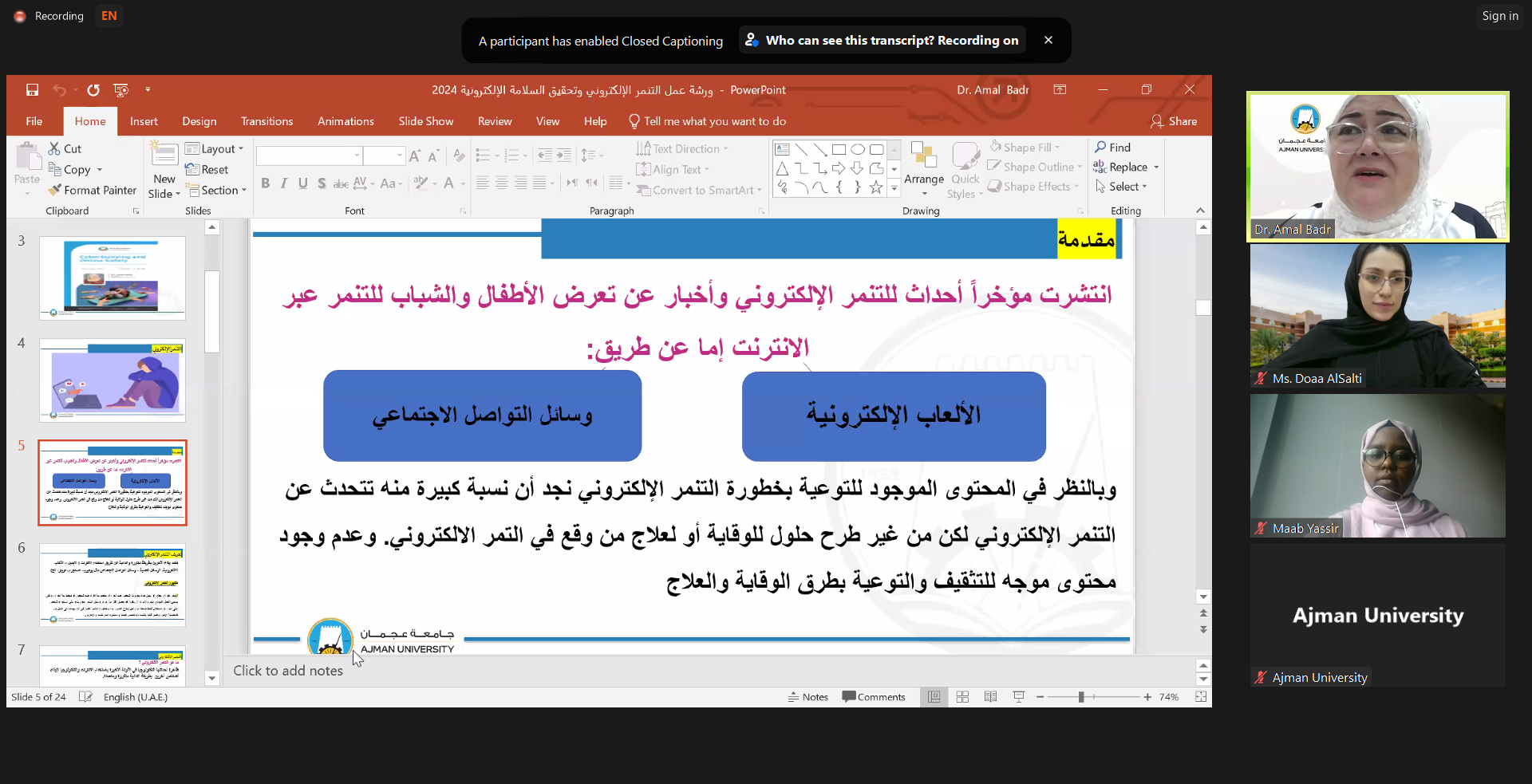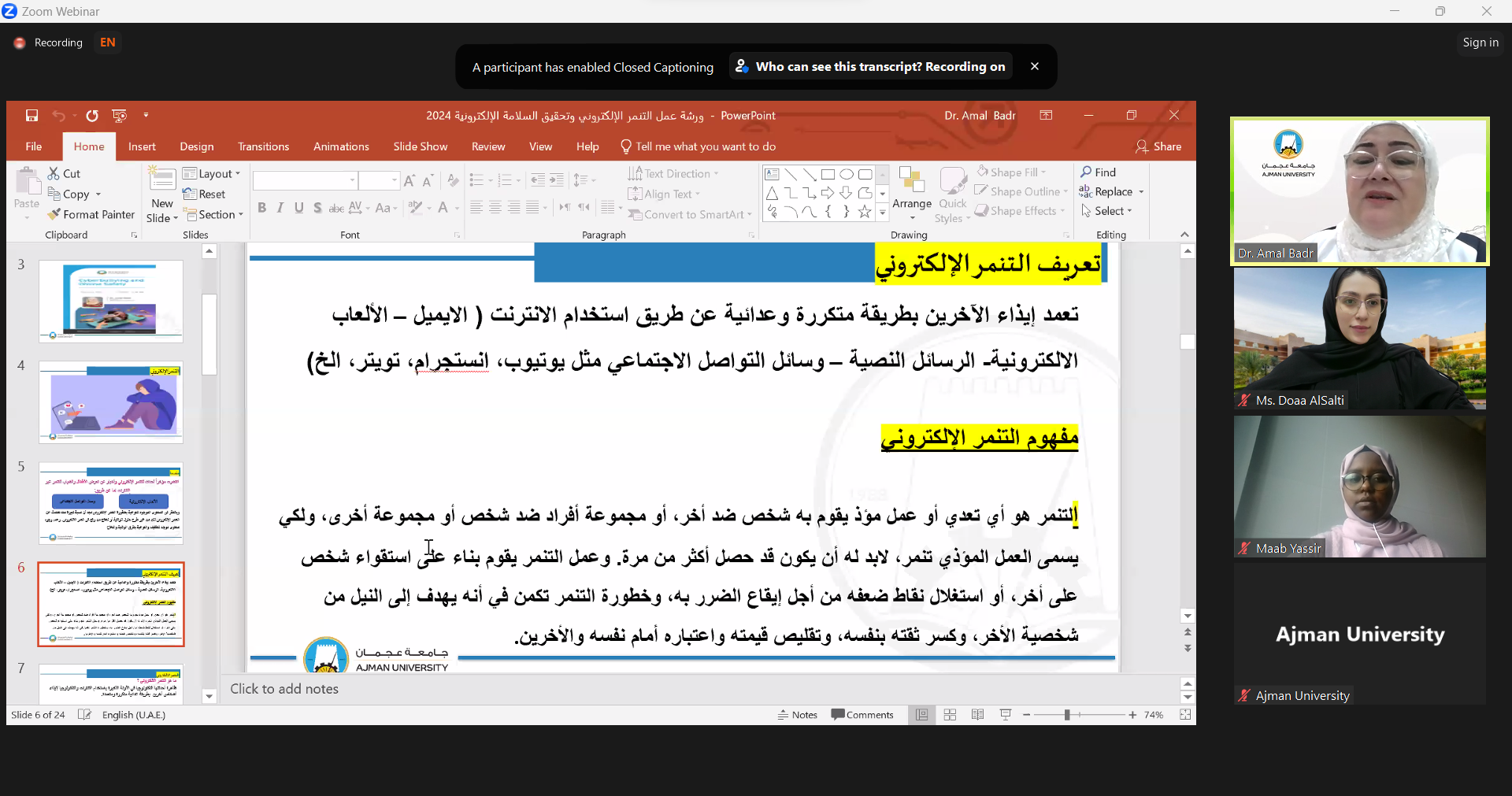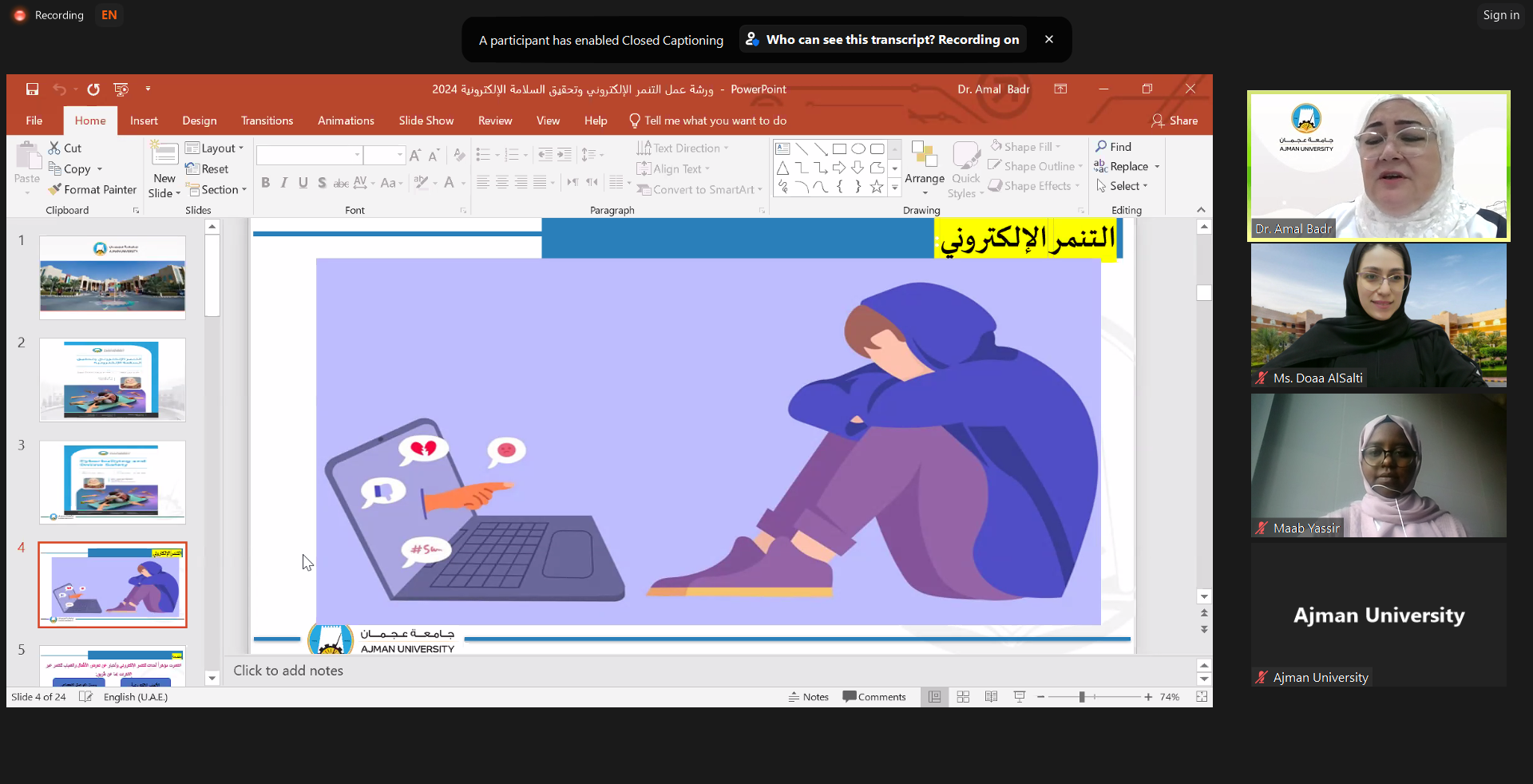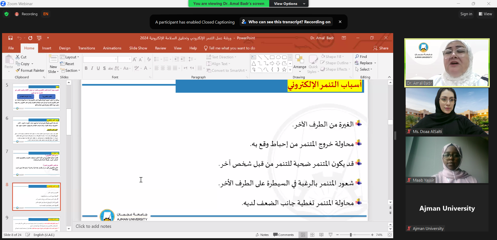 On March 26, 2024, the Counseling Unit hosted a workshop on cyberbullying, presented by Dr. Amal Badr, Associate Professor in the College of Mass Communication. Moderated by Ms. Doaa Al Salti, Administrative Assistant of the Counseling Unit, and Maab Yassir, a student in the College of Humanities and Sciences, the session covered the definition, causes, forms, prevention strategies, and support methods for cyberbullying victims, along with real-life examples and well-being tips.