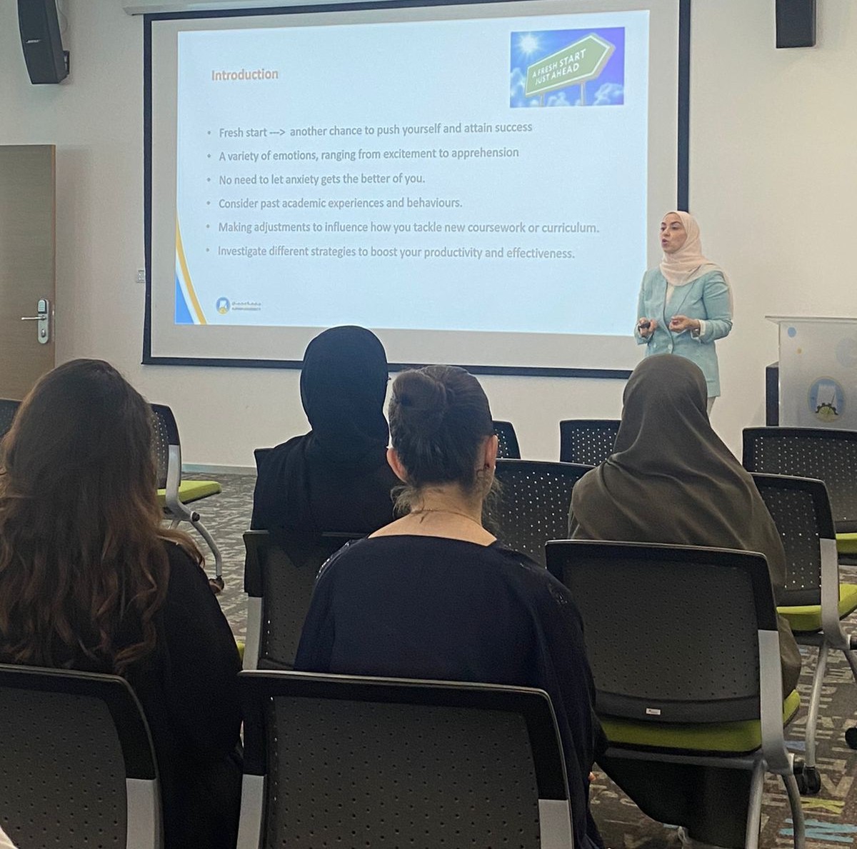 On January 8, 2024, the Counseling Unit organized a workshop presented by Dr. Ruba Odeh, Assistant Professor in the College of Dentistry. This workshop covered many topics including organization strategies, effective planning, goal setting, note-taking skills, utilization of university resources, the significance of positive social circles, and key steps for achieving success throughout the semester. The event attracted numerous students who displayed enthusiastic participation.