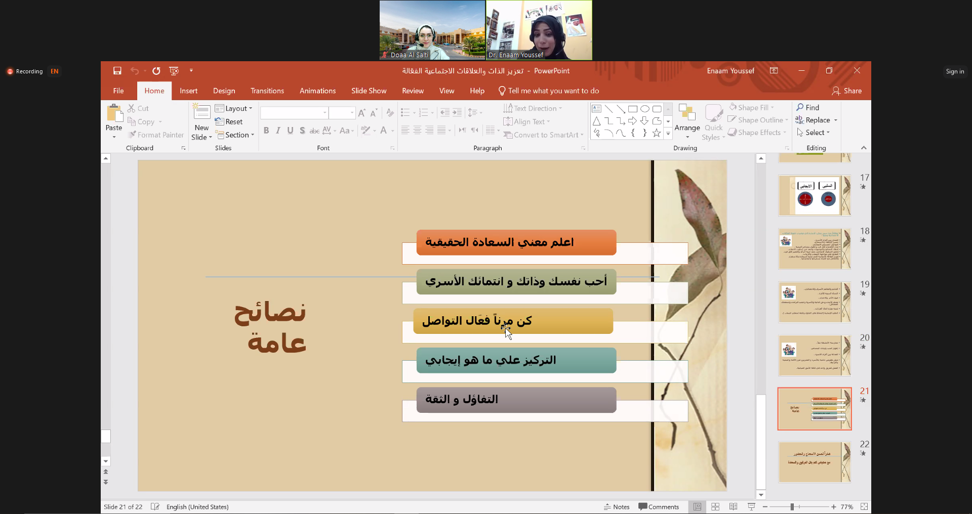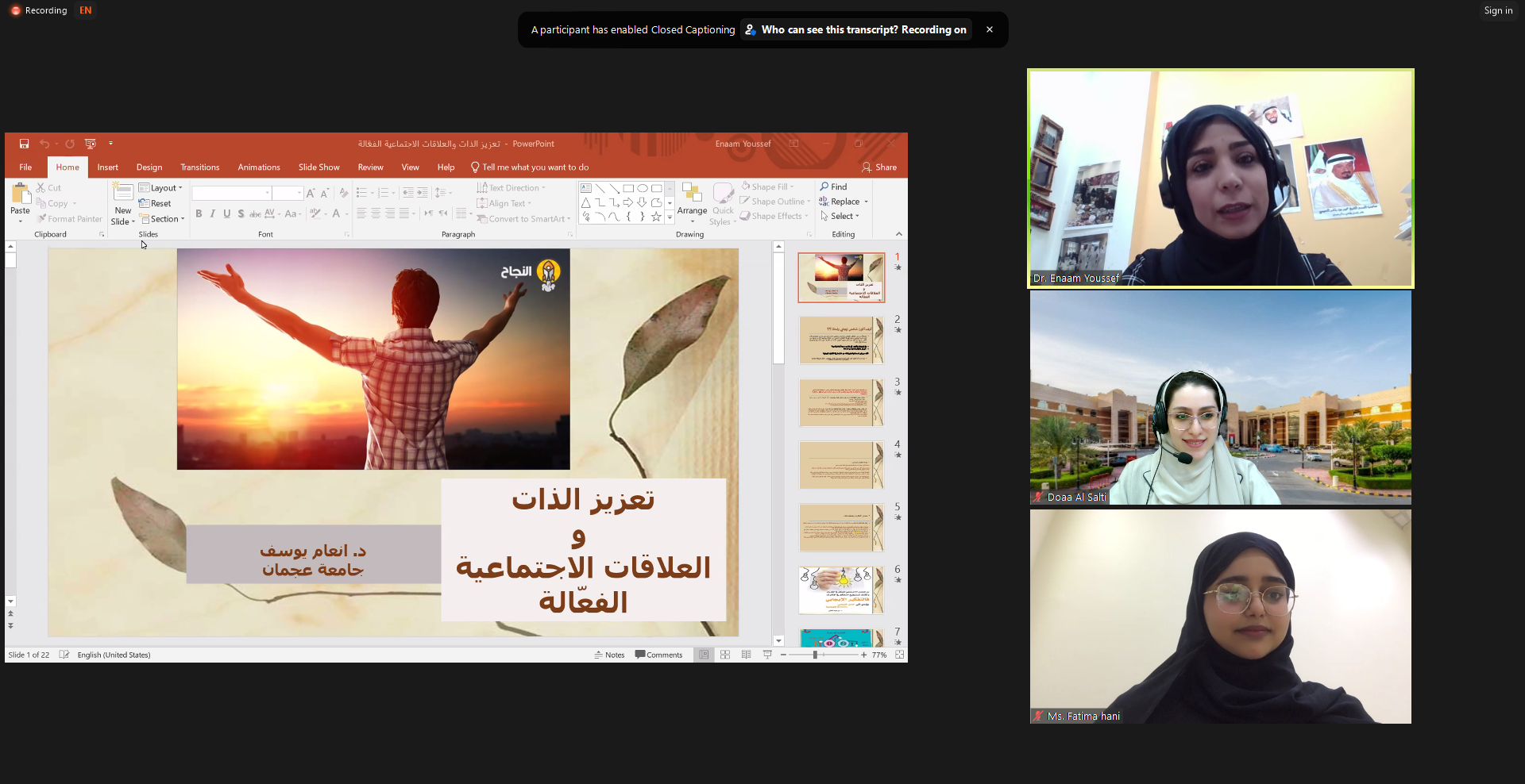 On February 20, 2024, the Counseling Unit organized a workshop focusing on self-awareness development, fostering positive social interaction, and enhancing self-confidence through active social engagement. The workshop was presented by Dr. Enaam Youssef, Assistant Professor in the College of Humanities and Sciences.