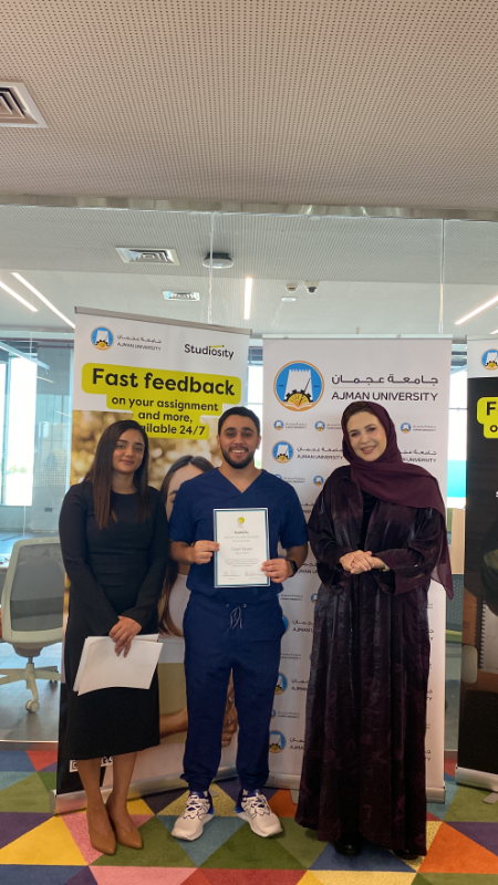 On the 15th of February, the SSC arranged a successful certificate ceremony for the Studiosity Lead Students (SLS), including 18 PTs in the SSC from different colleges of AU. The event was organized and attended by Prof. Nadir Kheir, SSC Manager, Dr. Nahla Al Qassimi, Dean of Students Services, Dr. Mohamed Eltahir, Acting Dean of Humanities and Sciences, Mr. Mahmoud Shouman & Ms. Khansha Siddiqui. Additionally, present were Ms. Ayisha Saleem, Administrative Coordinator, and SSC Officers, Abdul Razzak Dabbagh, Carine Dakak, Farah Zakut, Mira Samir, and Obaya Bezeid.