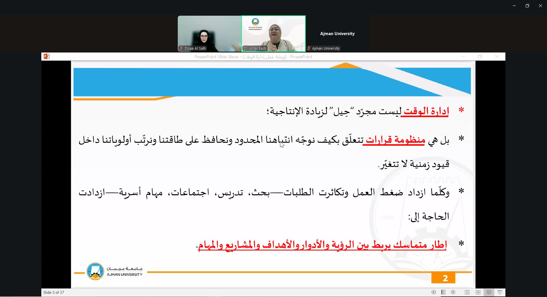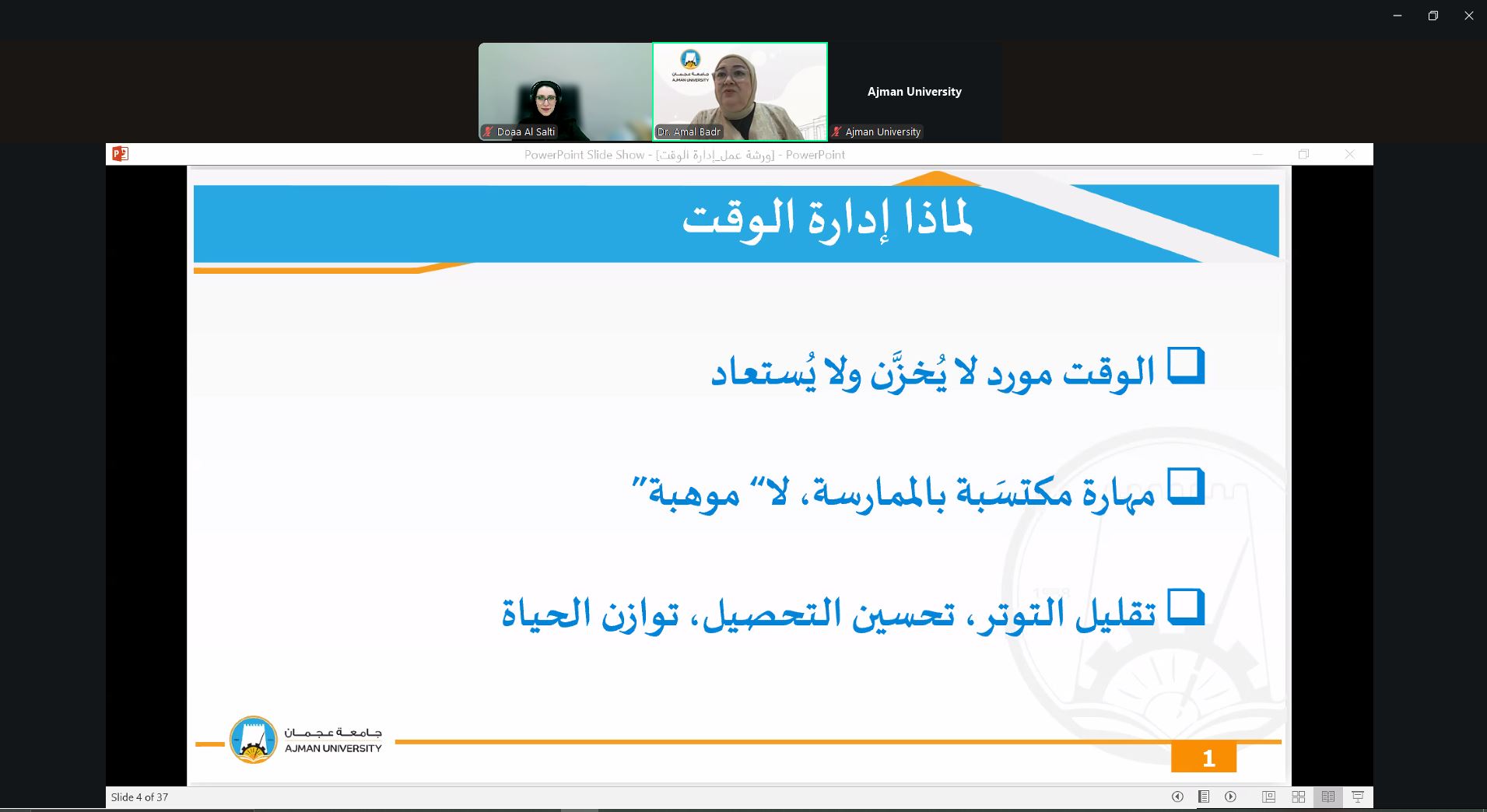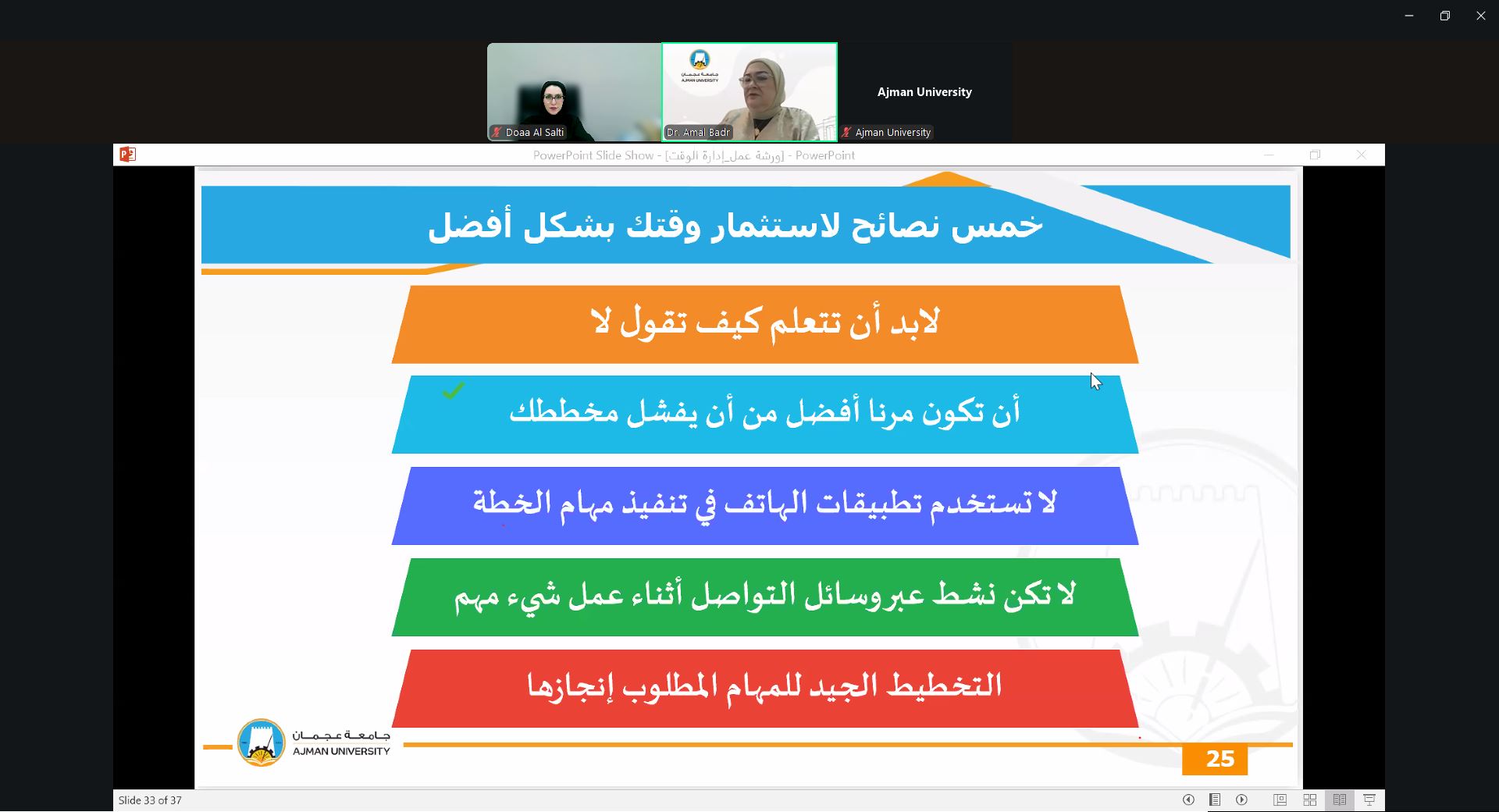 On September 24, 2025, the Counseling Unit held a webinar presented by Dr. Amal Badr, Associate Professor at the College of Mass Communication. The session focused on effective time management strategies, prioritization techniques, and methods to reduce procrastination. Dr. Amal provided practical tools for balancing academic responsibilities with personal commitments, helping students maximize productivity and maintain a healthier study-life balance.