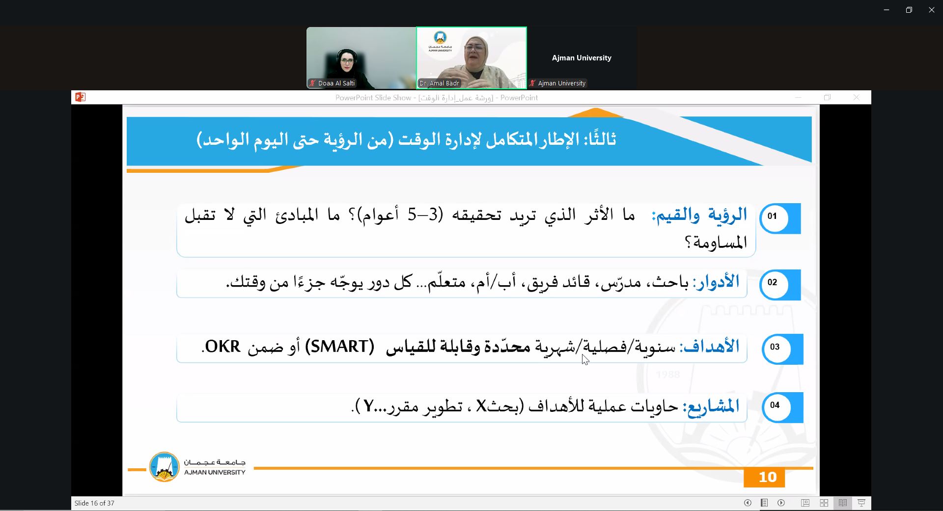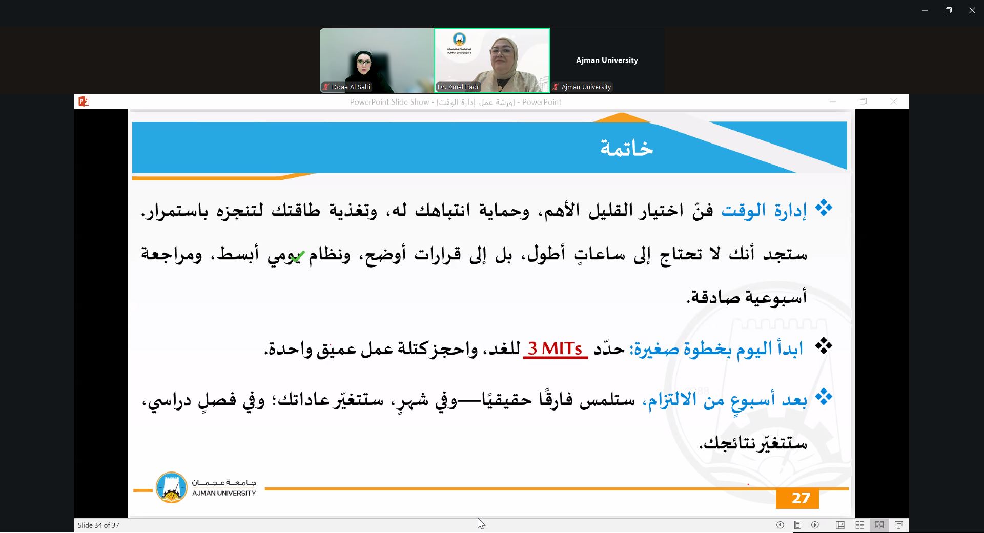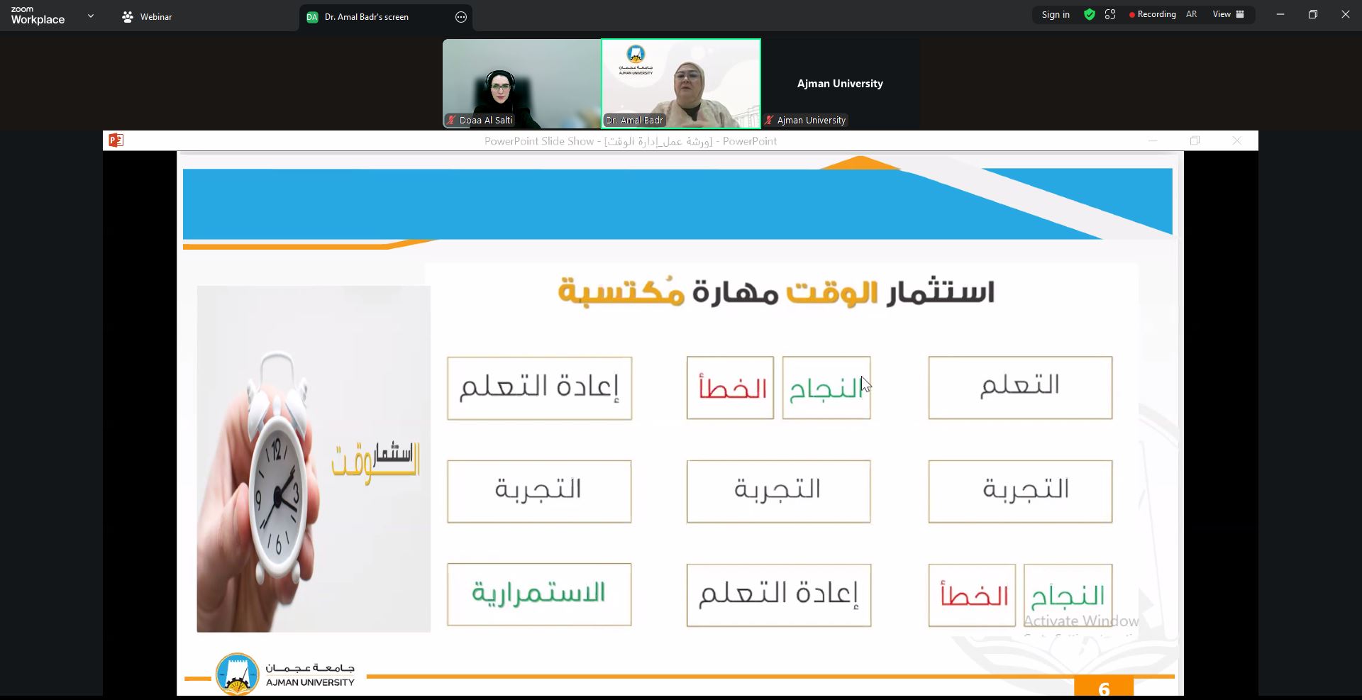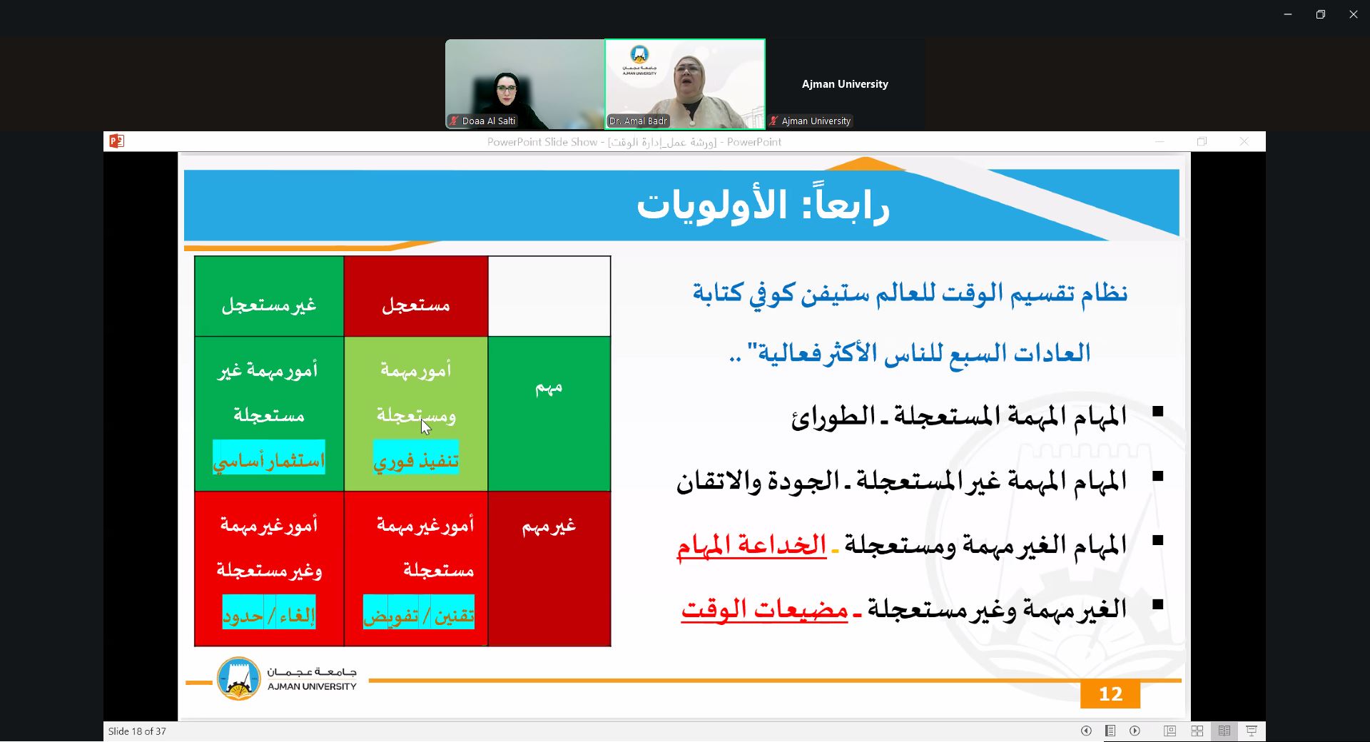 On September 24, 2025, the Counseling Unit held a webinar presented by Dr. Amal Badr, Associate Professor at the College of Mass Communication. The session focused on effective time management strategies, prioritization techniques, and methods to reduce procrastination. Dr. Amal provided practical tools for balancing academic responsibilities with personal commitments, helping students maximize productivity and maintain a healthier study-life balance.