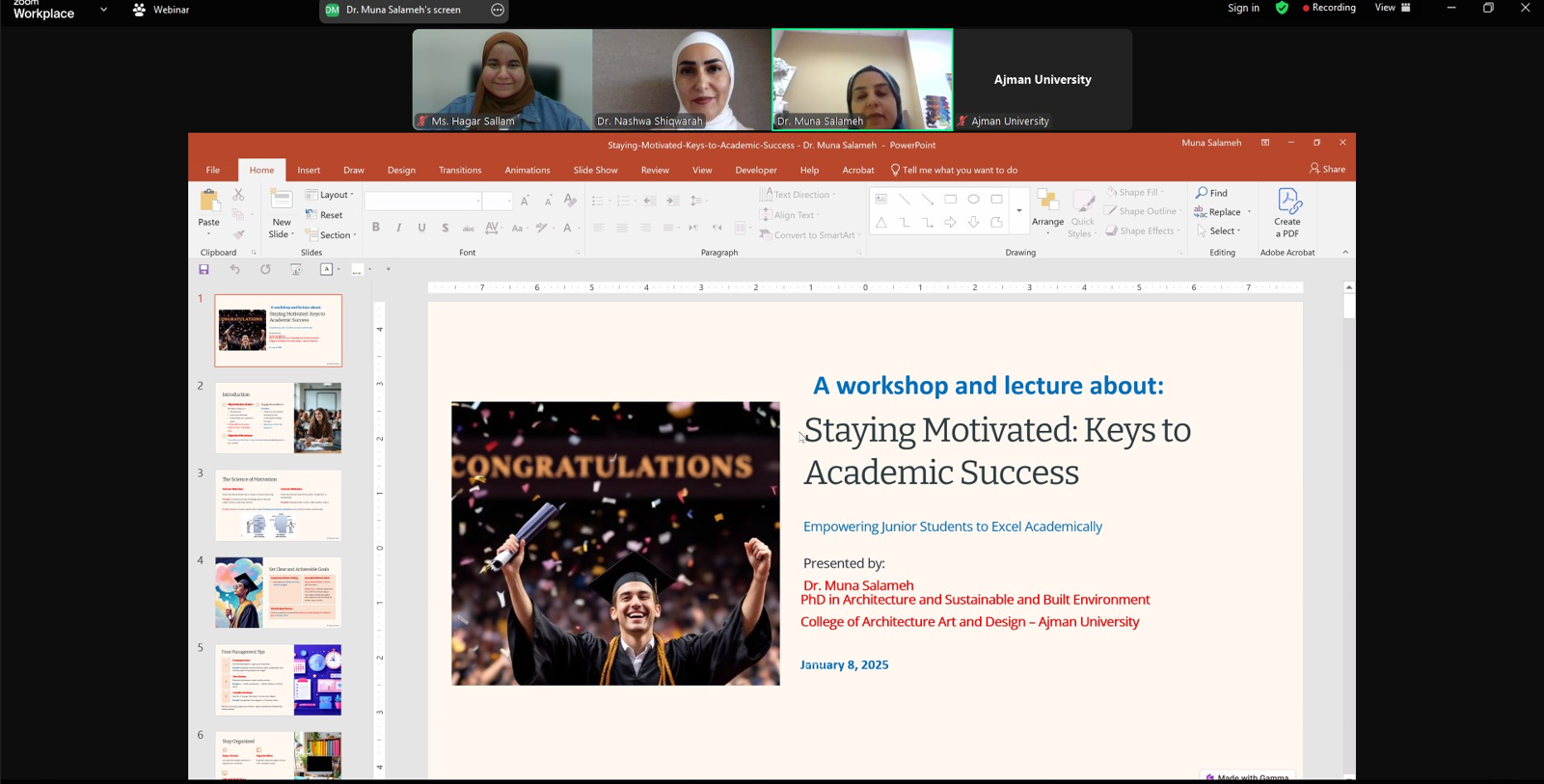 The Counseling Unit at Ajman University organized a webinar on February 12, 2025, featuring Dr. Muna Salameh from the College of Architecture, Art, and Design. The session explored the role of risk-taking in the creative process, emphasizing how failure can be a valuable learning experience in innovation. Moderated by Ms. Nashwa Shiqwarah, the discussion provided students with insights on overcoming fear of failure and fostering a mindset that embraces experimentation and growth. This initiative reflects the Counseling Unit’s commitment to nurturing creativity among students.