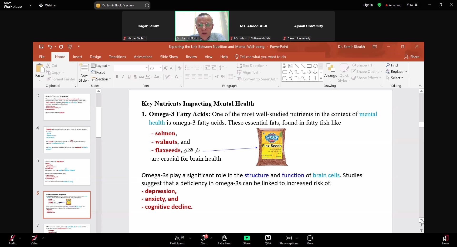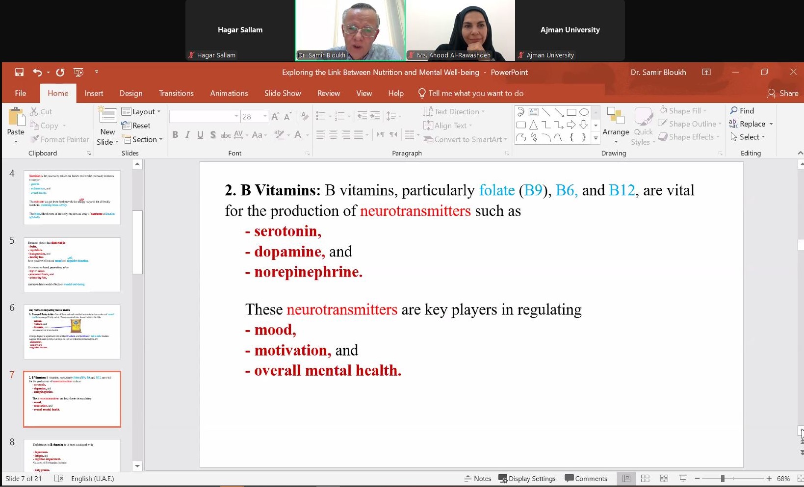 The Counseling Unit at Ajman University hosted an engaging webinar on January 30, 2025, led by Prof. Samir Bloukh from the College of Pharmacy and Health Sciences, with Ms. Ahood Al Rawashdeh from the College of Humanities and Sciences as the moderator. The event explored the important relationship between nutrition and mental health, offering valuable insights on how diet can impact emotional and cognitive well-being. This initiative reflects the Counseling Unit’s ongoing commitment to enhancing awareness and promoting holistic approaches to well-being within the university community.