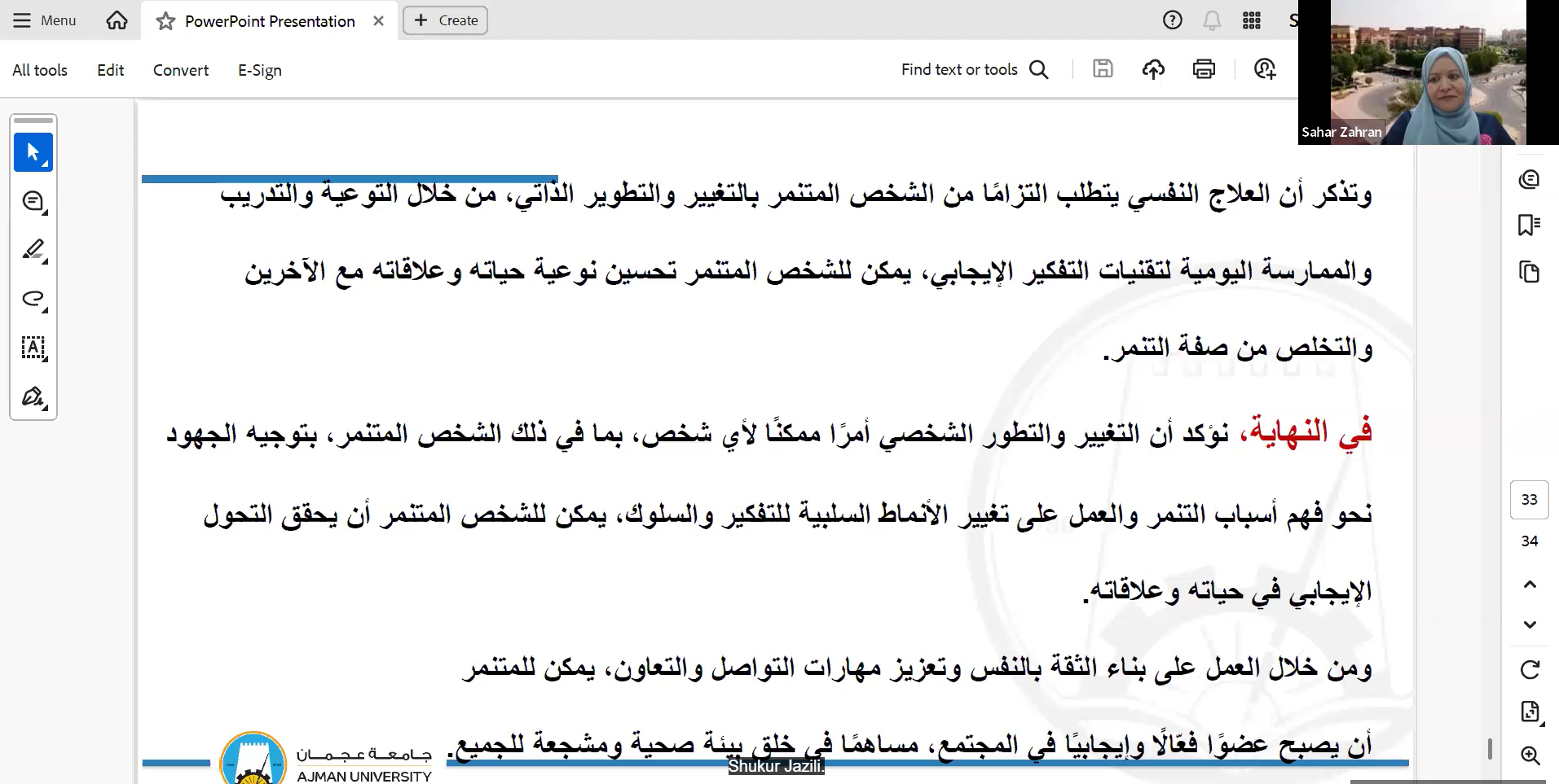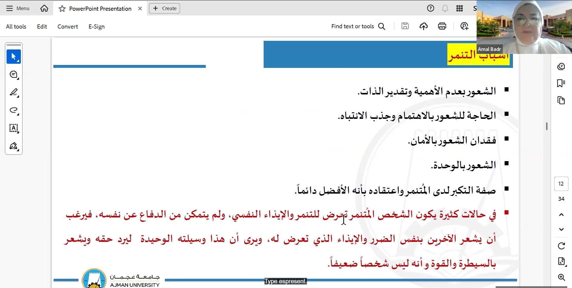 The Counseling Unit at Ajman University organized a webinar on January 29, 2025, presented by Dr. Amal Bader, an Associate Professor from the College of Mass Communication, with Ms. Sahar Zahran from the College of Humanities and Sciences as the moderator. The session focused on strategies for combating bullying and emphasized the importance of creating a supportive and safe environment. This initiative was part of the Counseling Unit’s efforts to raise awareness about bullying and foster a more inclusive university community.