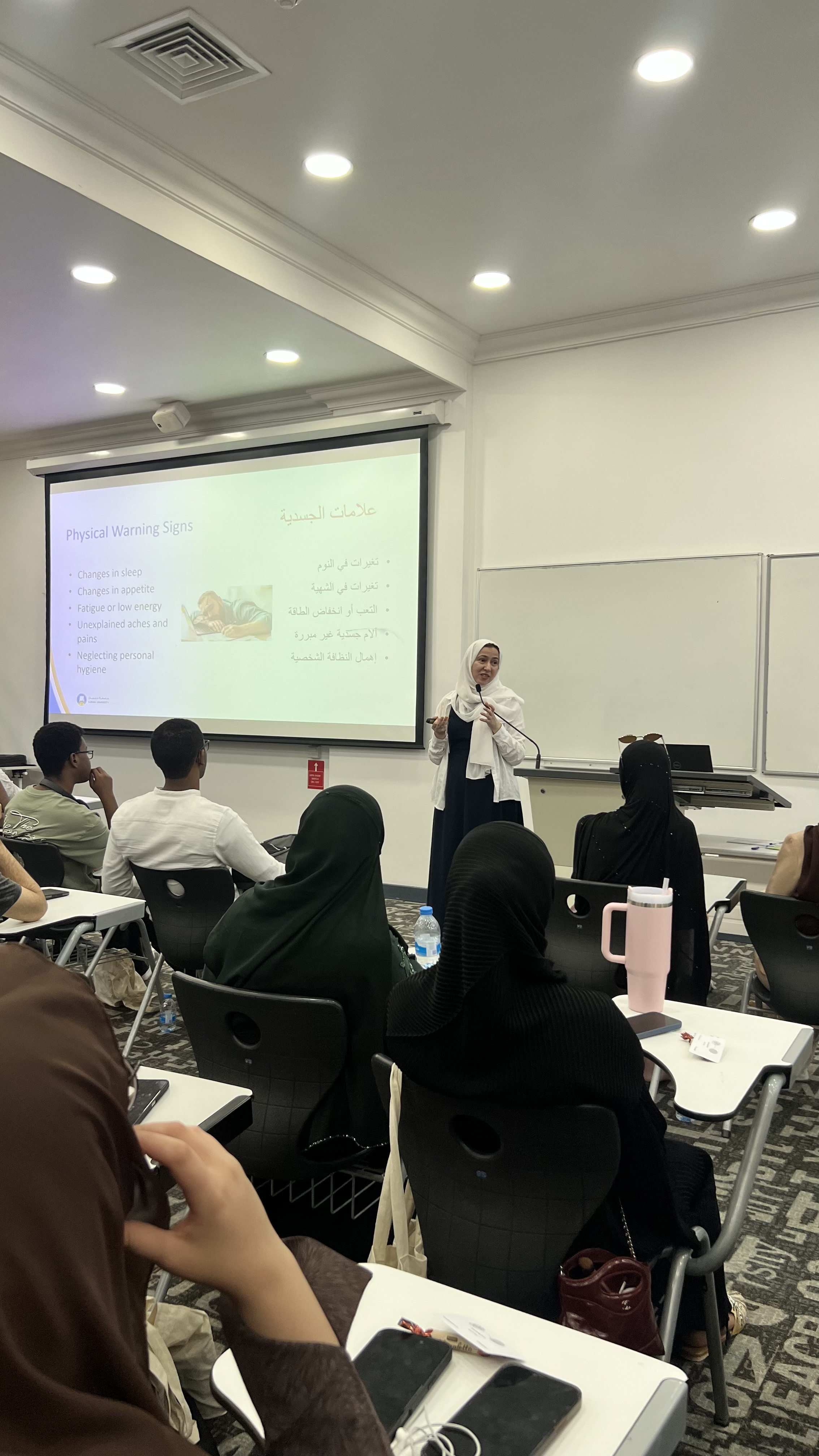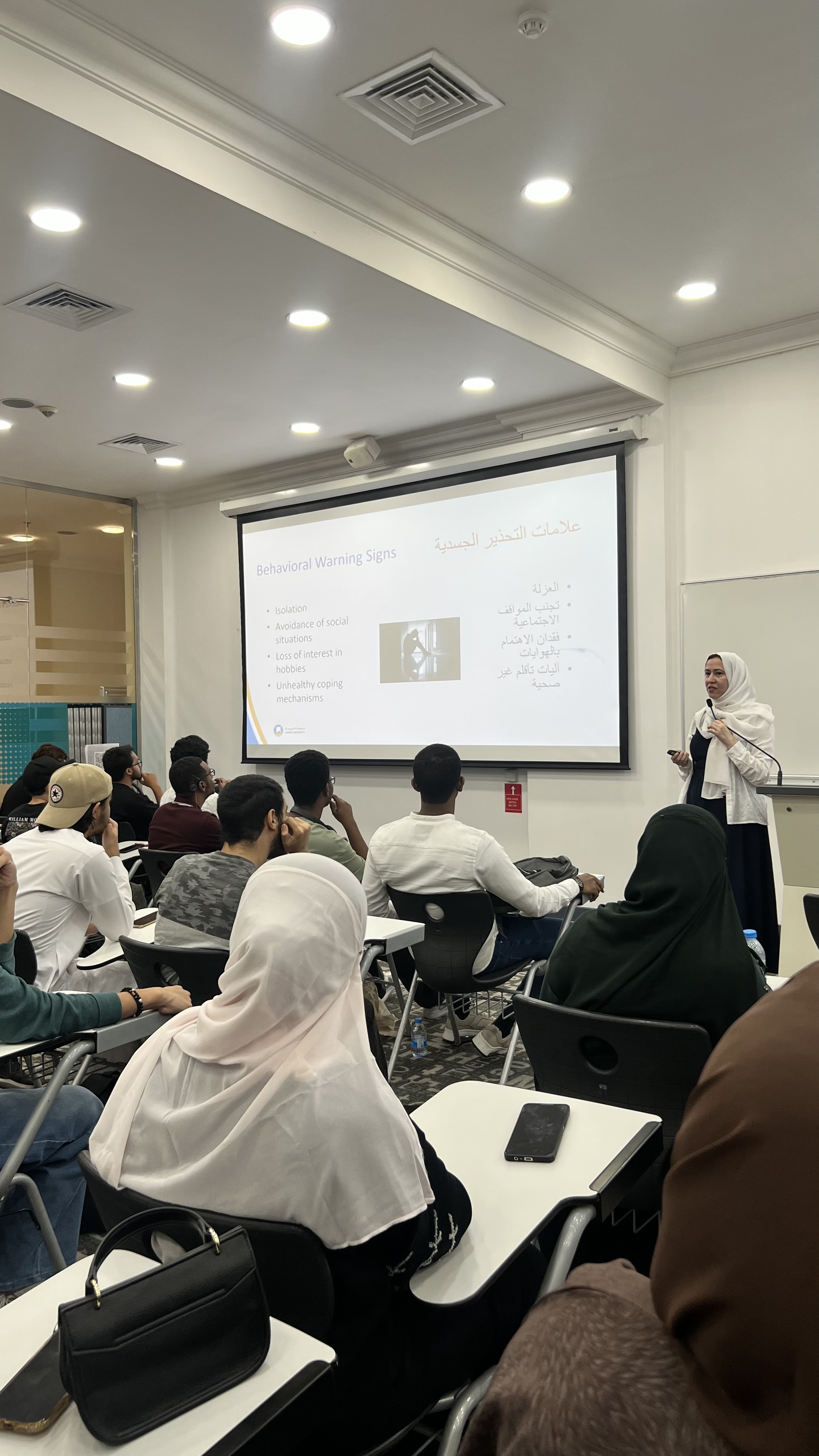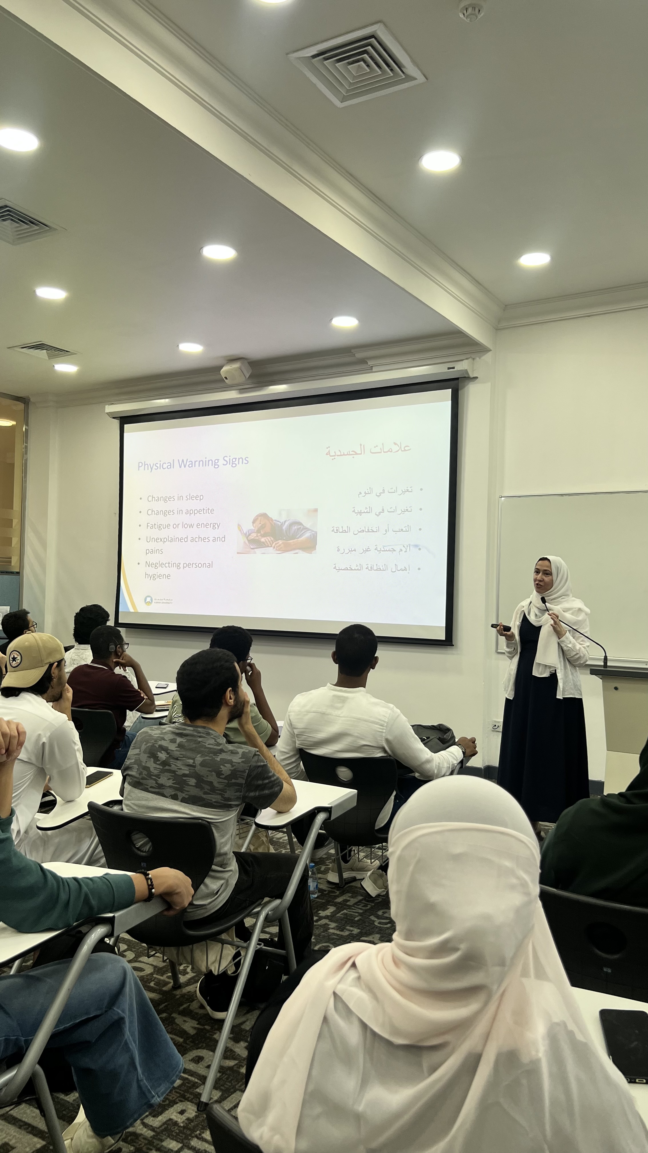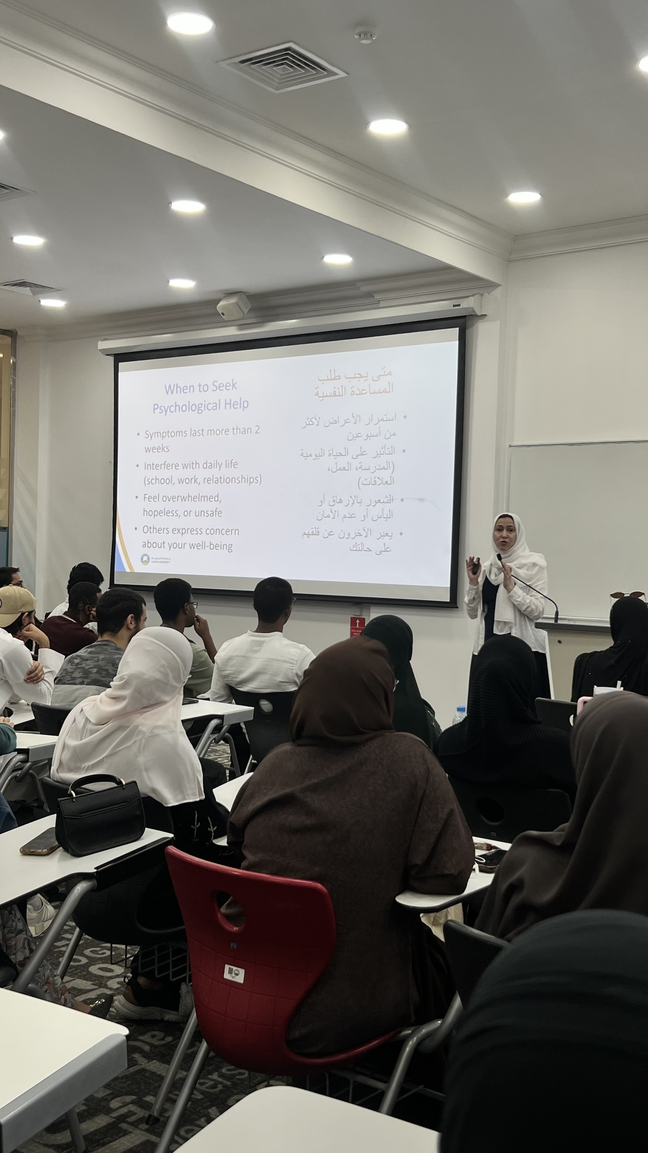On August 18, 2025, the Counseling Unit, in collaboration with the Center for Inclusive Learning, organized a workshop presented by Ms. Samah Abusniemah, Psychological Counselor. The session focused on the importance of seeking support, available campus resources, and recognizing when to ask for help. Ms. Abusniemah encouraged students to be proactive about their mental health and provided guidance on where to access counseling and academic support services.