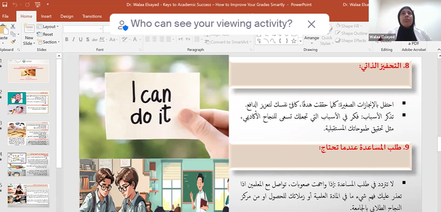 عقد مركز النجاح الطلابي، بالتعاون مع الدكتورة ولاء السيد من كلية العلوم الإنسانية، ندوة عبر الإنترنت بعنوان "مفاتيح النجاح الأكاديمي: كيف تحسن درجاتك بذكاء".