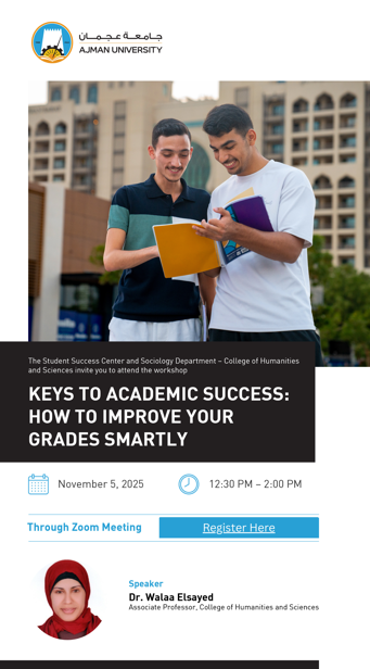 The Student Success Center, in collaboration with Dr. Walaa El-Sayed from the College of Humanities and Sciences, held a webinar titled “Keys to Academic Success: How to Improve Your Grades Smartly.”