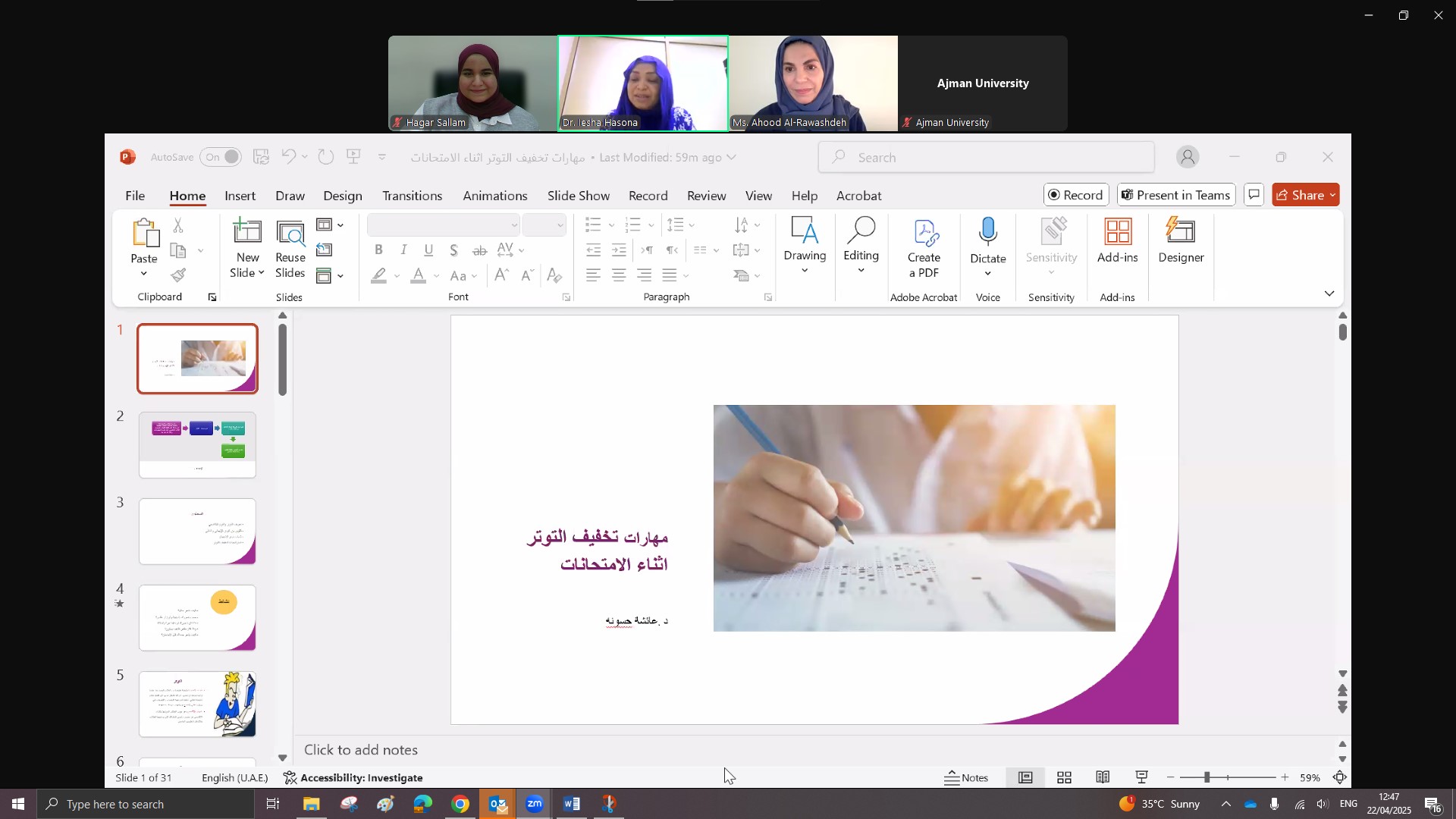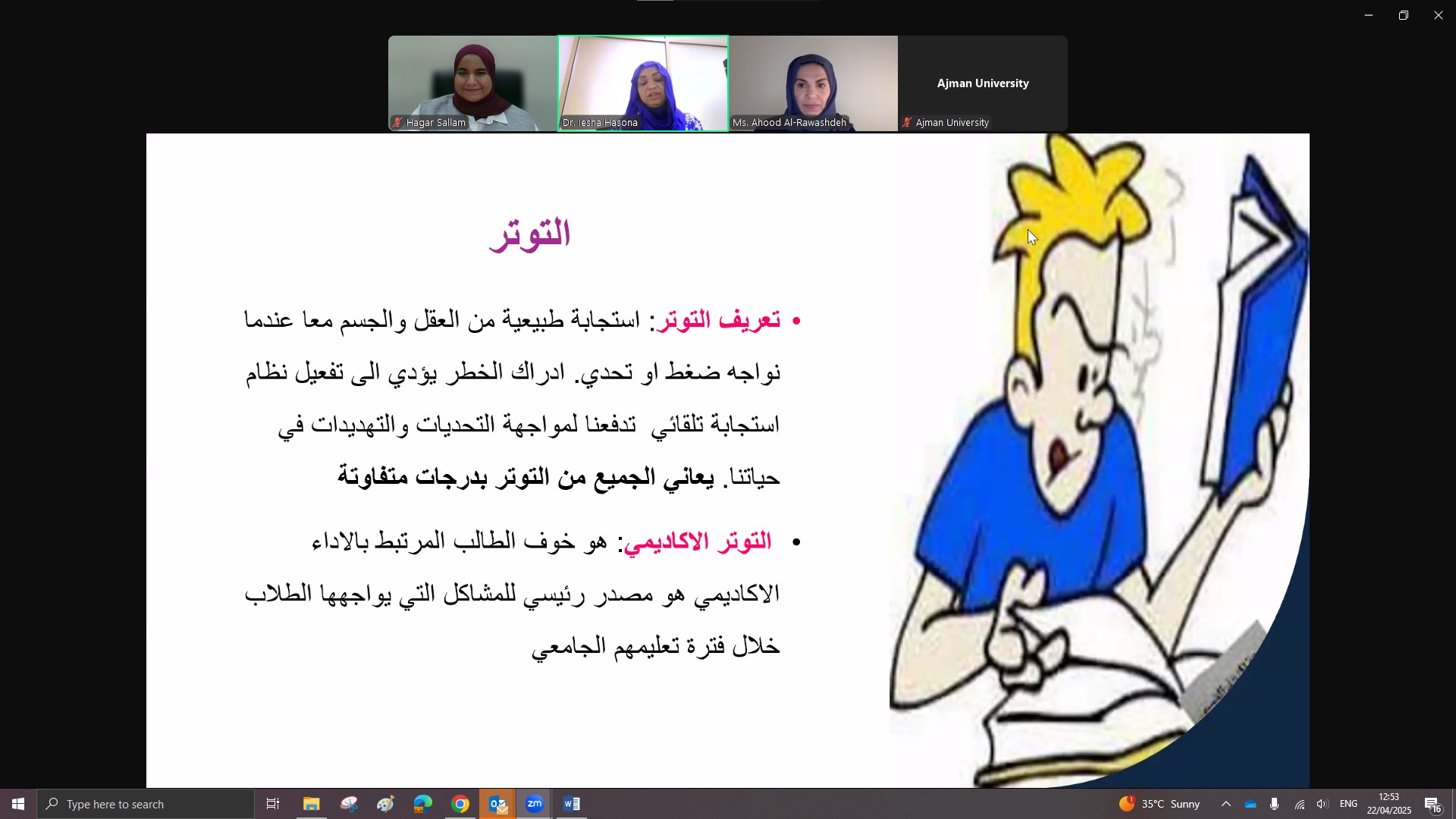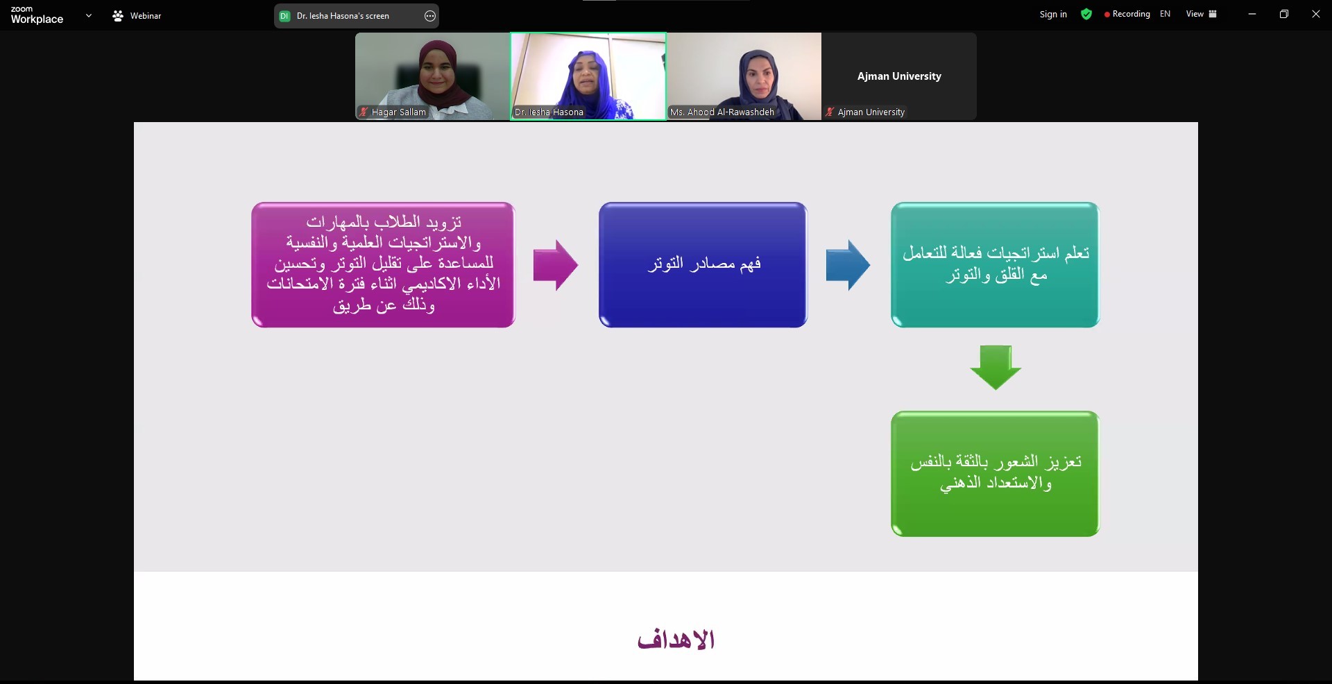 The Counseling Unit at Ajman University organized a session titled "Let’s Make Exams Less Stressful" on April 22, 2025. The session was delivered by Dr. Iesha Hasona from the College of Humanities and Sciences and moderated by Ms. Ahood Al Rawashdeh from the College of Humanities and Sciences. The session aimed to provide effective strategies for managing exam-related stress and to support students in enhancing their well-being and academic performance. This initiative reflects the Counseling Unit’s ongoing commitment to fostering a supportive and healthy university environment.