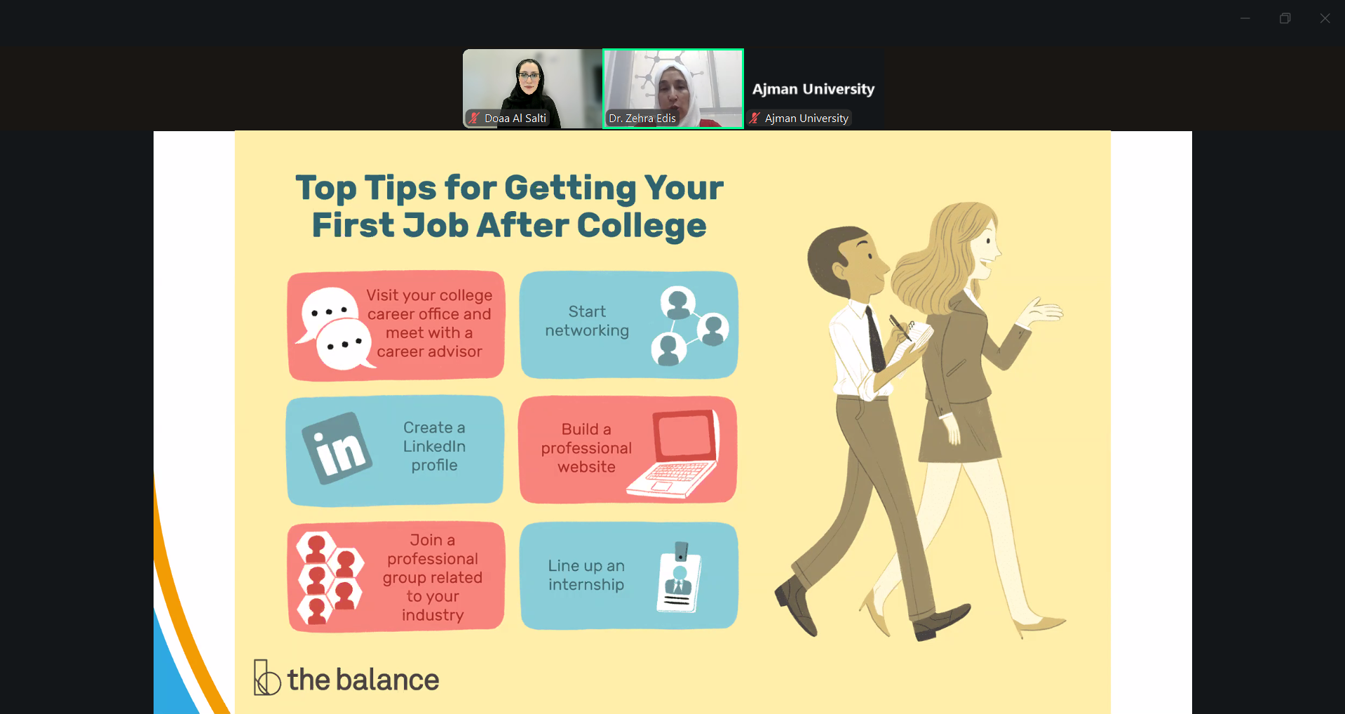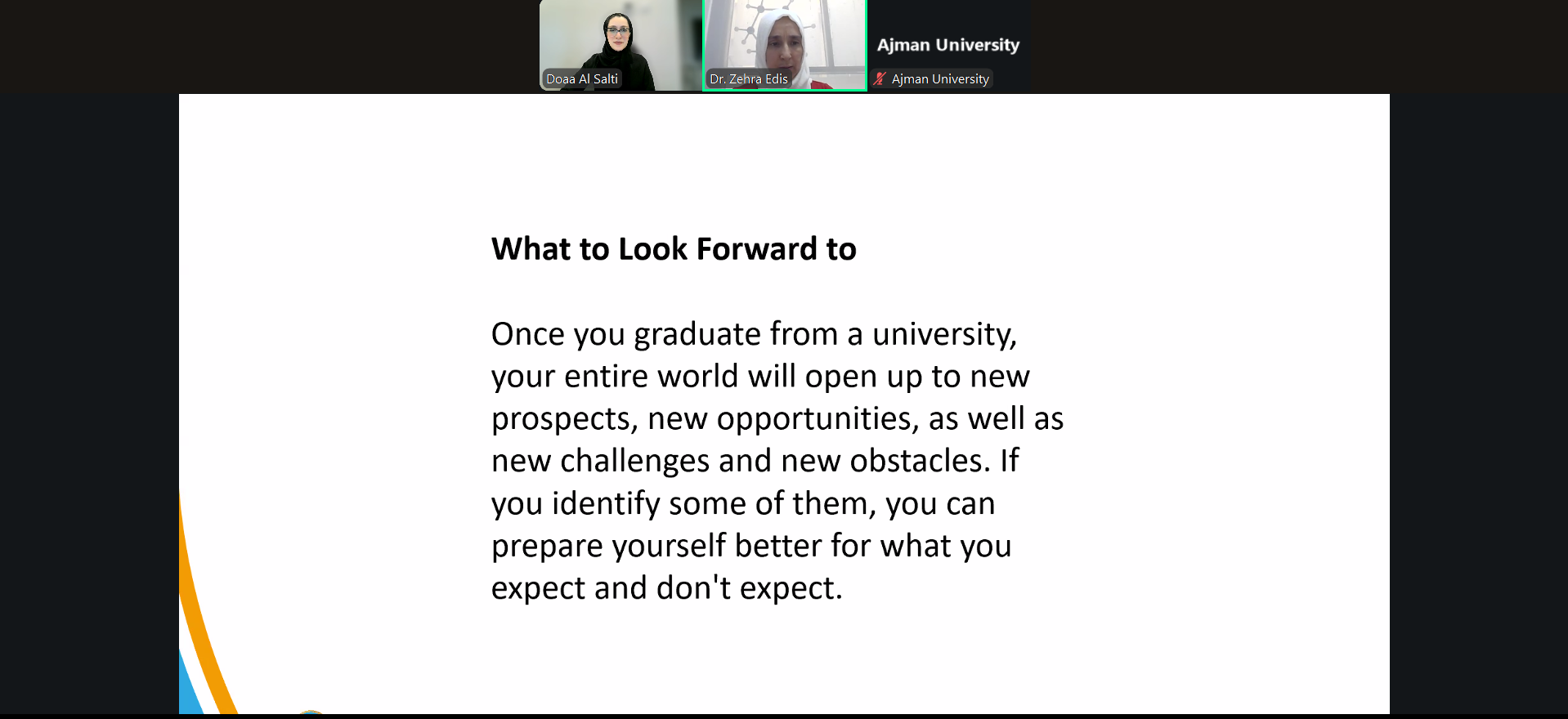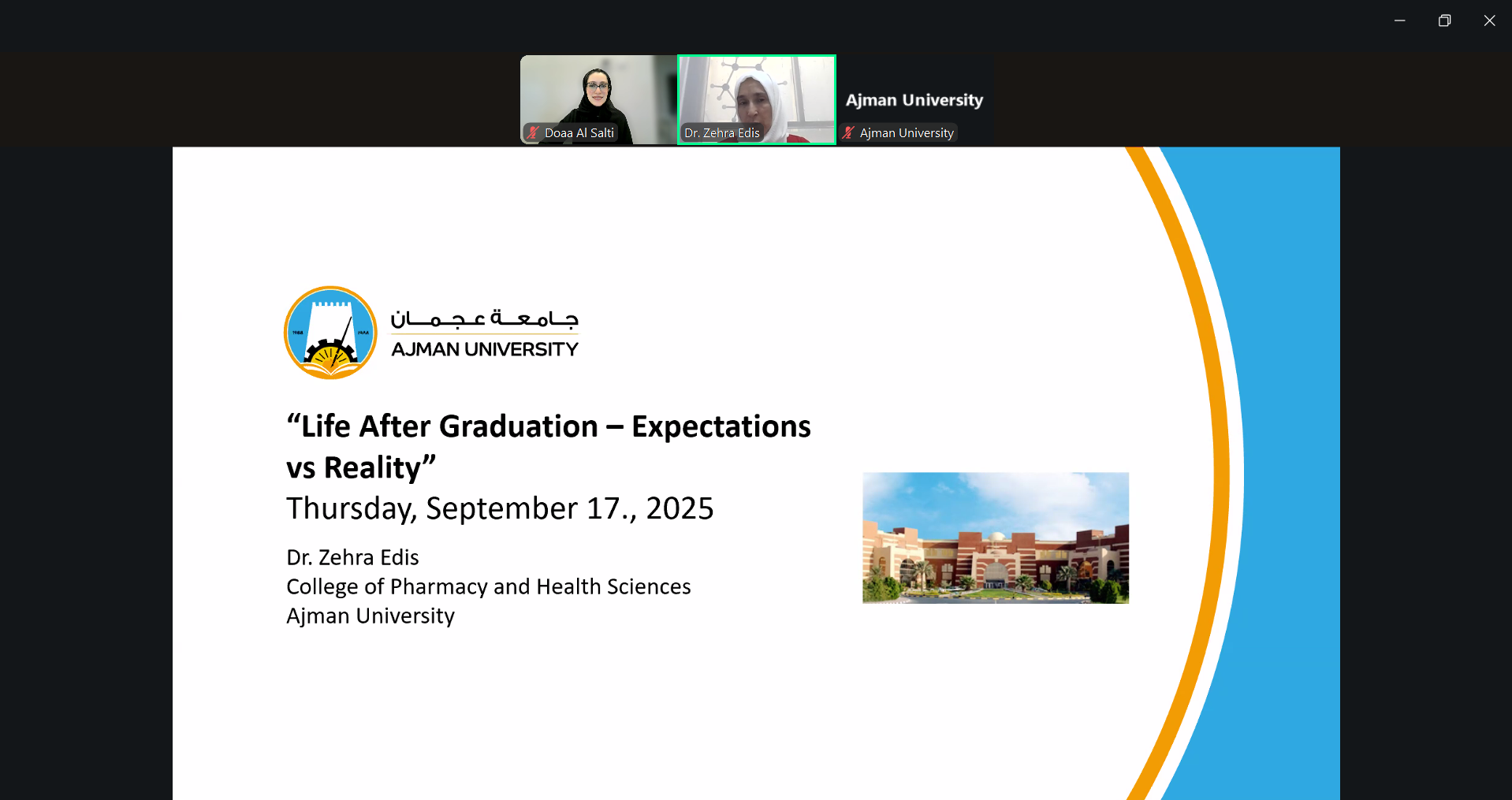 On September 18, 2025, the Counseling Unit hosted a webinar with Dr. Zehra Edis, Associate Professor at the College of Pharmacy and Health Sciences. The discussion explored the gap between students’ expectations and the realities of life after graduation. Dr. Zehra highlighted the importance of adaptability, continuous learning, and resilience when facing new professional and personal challenges. Students were encouraged to prepare proactively for the transition from university to the workplace.