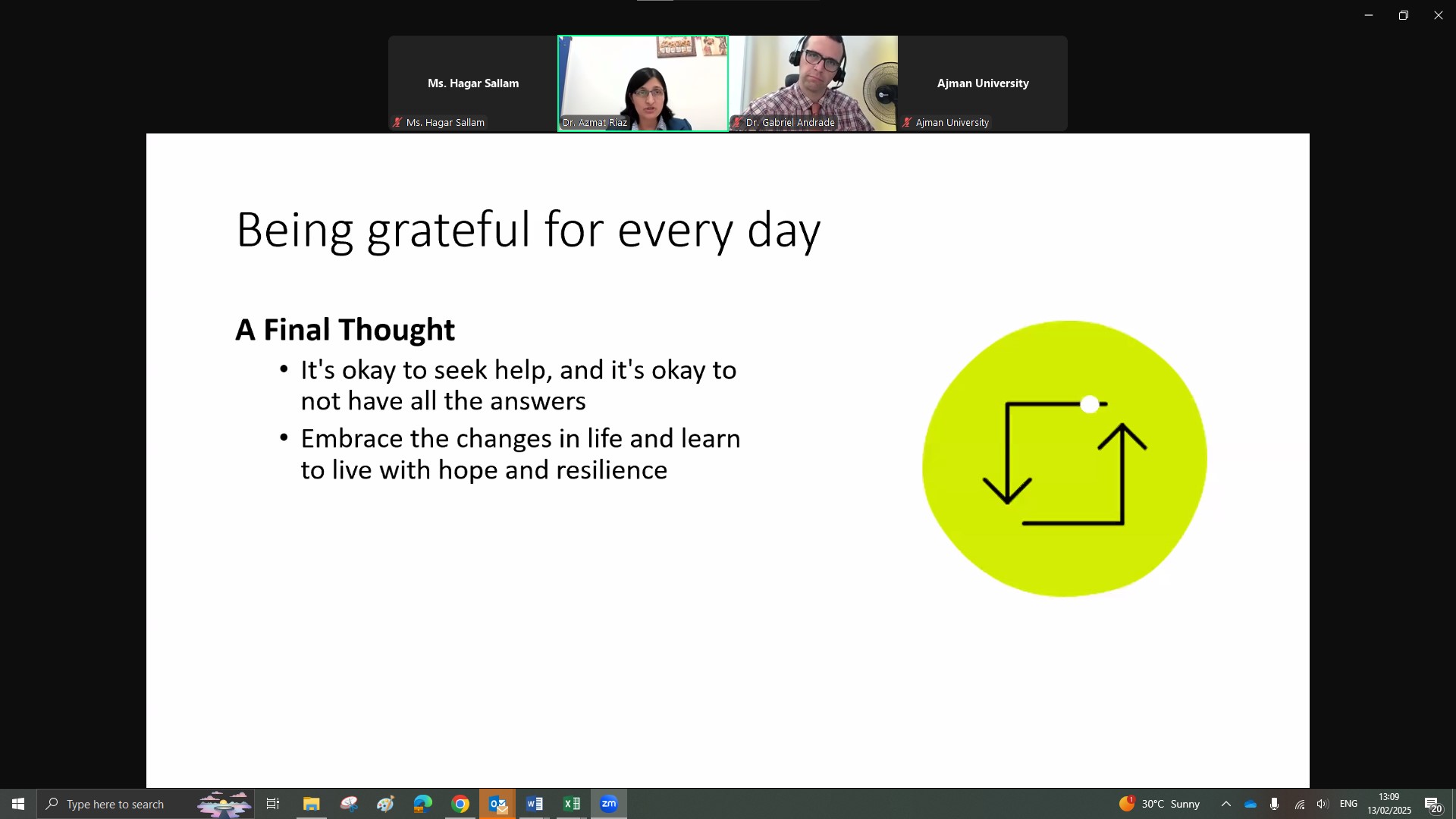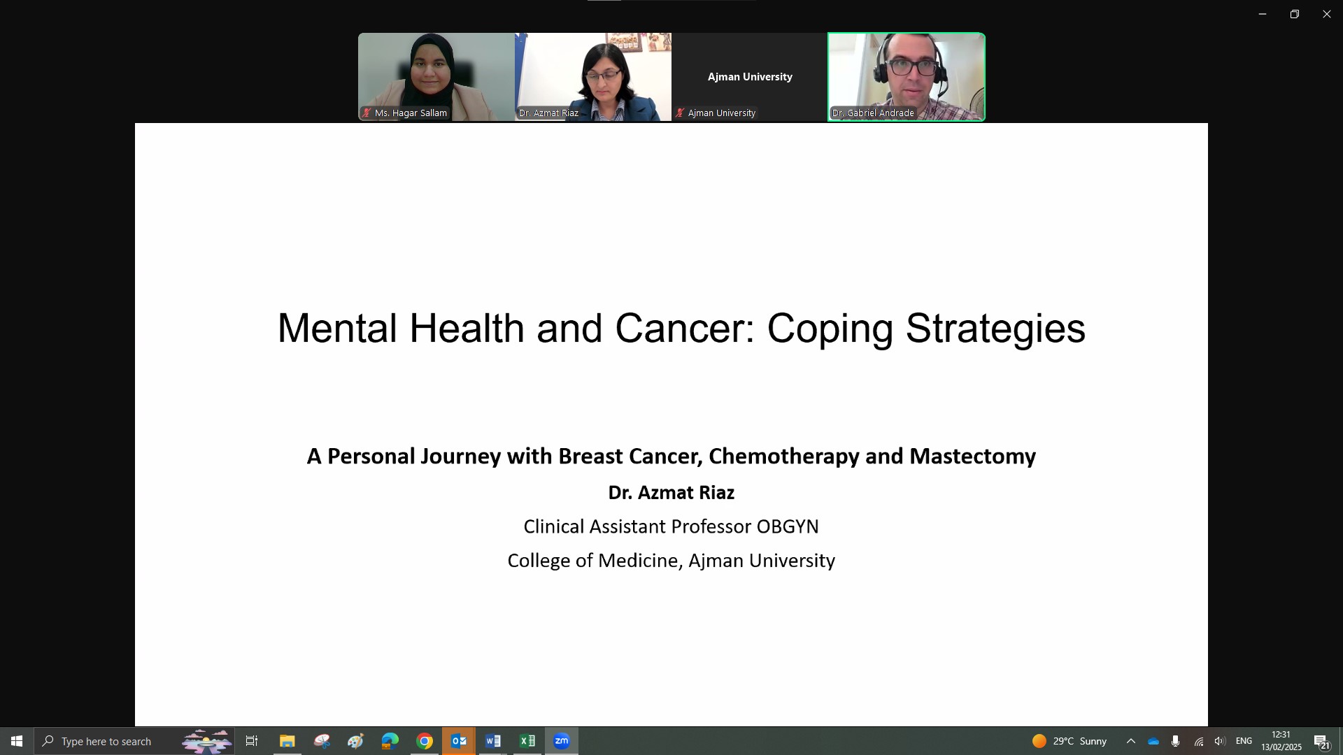 The Counseling Unit at Ajman University organized a webinar on February 13, 2025, featuring Dr. Azmat Riaz from the College of Medicine. The session focused on the psychological challenges faced by individuals affected by cancer and provided effective coping strategies to support mental well-being. Moderated by Dr. Gabriel Andrade, the discussion highlighted the importance of emotional resilience, stress management, and seeking professional support. This initiative reflects the Counseling Unit’s dedication to promoting mental health awareness and offering valuable resources for those navigating difficult life circumstances.