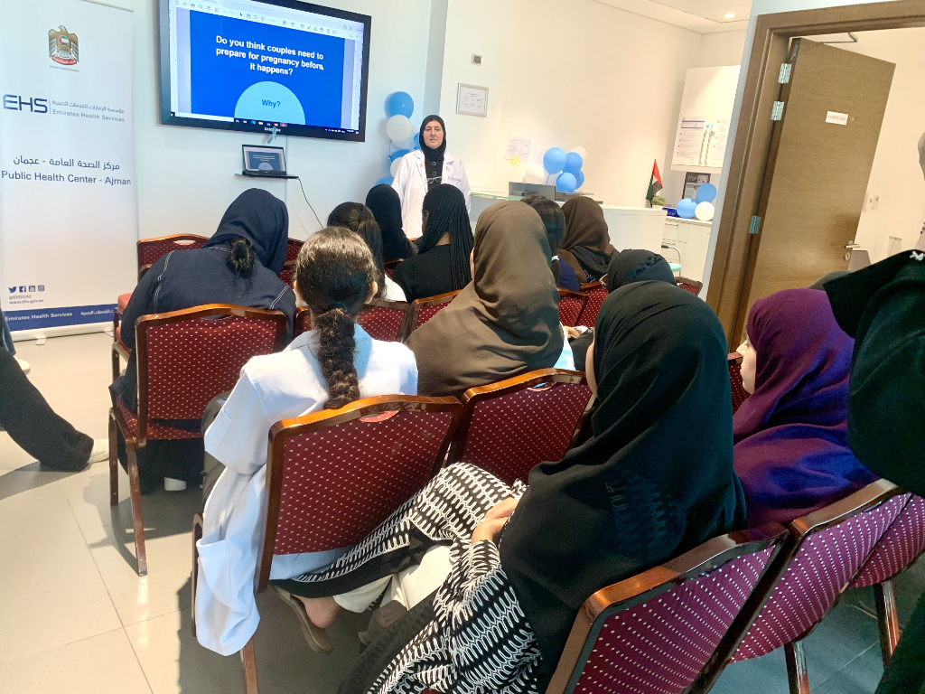 In collaboration with Emirates Health Services (EHS), the Office of Medical Services at Ajman University proudly hosted an awareness session as part of the National Preconception Care Campaign on 11.11.2025 at 11 am. This initiative is designed to empower female university students with knowledge about maintaining optimal health and wellness before pregnancy, ensuring safer pregnancies and healthier infants. We were honored to have Dr. Lujain Muteb Abdulkrim, Family Physician at the Ministry of Health (MOH), who shared valuable insights on the importance of early preparation for motherhood.