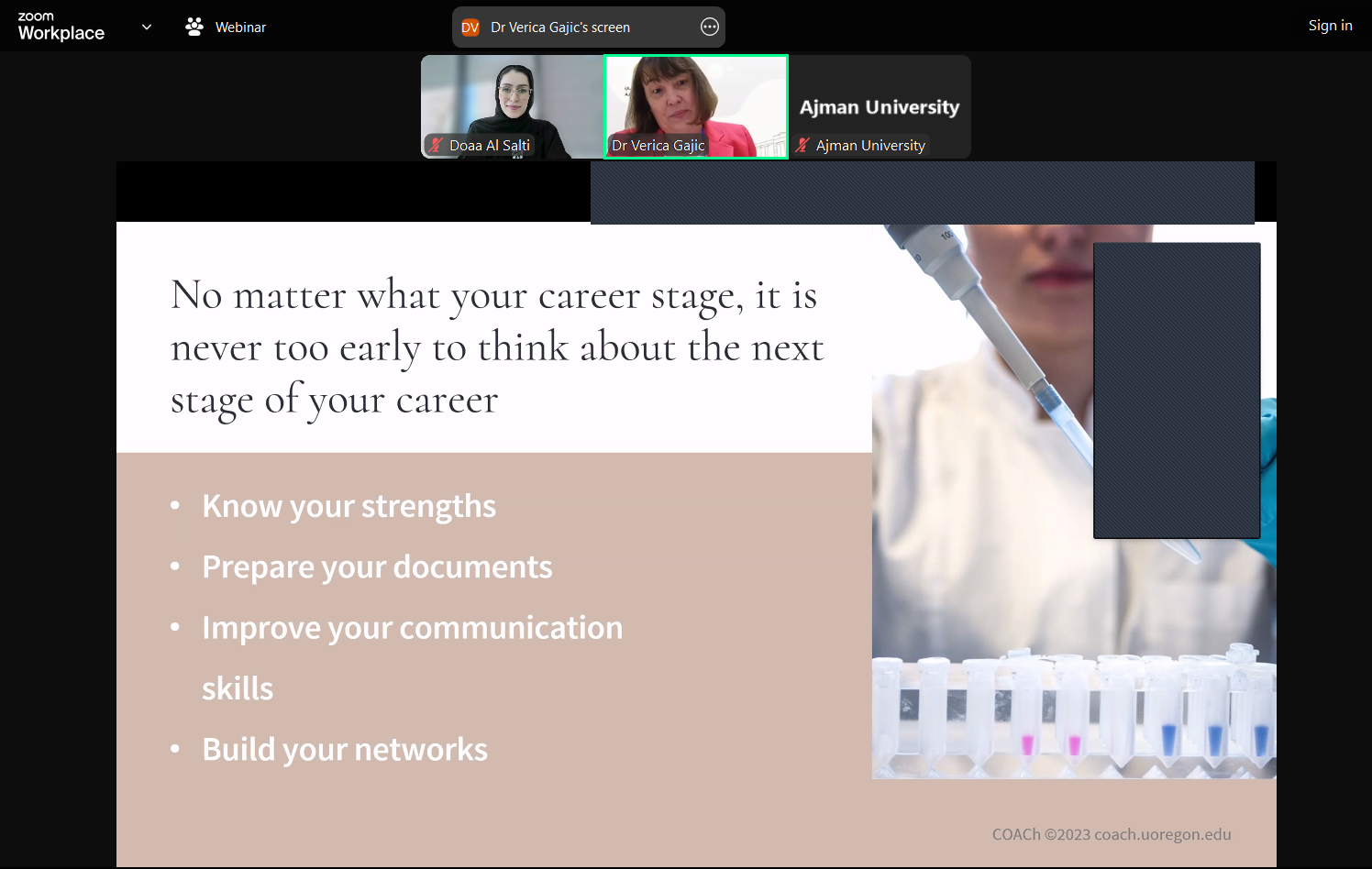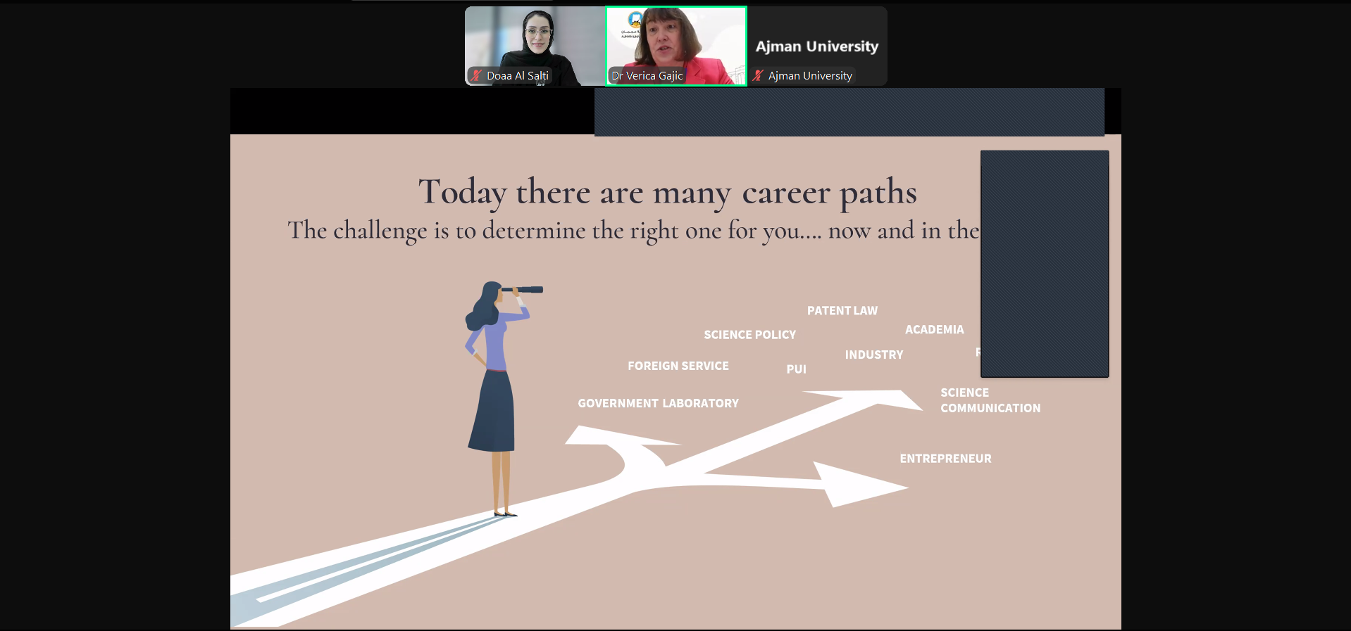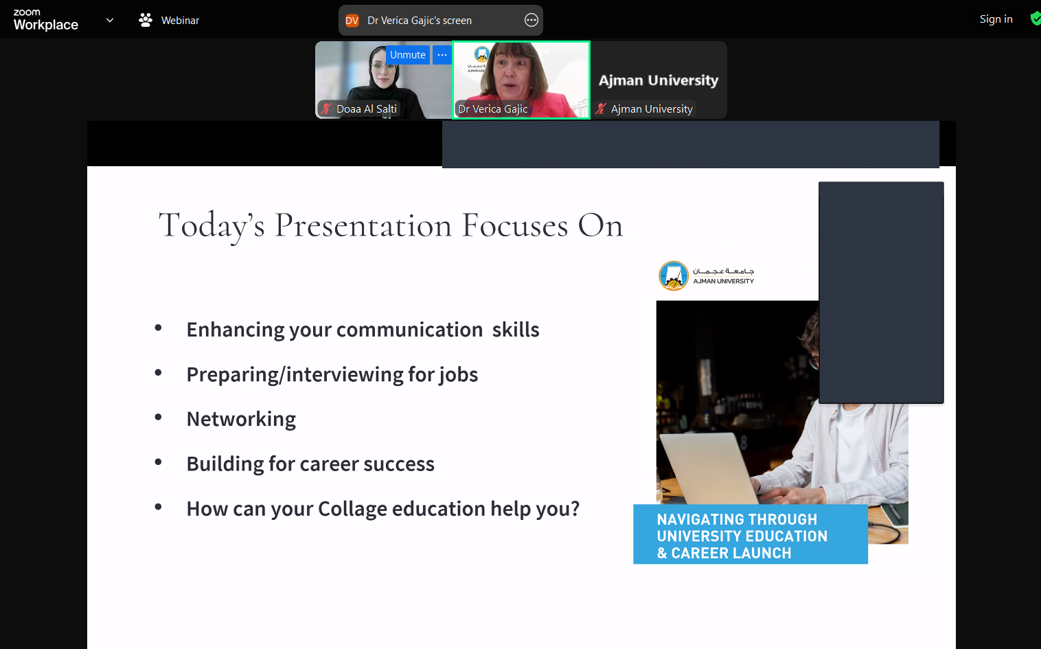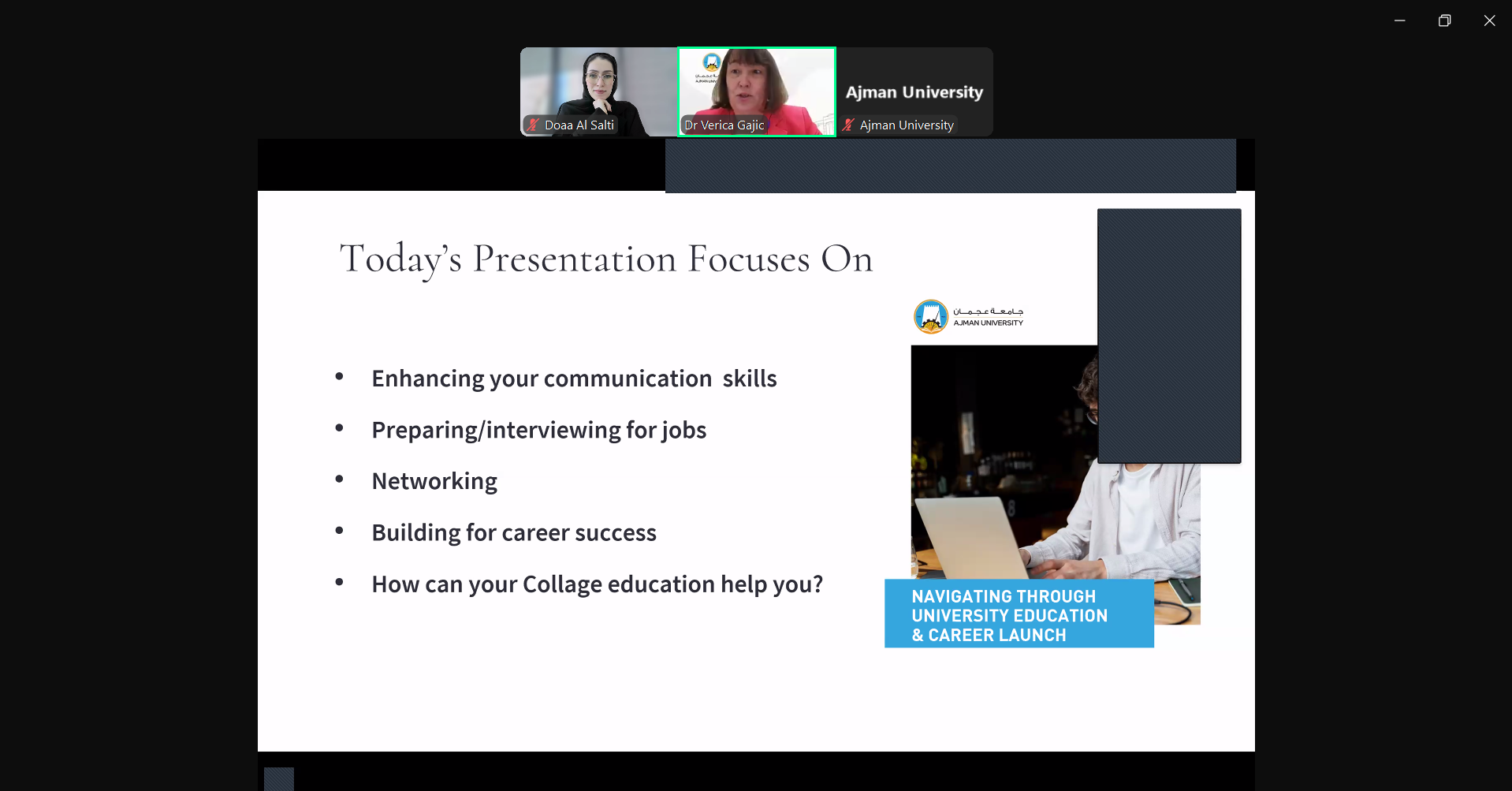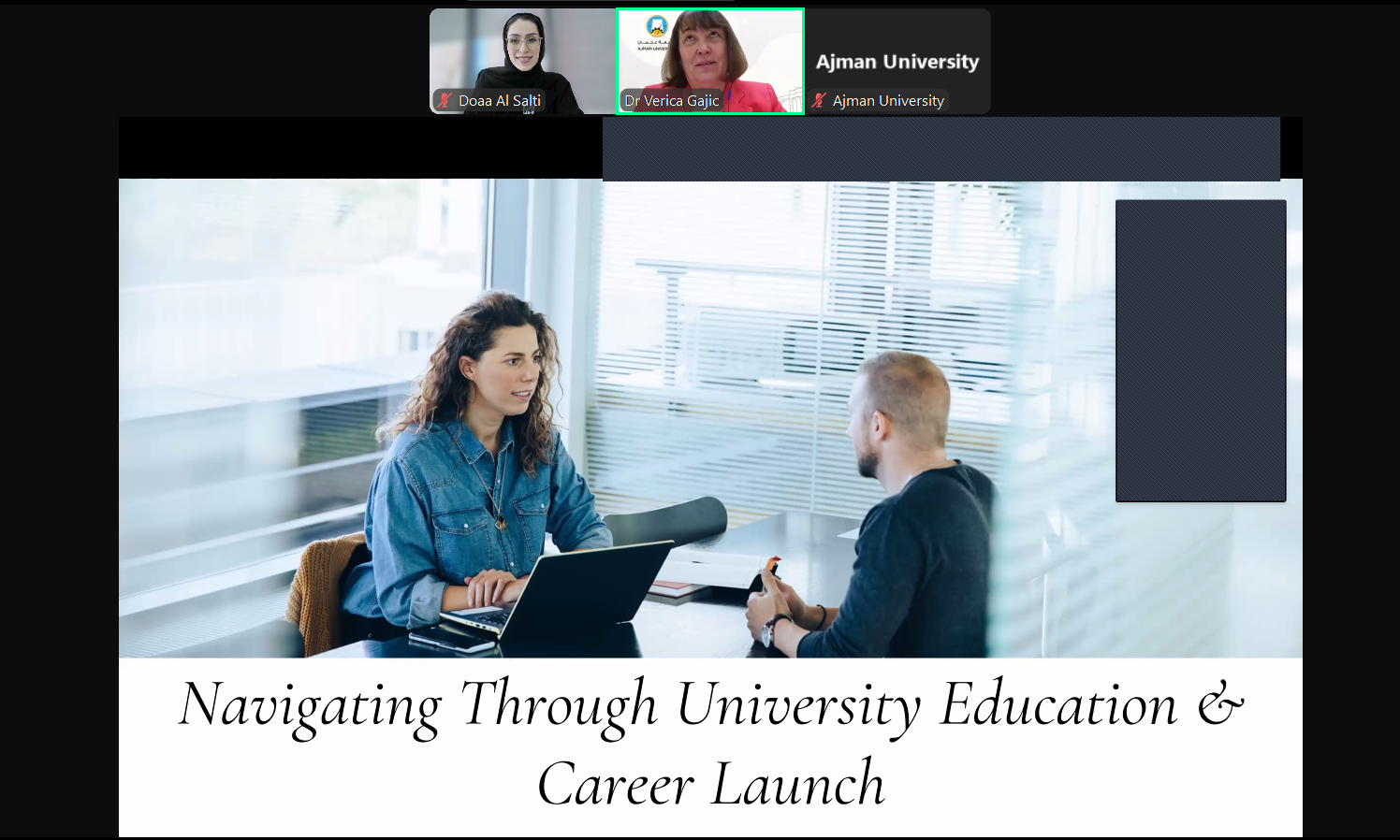 The Counseling Unit at Ajman University organized an insightful session on Thursday, April 24, 2025. The session was delivered by Dr. Verica Gajic from the College of Engineering and Information Technology and moderated by Ms. Doaa Al Salti, Administrative Assistant at the Counseling Unit. The session aimed to guide students through the challenges of university life while equipping them with the tools needed for a successful career launch. It reflected the Counseling Unit’s continued commitment to supporting students in both their academic and professional journeys.