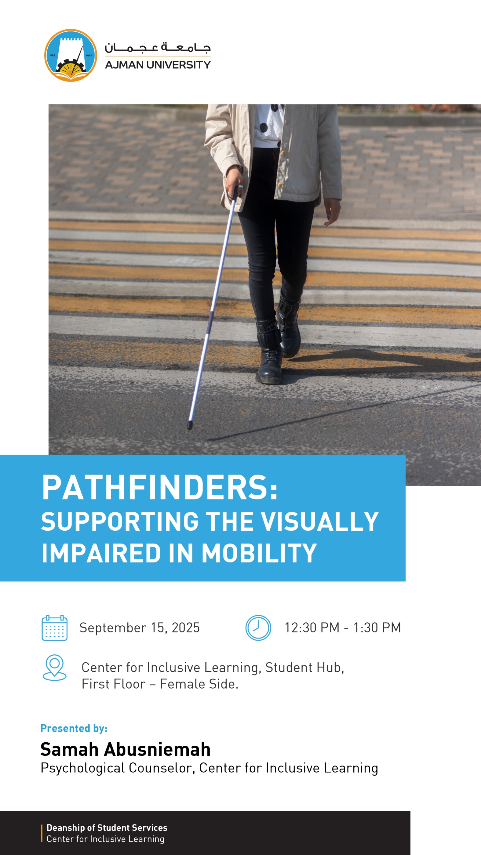 From September 15–18, 2025, the Center for Inclusive Learning launched the “Pathfinders” program to support students with visual impairments. The program equipped volunteers and fellow students with the knowledge and skills necessary to confidently and respectfully assist visually impaired peers, regardless of whether they use a white cane. By fostering independence, mobility, and inclusion across campus, the initiative underscored Ajman University’s commitment to accessibility and empowerment for all.
