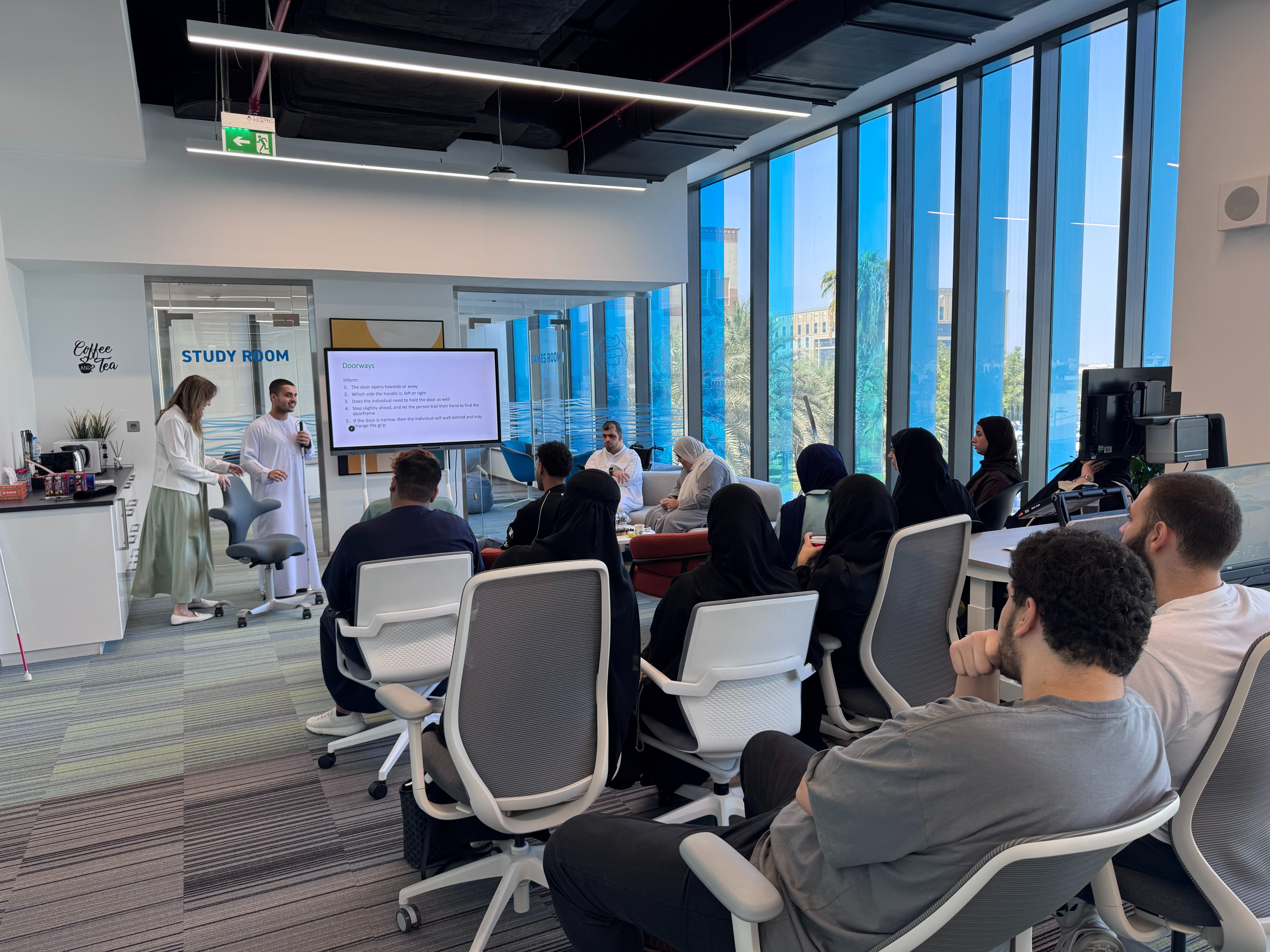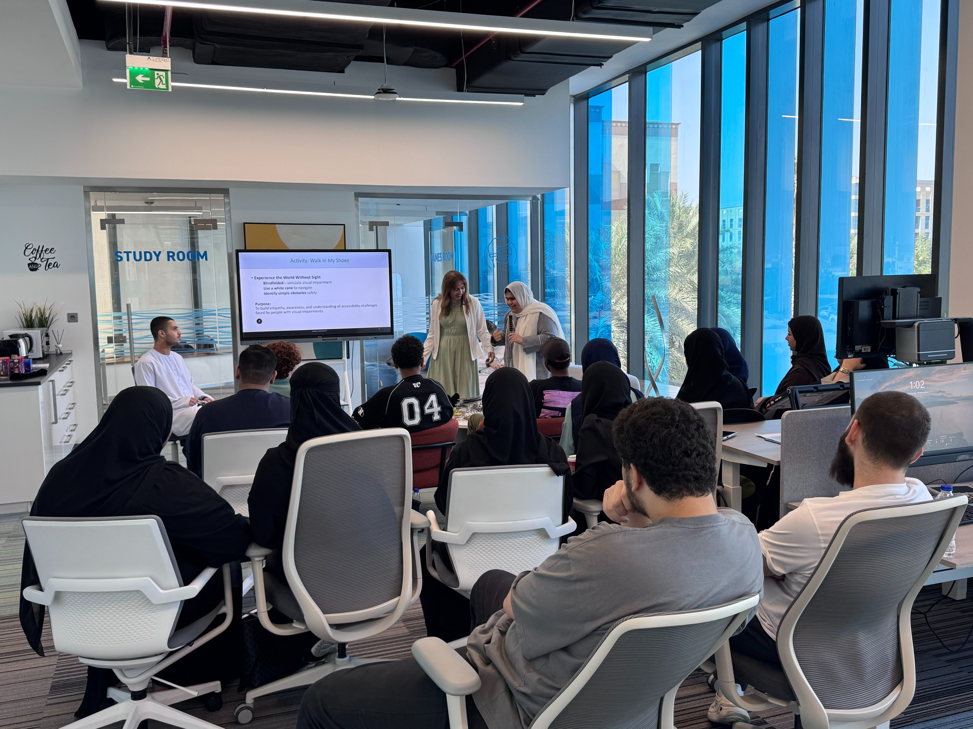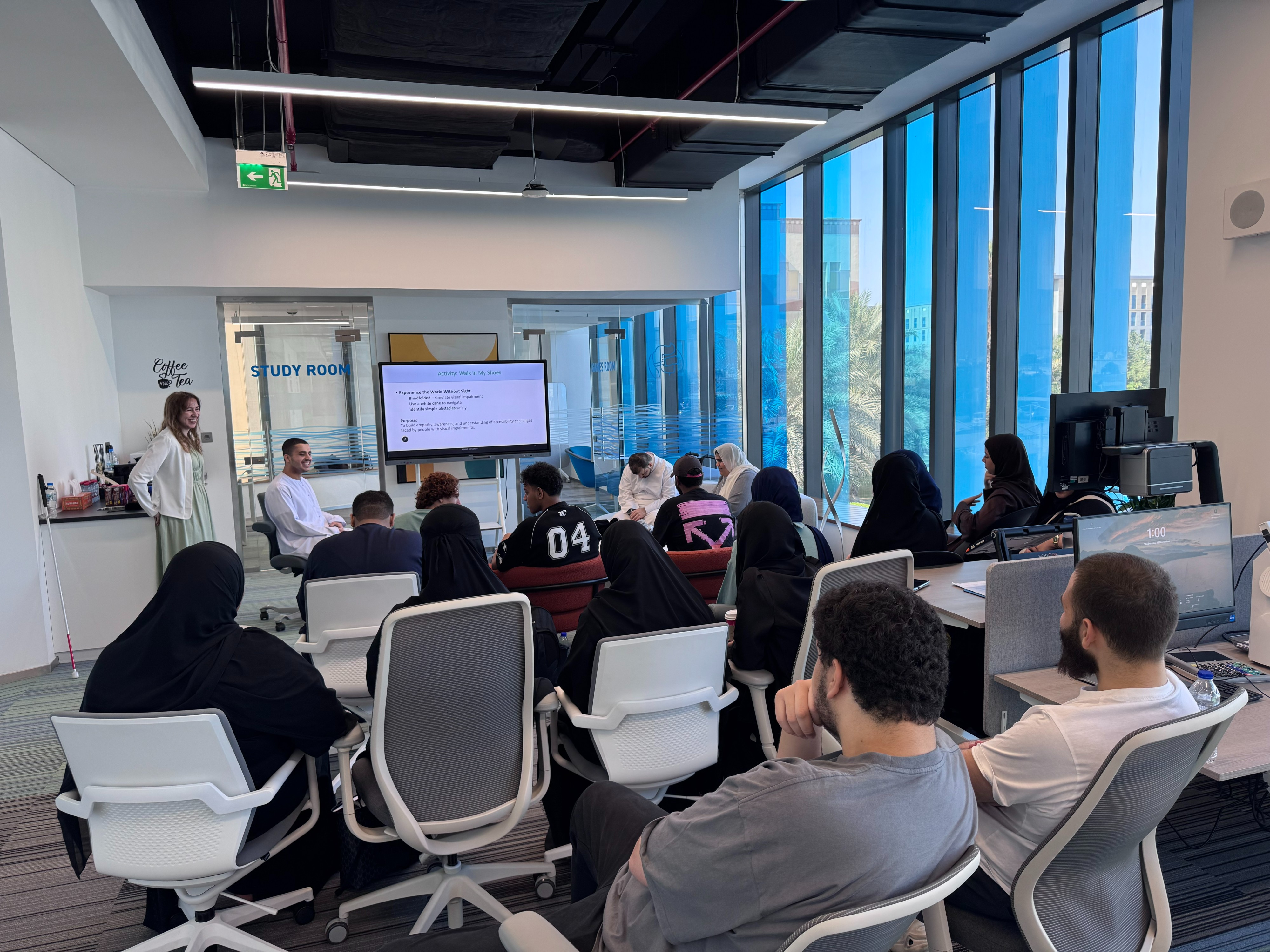 On November 19, 2025, the Center for Inclusive Learning proudly organized the workshop ‘Pathfinders: Supporting the Visually Disabled in Mobility,’ led by Ms. Samah Abusniemah, Psychological Counselor. This special session featured the participation of visually disabled students, who shared their lived experiences and demonstrated key mobility tools and techniques. The workshop aimed to raise awareness, foster empathy, and promote a deeper understanding of the challenges and strengths of students of determination, allowing attendees to learn directly from their peers.