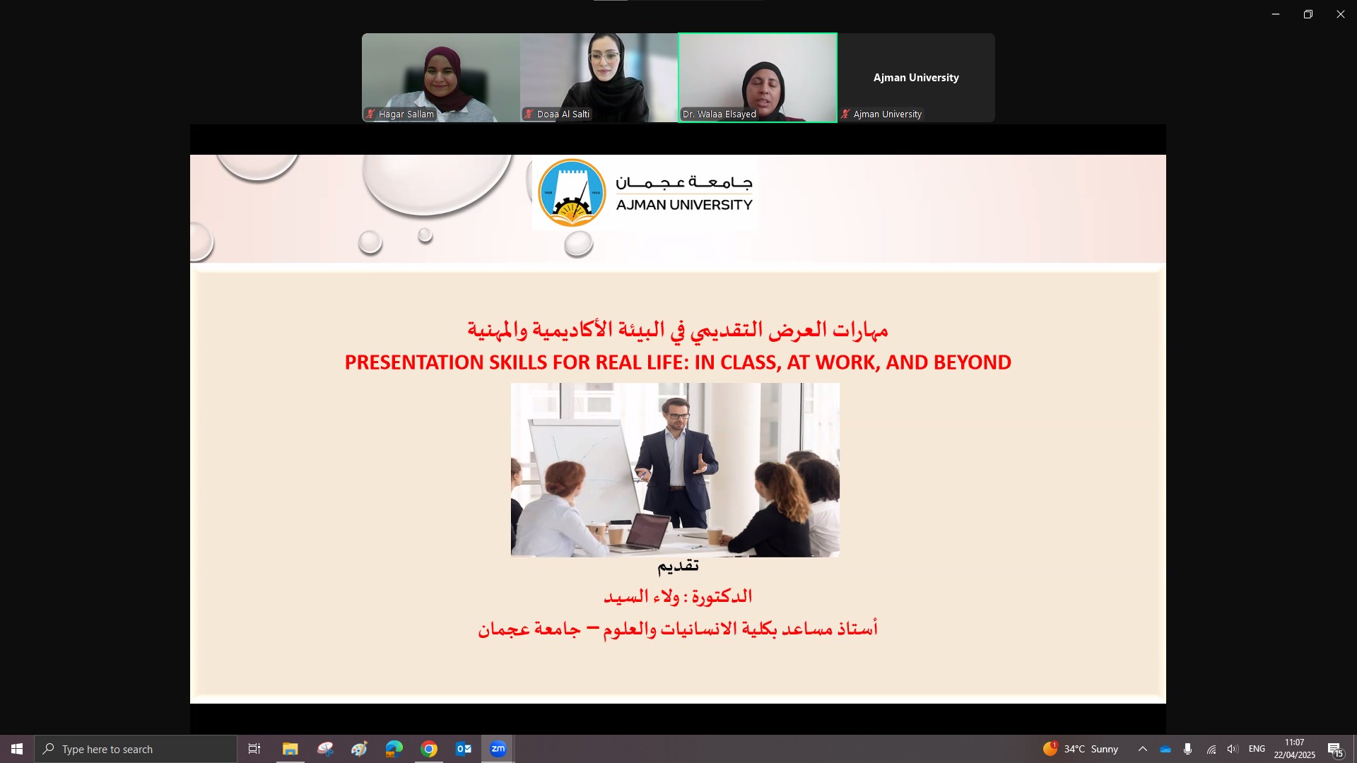 The Counseling Unit at Ajman University organized a session titled "Presentation Skills for Real Life: In Class, at Work, and Beyond" on April 22, 2025. The session was delivered by Dr. Walaa Elsayed from the College of Humanities and Sciences and moderated by Ms. Doaa Al Salti, Administrative Assistant at the Counseling Unit. It aimed to help students develop strong presentation skills applicable to academic settings, professional environments, and everyday interactions. This session is part of the Counseling Unit’s mission to empower students with essential life and communication skills.