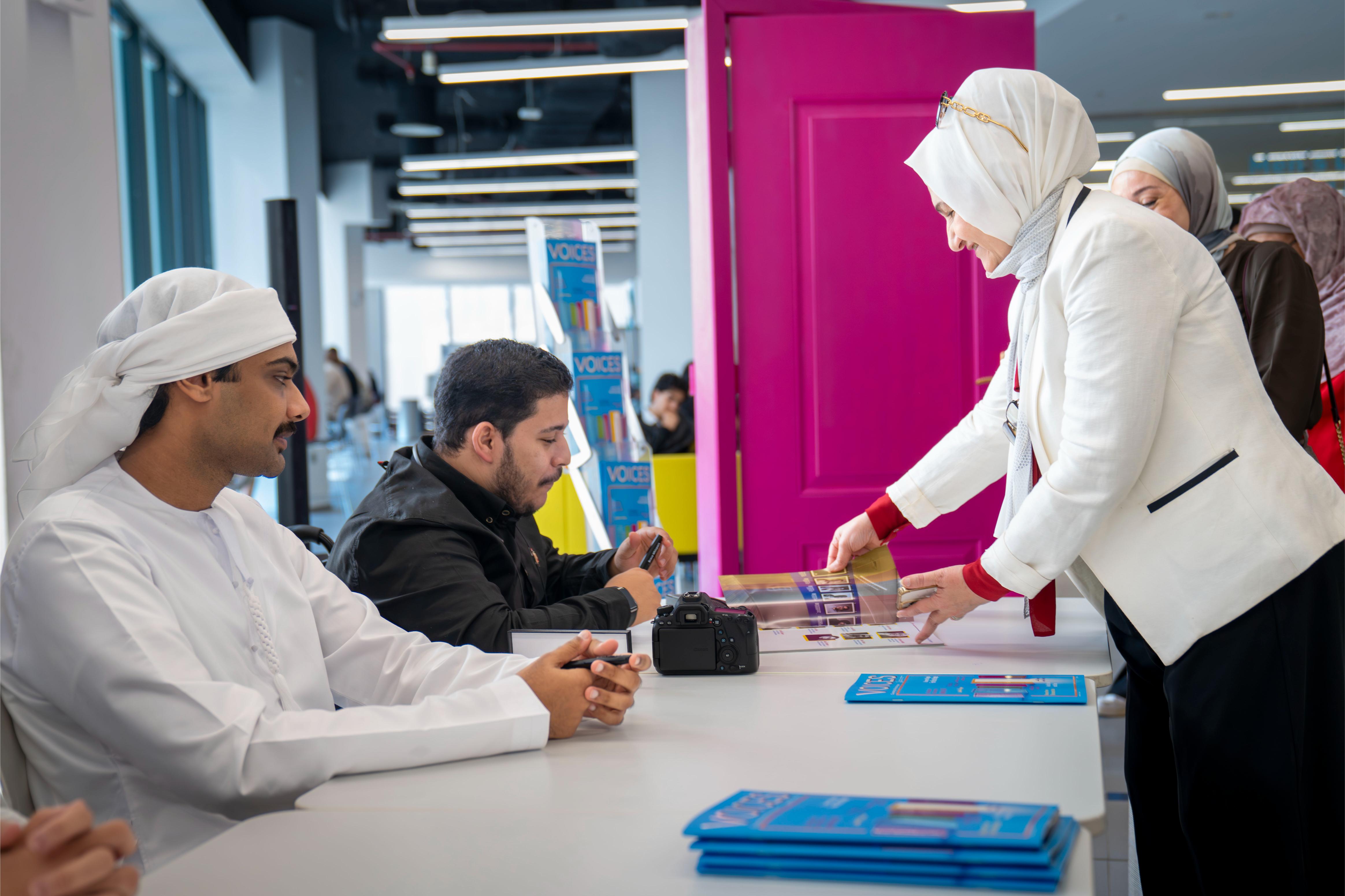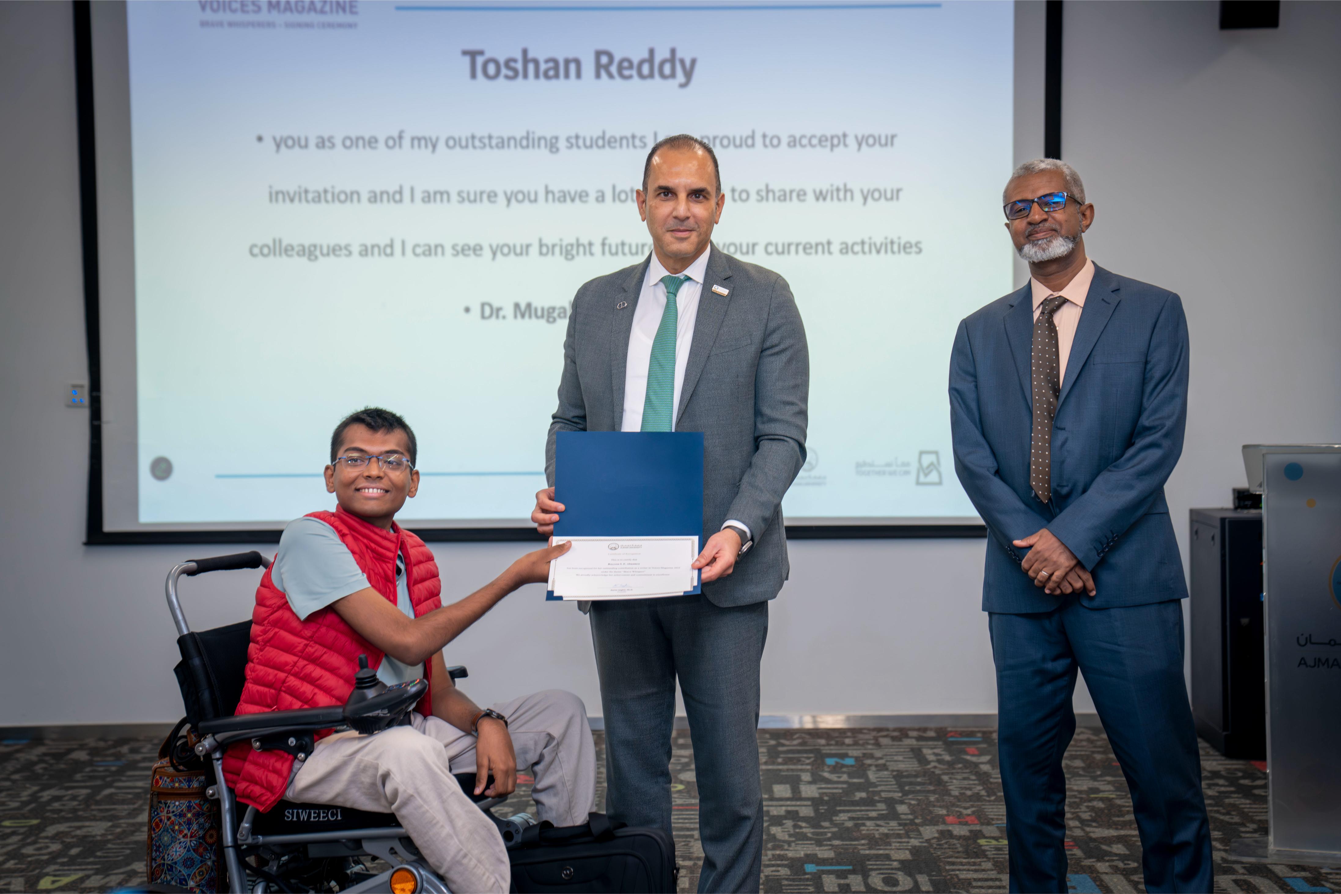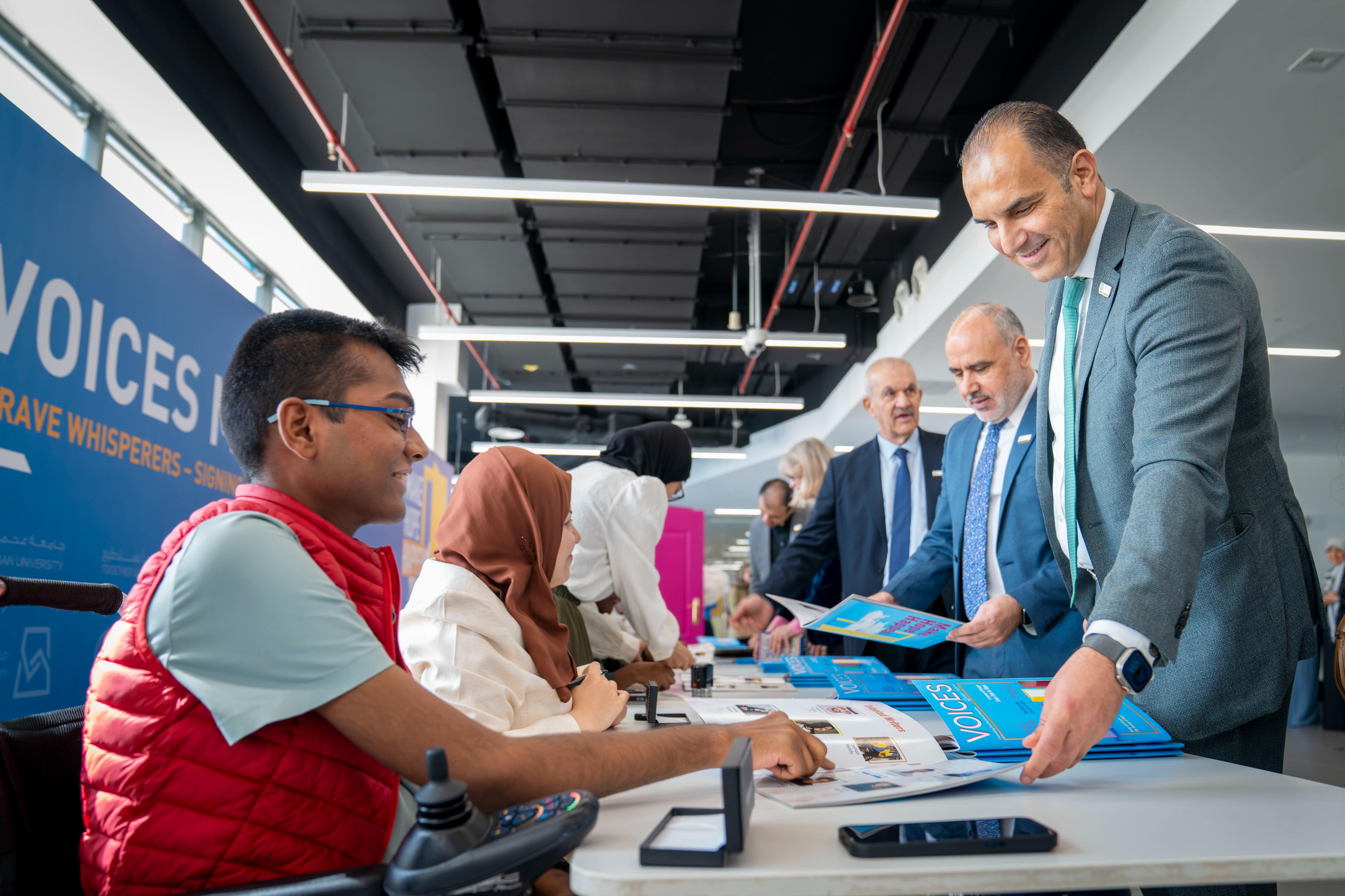 On October 29, 2025, Ajman University, through the Counseling Unit at the Deanship of Student Services, hosted the signing ceremony of the second edition of VOICES Magazine. This edition celebrates the courage and creativity of AU students of determination, who contributed inspiring and heartfelt stories embodying resilience, perseverance, and hope. The ceremony, attended by the Chancellor and VIP guests, honored the talented student authors and highlighted Ajman University’s commitment to inclusion, empowerment, and the celebration of diverse voices within its community.