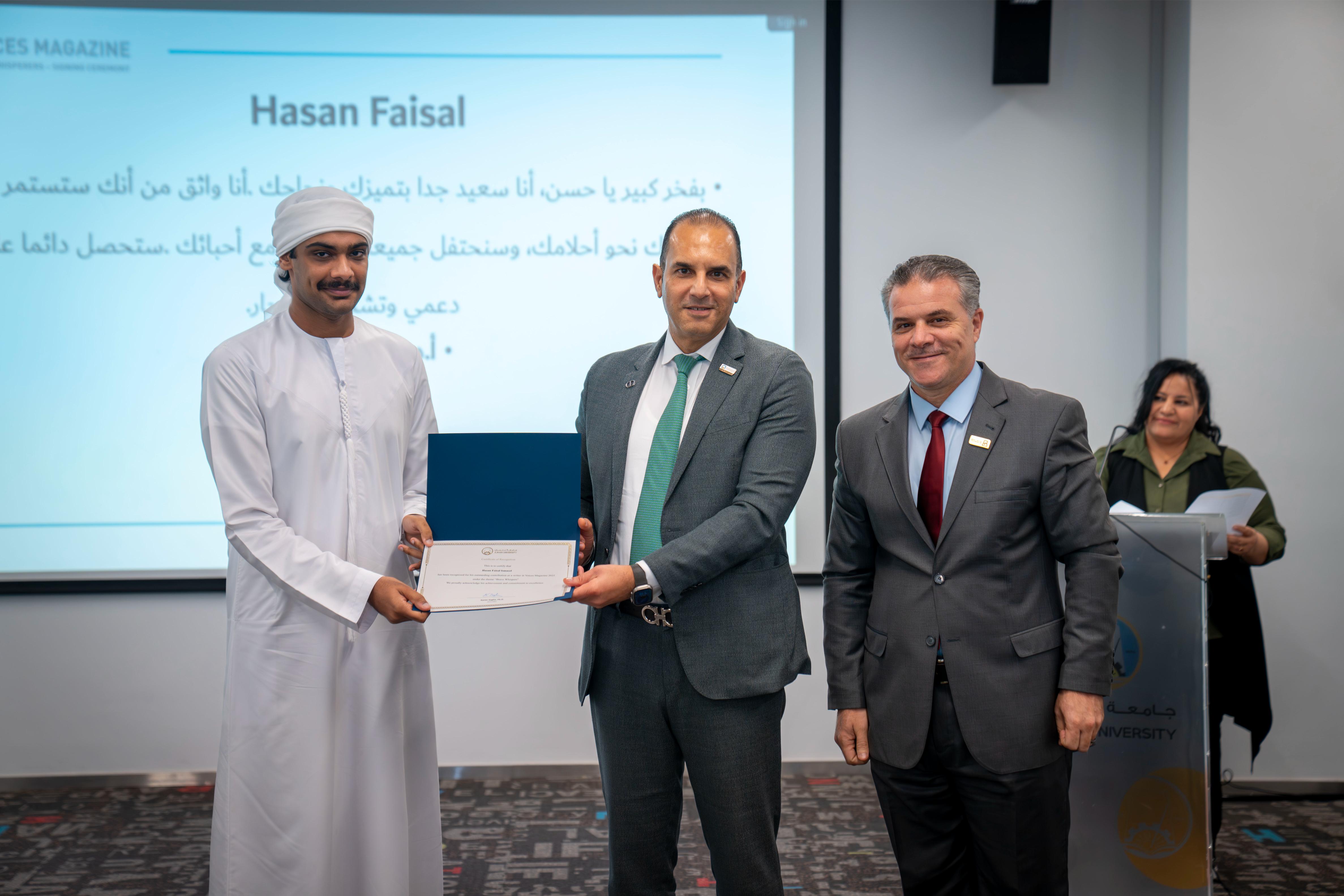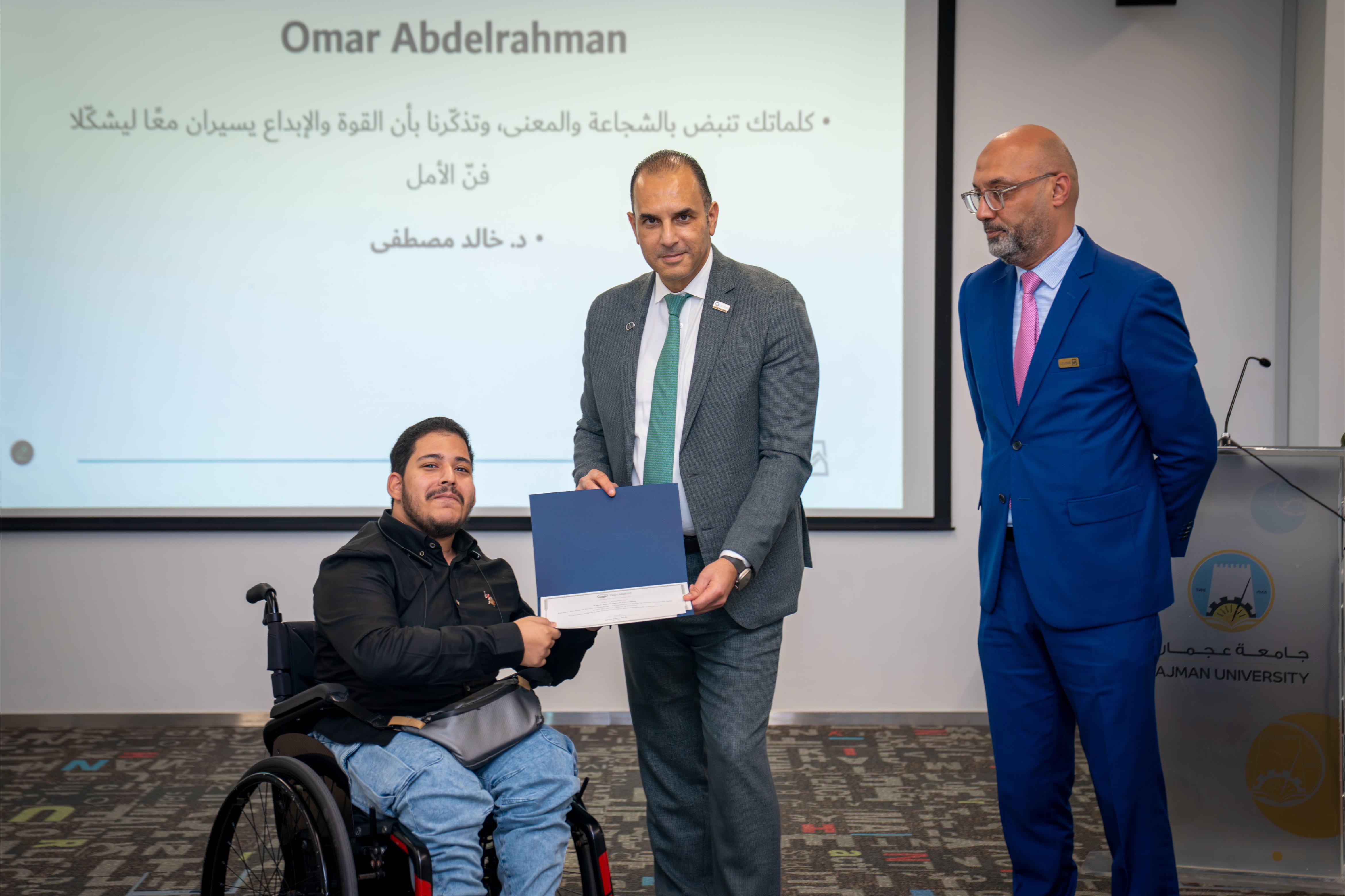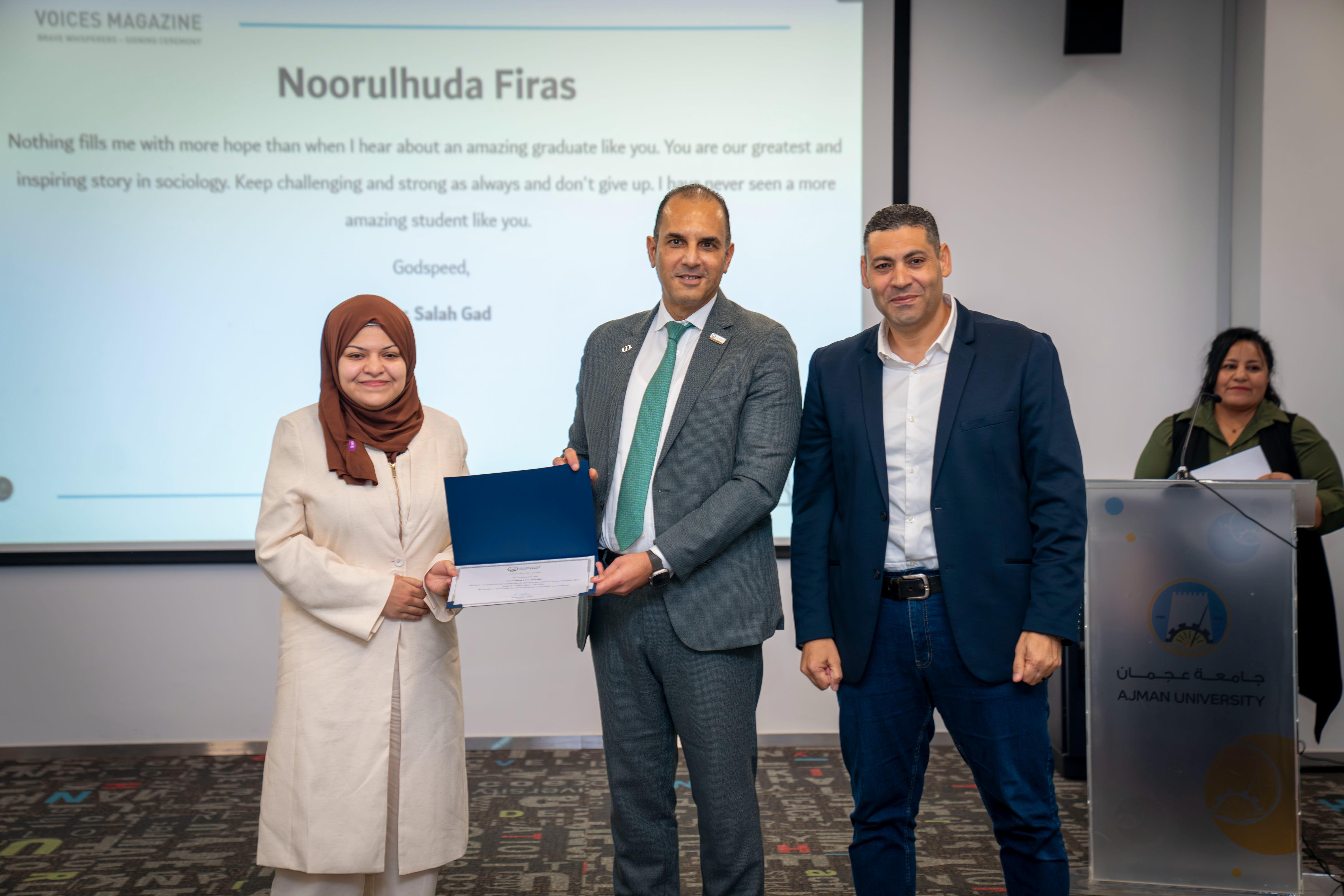 On October 29, 2025, Ajman University, through the Counseling Unit at the Deanship of Student Services, hosted the signing ceremony of the second edition of VOICES Magazine. This edition celebrates the courage and creativity of AU students of determination, who contributed inspiring and heartfelt stories embodying resilience, perseverance, and hope. The ceremony, attended by the Chancellor and VIP guests, honored the talented student authors and highlighted Ajman University’s commitment to inclusion, empowerment, and the celebration of diverse voices within its community.