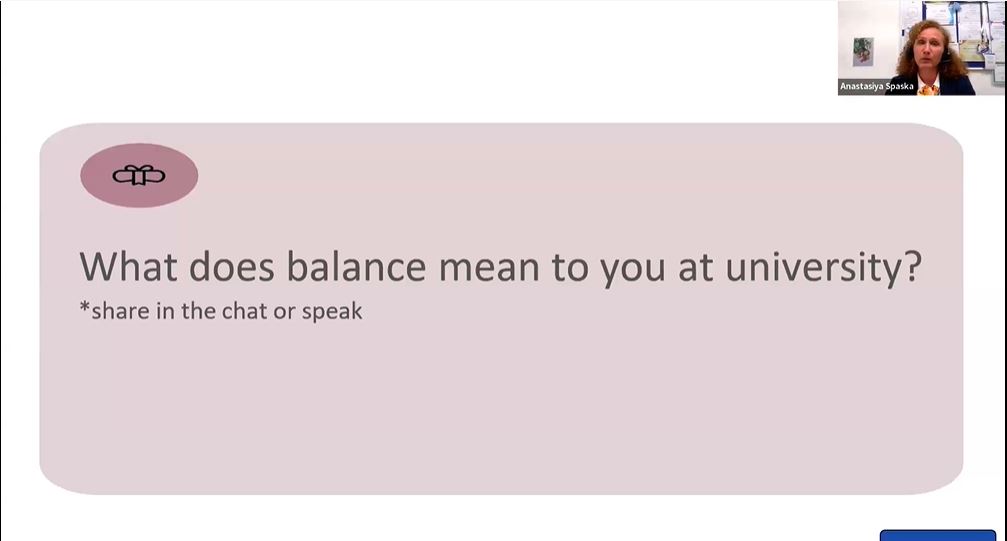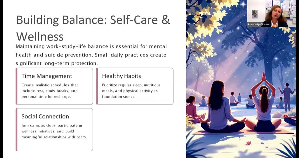 On September 30, 2025, the Counseling Unit organized an online webinar via Zoom, presented by Dr. Anastasiya Spaska, Associate Professor at the College of Medicine. The session focused on strategies for building hope and maintaining balance in both work and study environments. Dr. Spaska provided practical guidance on managing stress, fostering resilience, and adopting a balanced approach to academic and professional responsibilities, empowering participants to enhance their well-being and productivity.