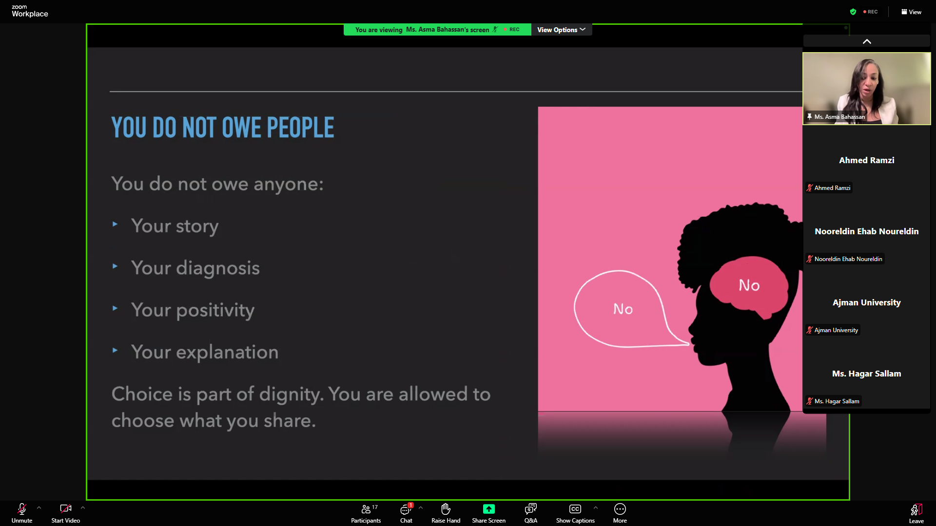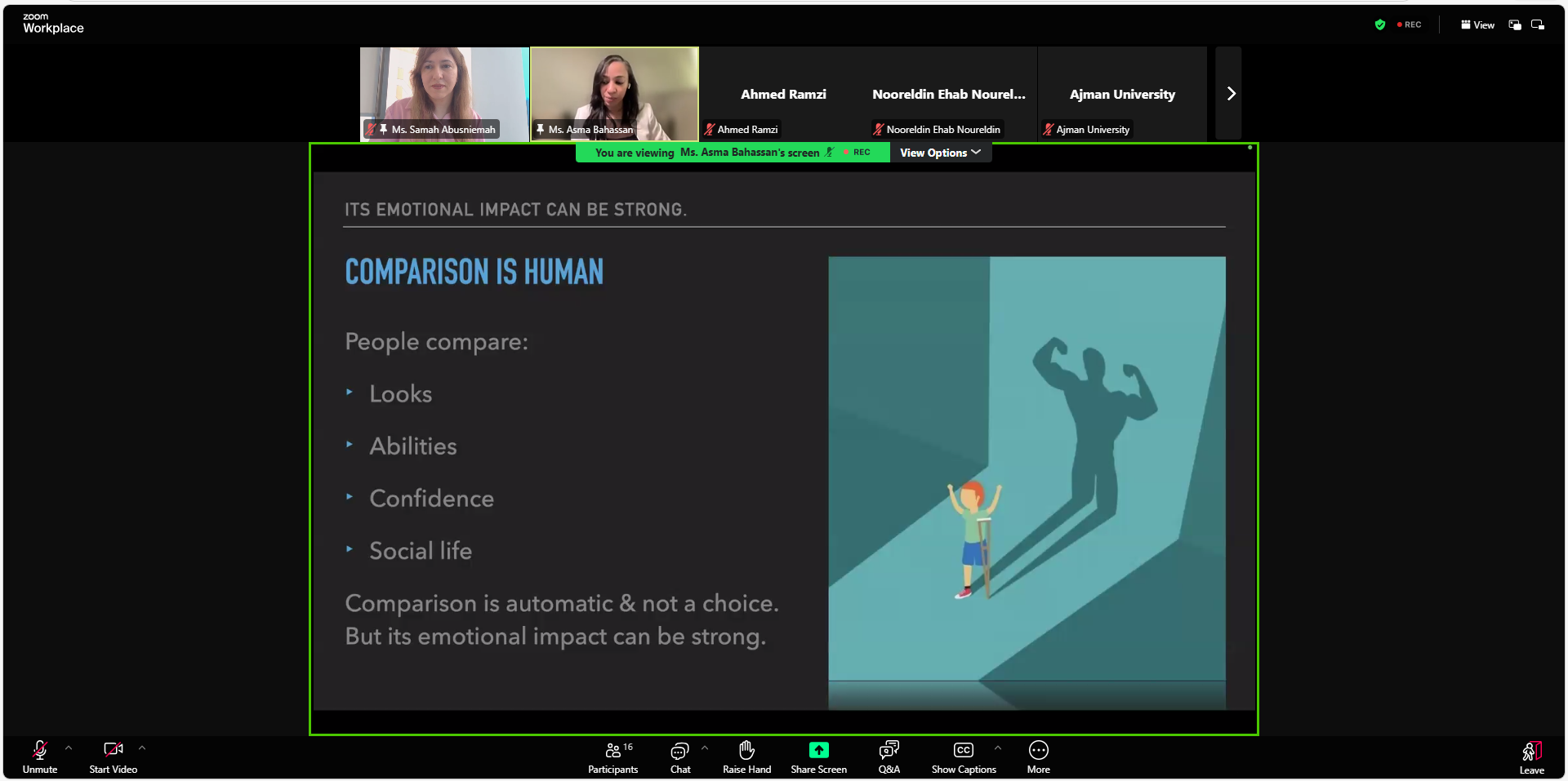 How do beauty standards shape the way you see yourself? In this webinar, organized by the Center for Inclusive Learning in collaboration with the Ajman University Women Empowerment Council on April 13, 2026, students explored the impact of body shaming and unrealistic expectations on confidence and mental well-being. The session was delivered by Asma Bahassan, Strategic Marketing Leader and AU alumna, and moderated by Samah Abusniemeh, Psychological Counselor. It also introduced Body Dysmorphic Disorder, offering insight into how it can affect daily life and self-perception.