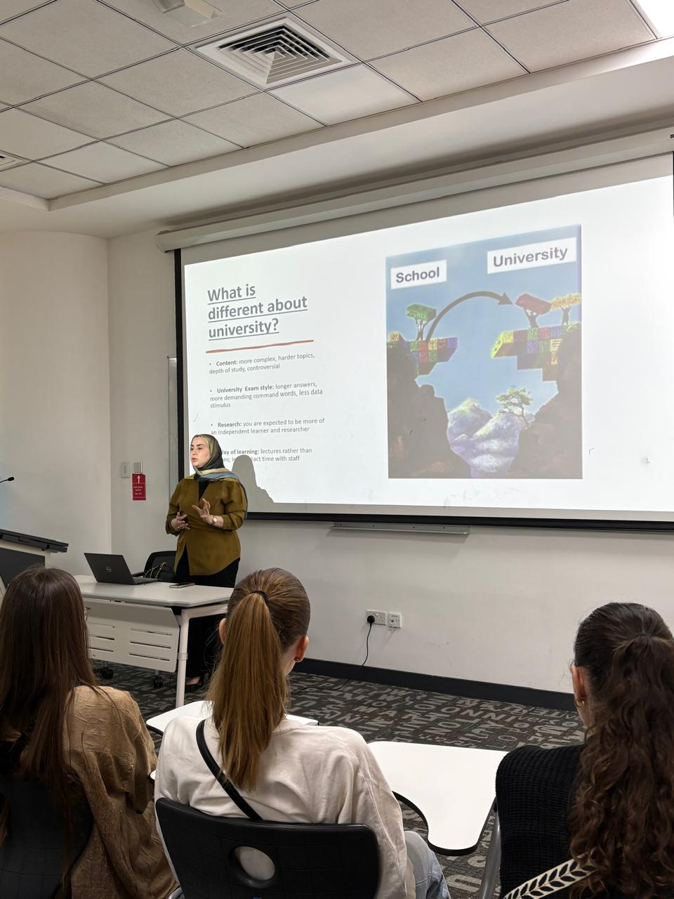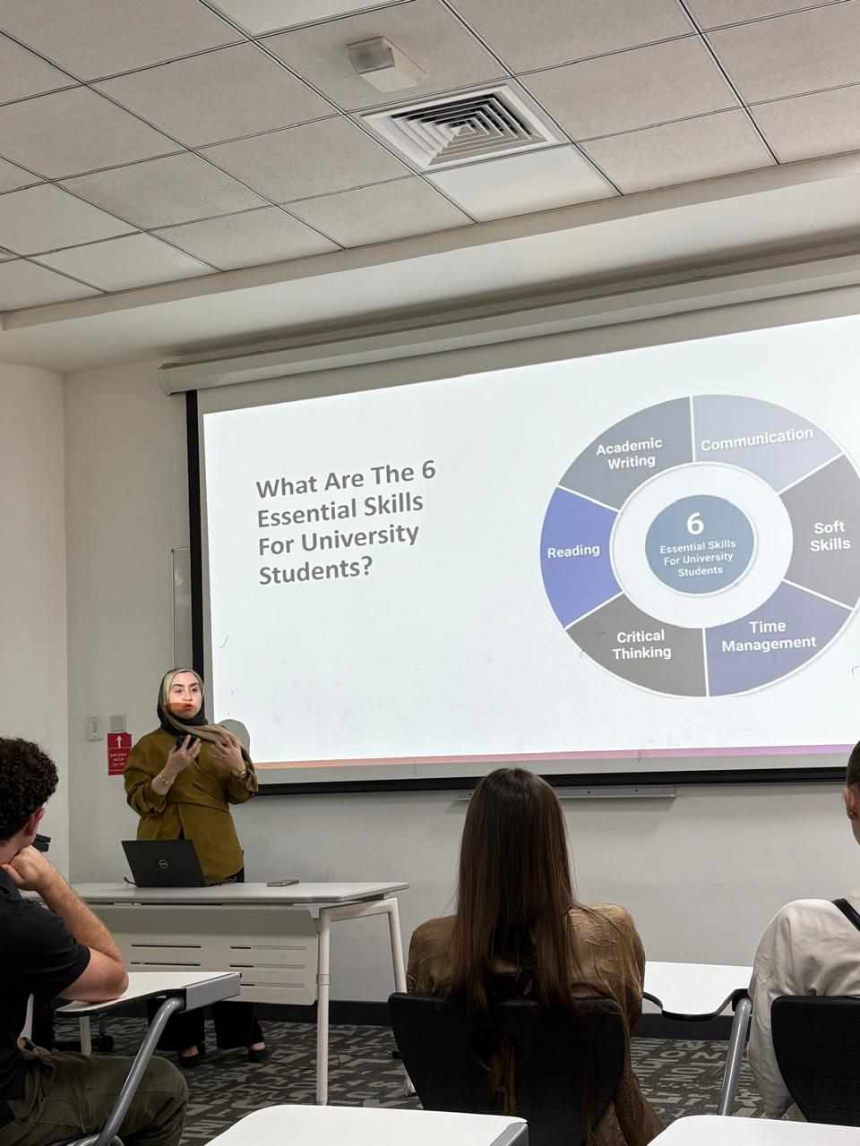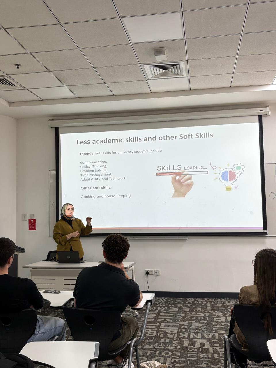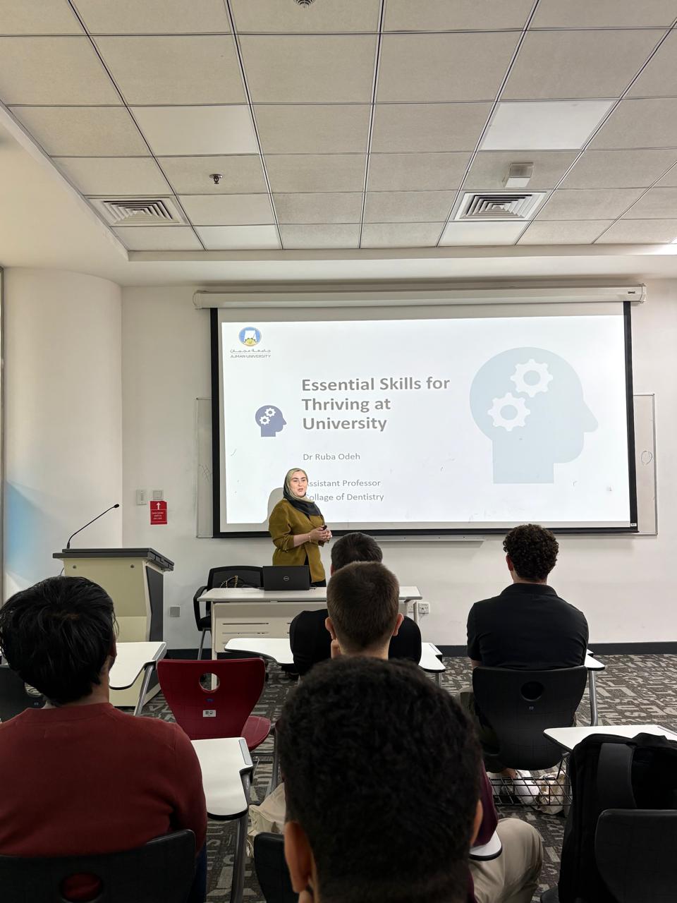 As part of Orientation Week, the Counseling Unit organized an interactive workshop titled: “Essential Skills for Thriving at University” on January 12, 2026, delivered by Dr. Ruba Odeh, assistant professor, College of Dentistry. The workshop focused on equipping students with key skills needed to succeed in university life, including effective time management, academic adaptability, and personal resilience. Dr. Odeh highlighted practical approaches to navigating academic demands, building confidence, and adjusting to a new learning environment. Participants gained valuable insights and practical tools that supported a smooth transition into university life and enhanced their overall academic experience at Ajman University.